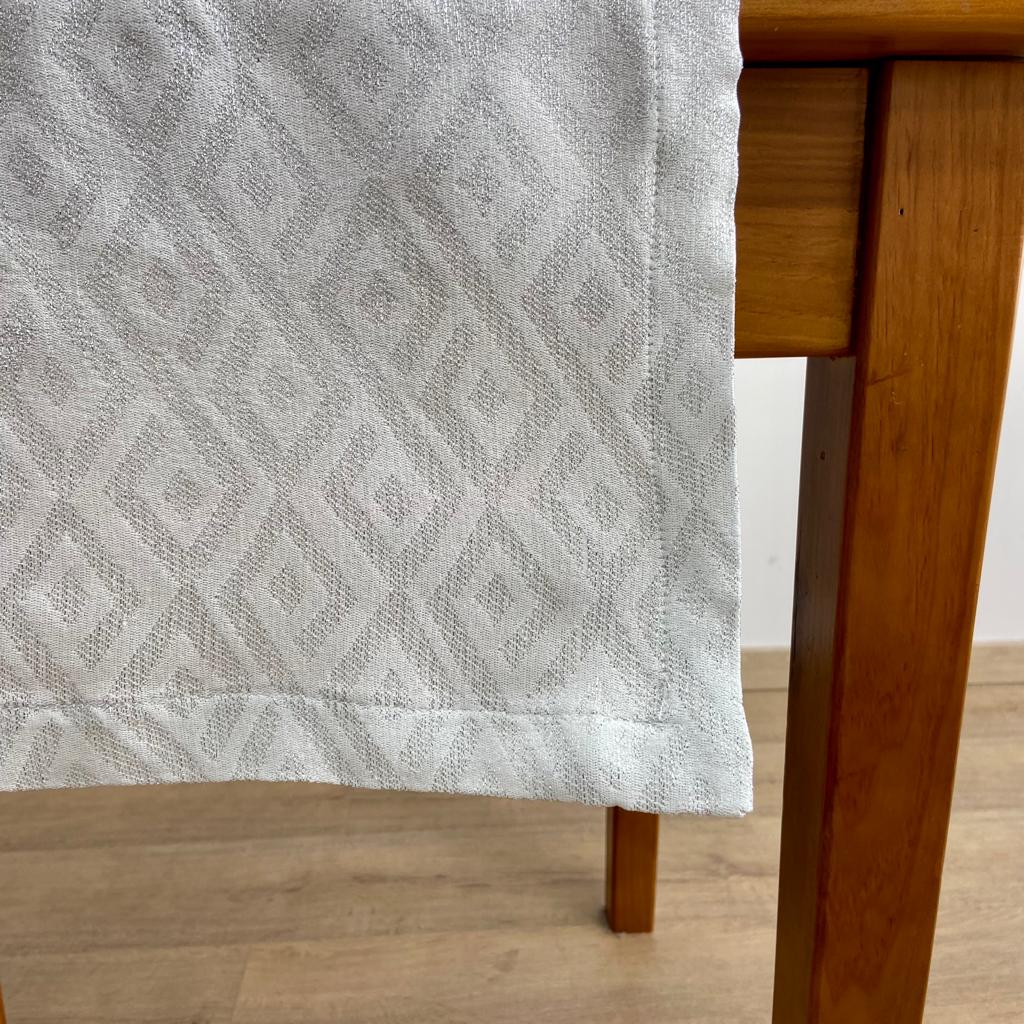 Caminho de mesa prateado, com tom de cor brilhante. Acabamento bainha inglesa.