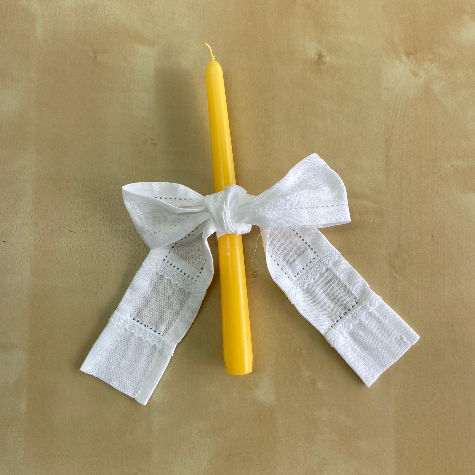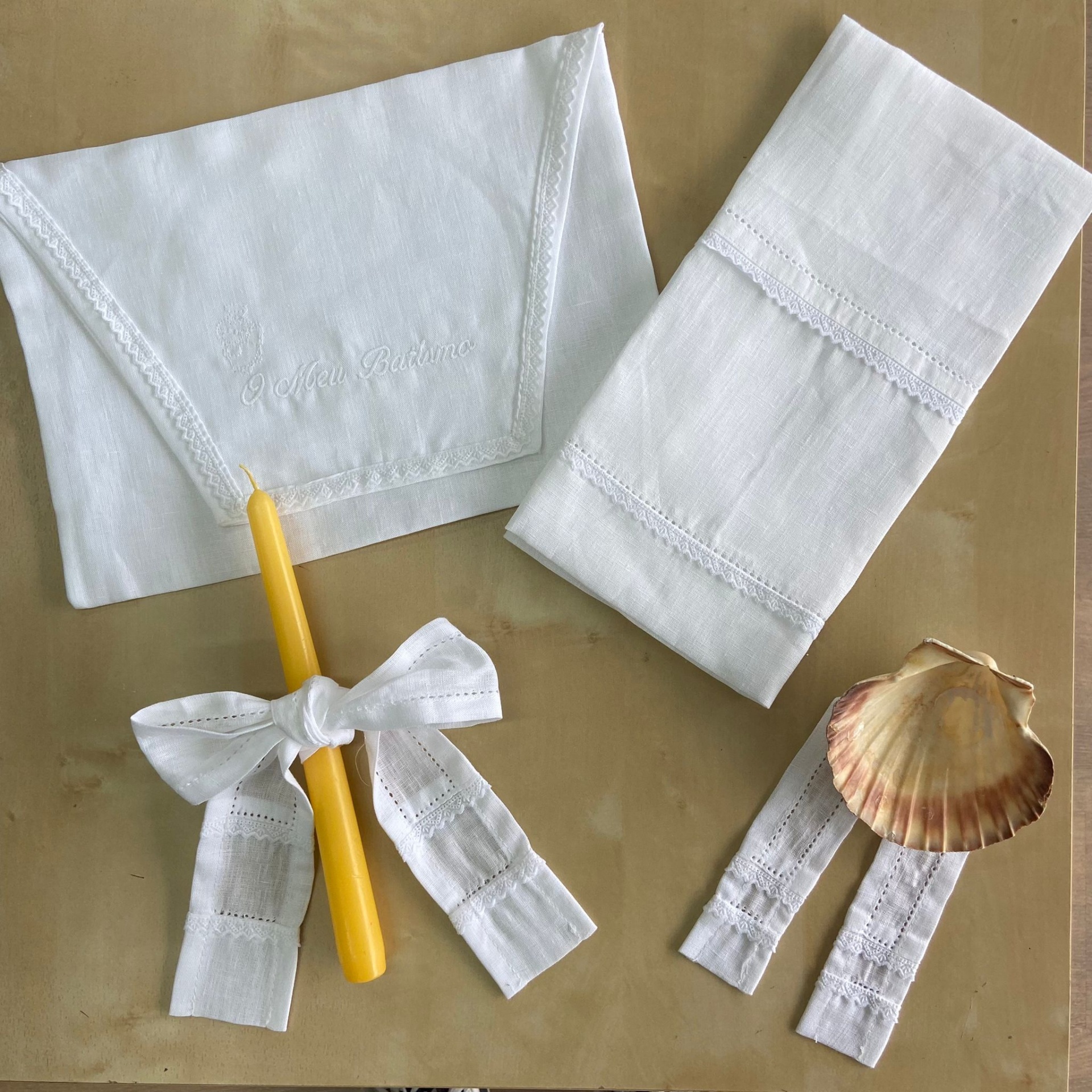 Composto por toalha, laço para vela, laço para concha e bolsa com efeito envelope para guardar o conjunto.