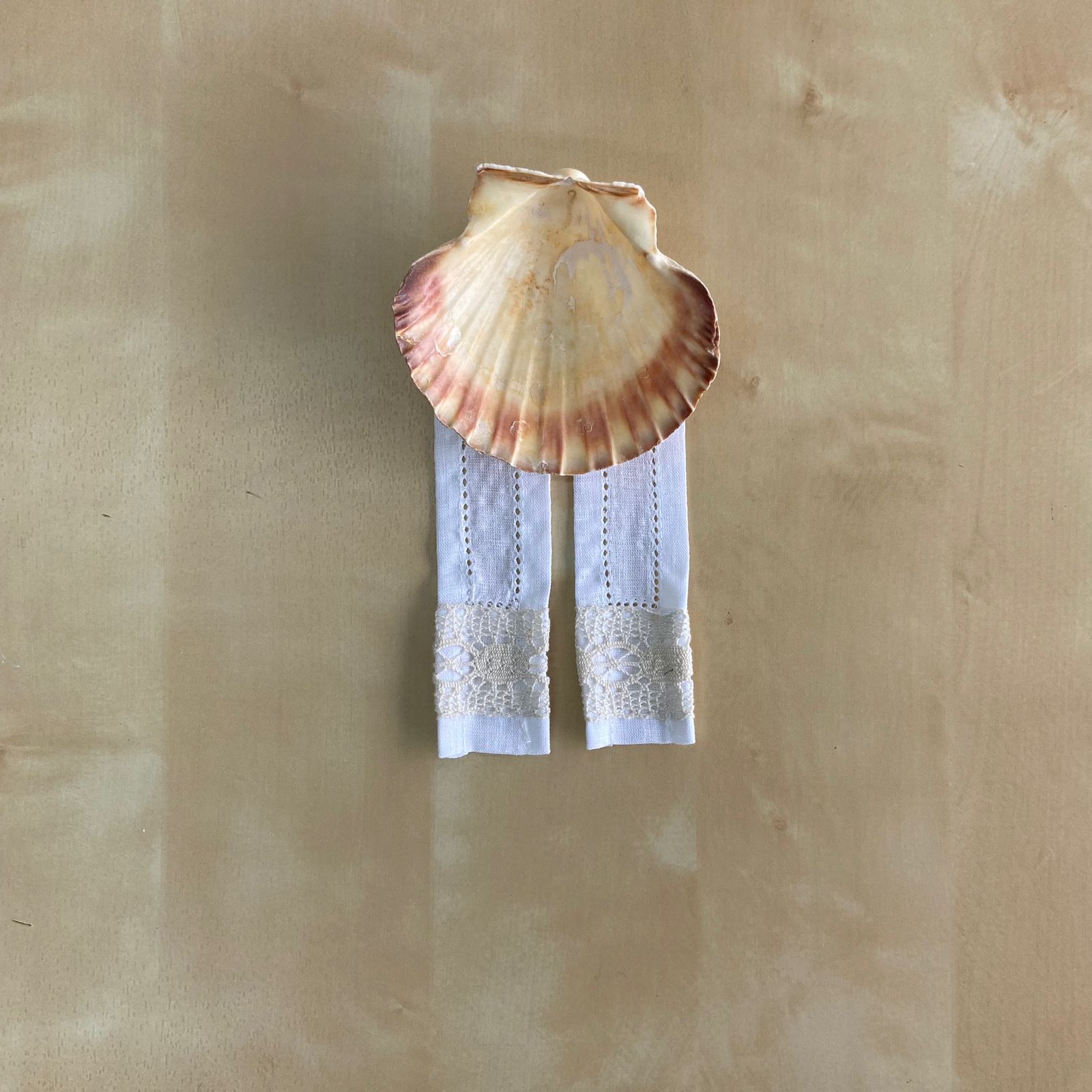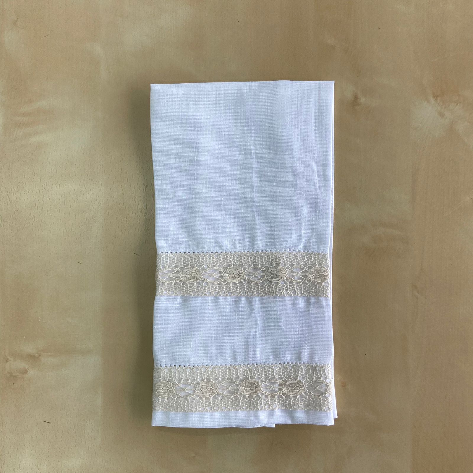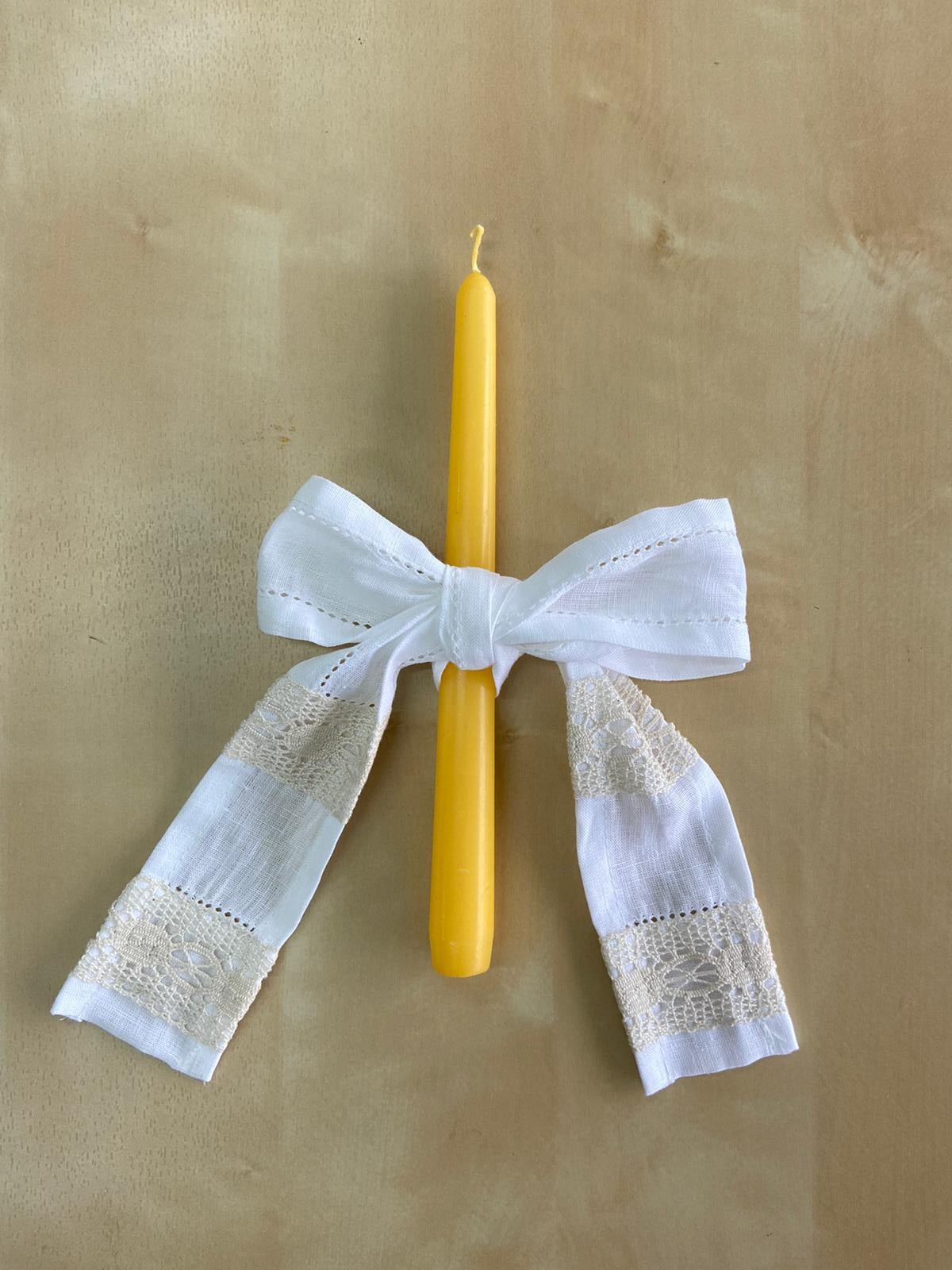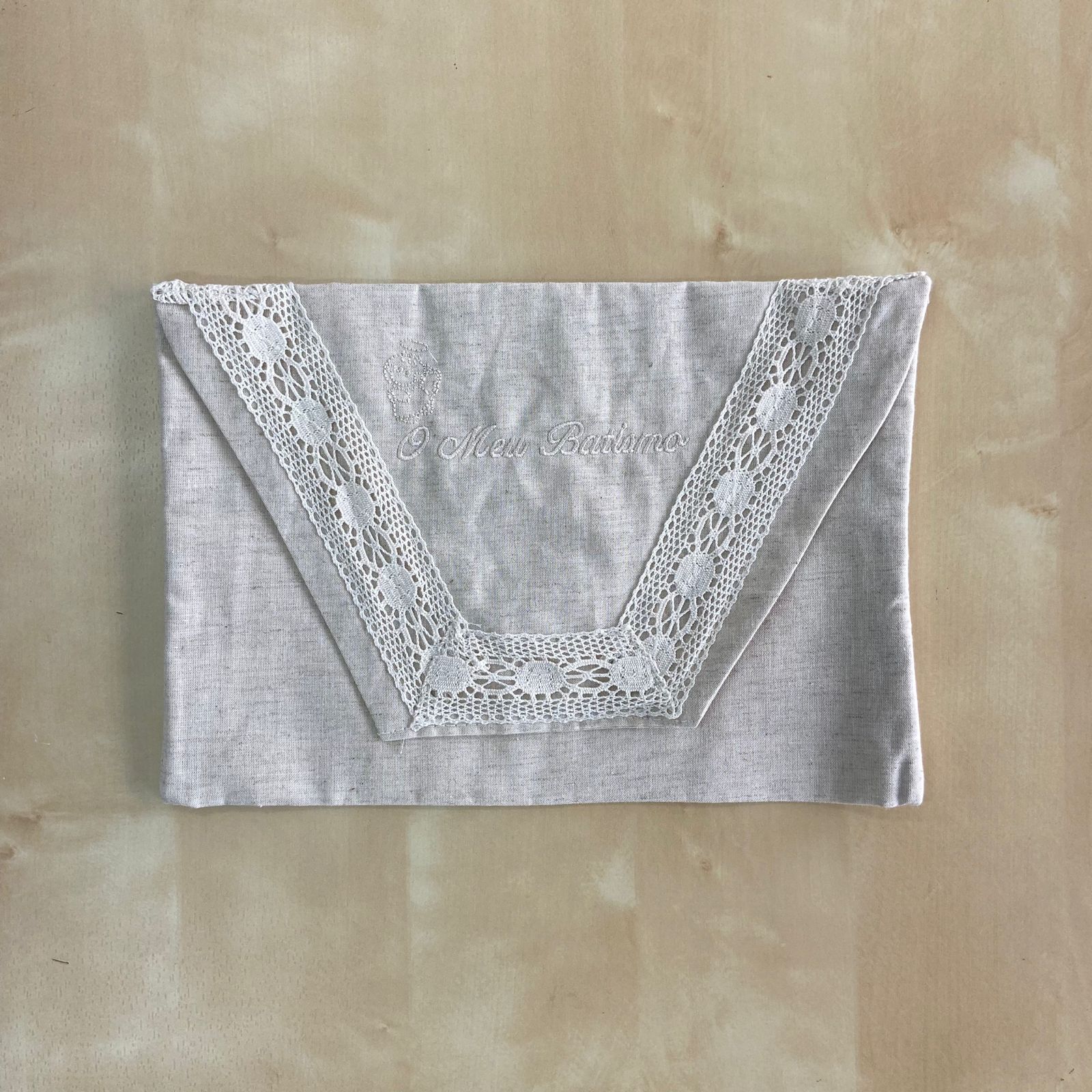 Composto por toalha, fita para laço da vela, fita para laço da concha e saco em forma de envelope bordado para guardar o conjunto. Modelo em linho com detalhe de renda e bordado.