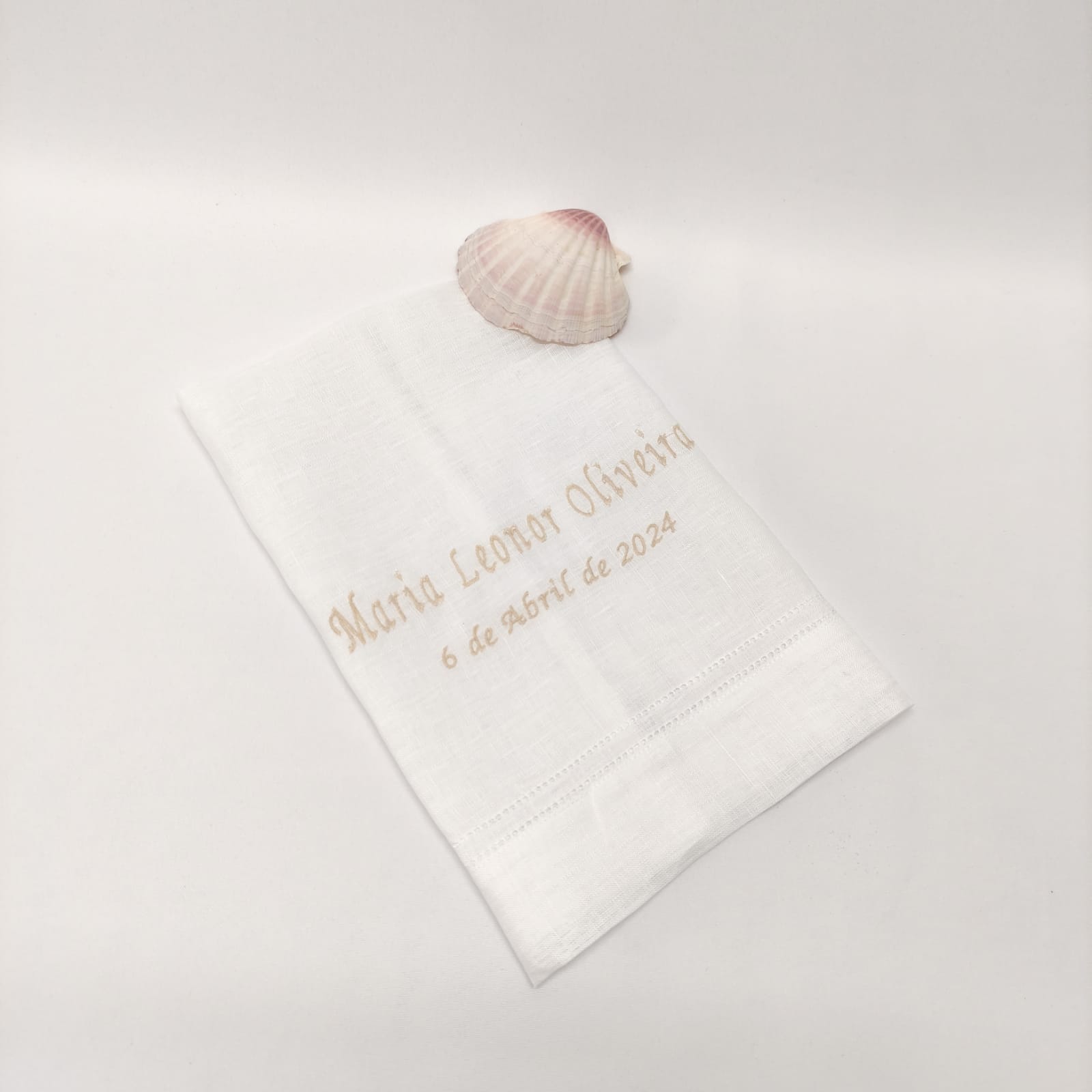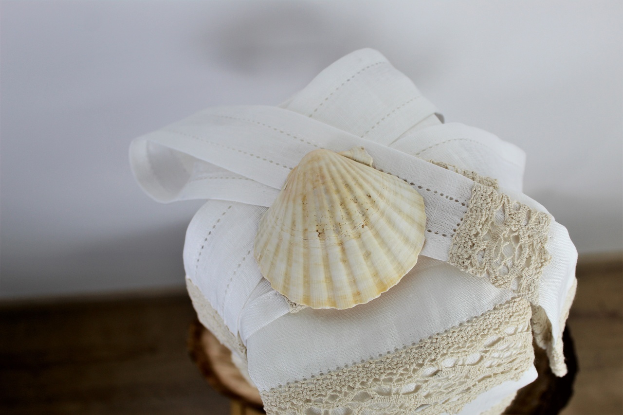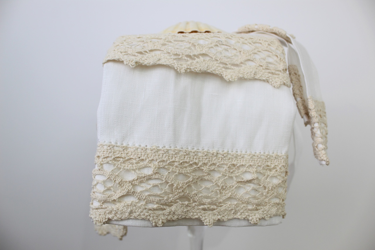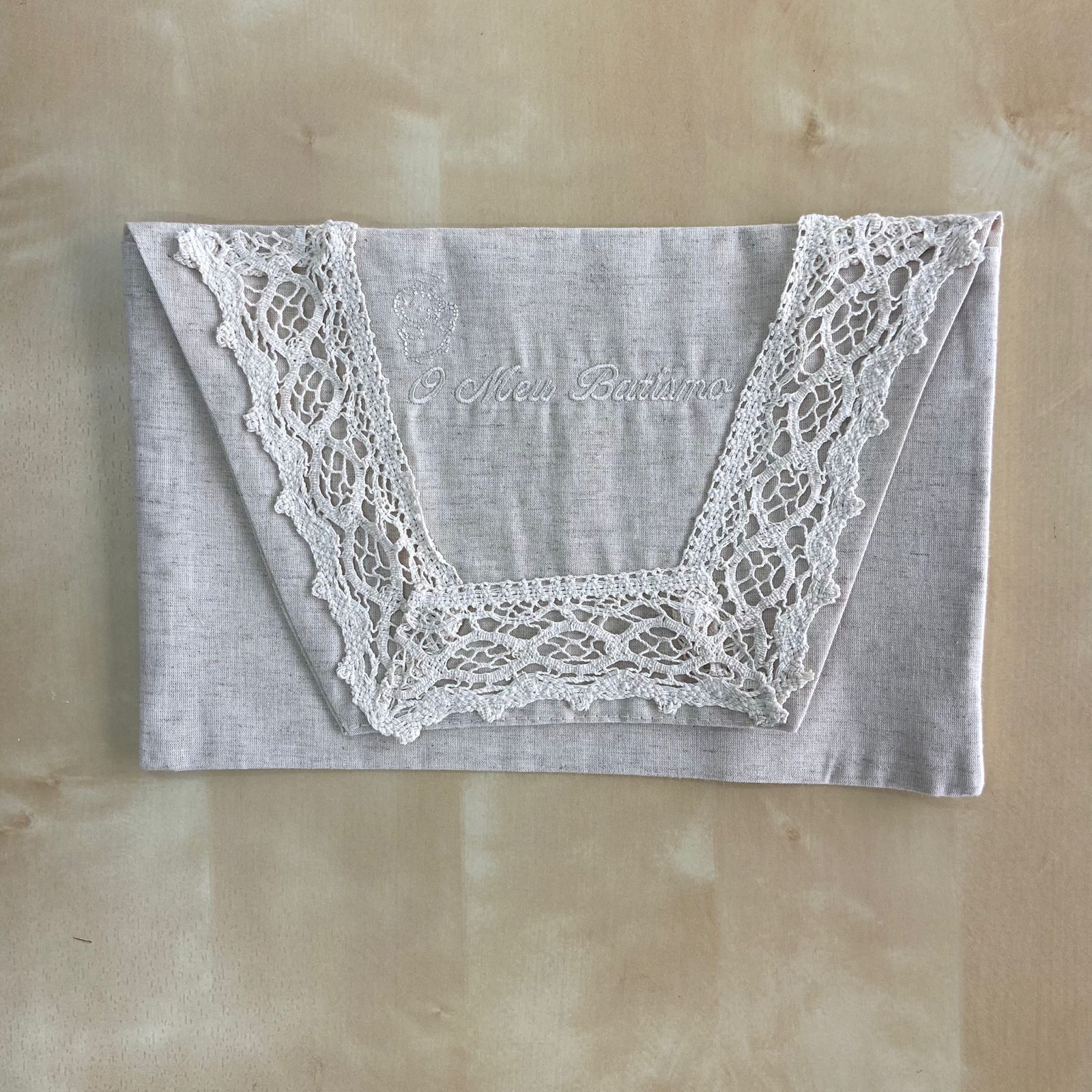 Composto por toalha, fita para laço da vela, fita para laço da concha e saco em forma de envelope bordado para guardar o conjunto. Modelo em linho com detalhe de renda e bordado.