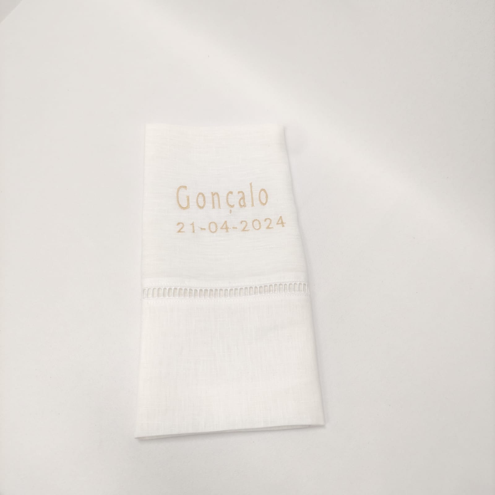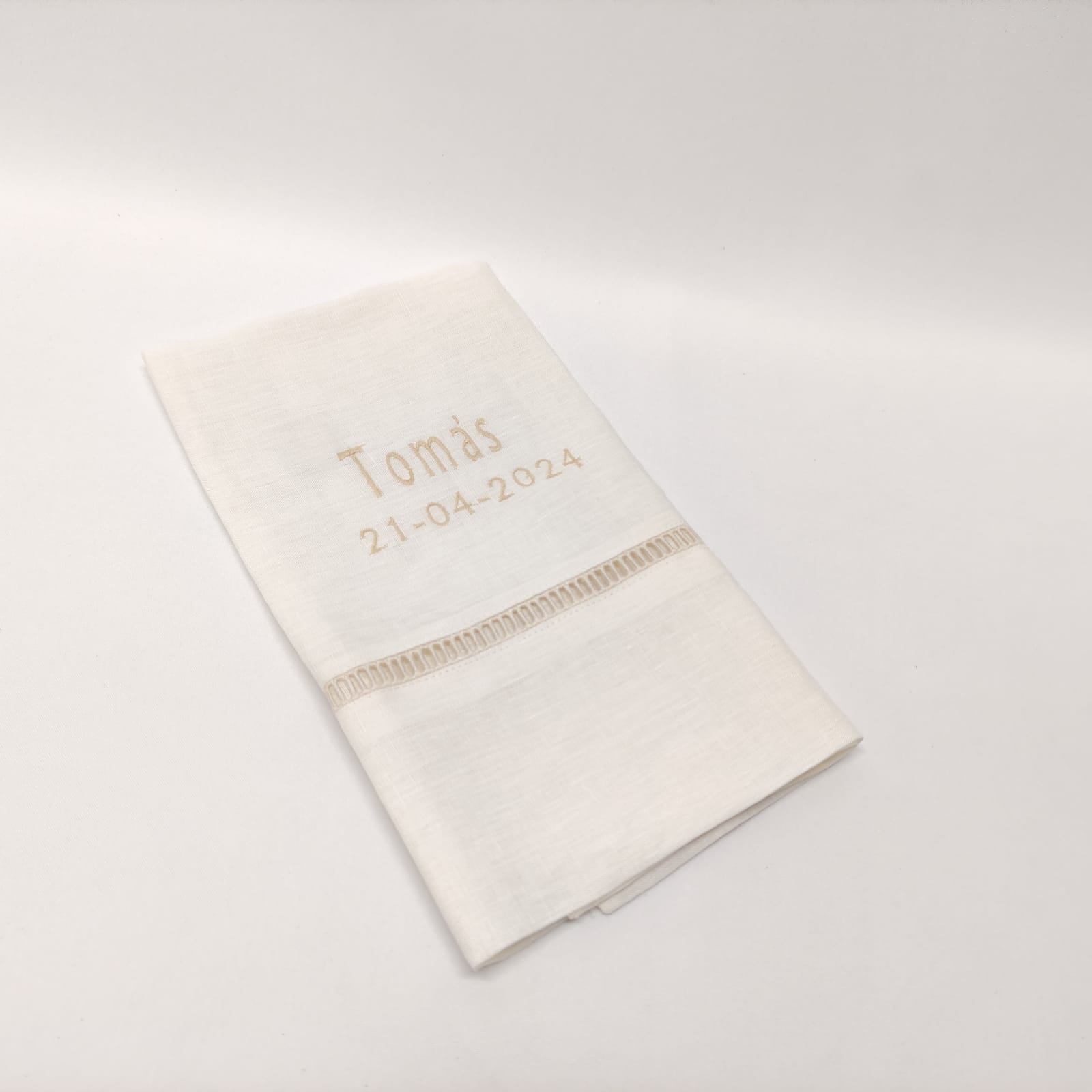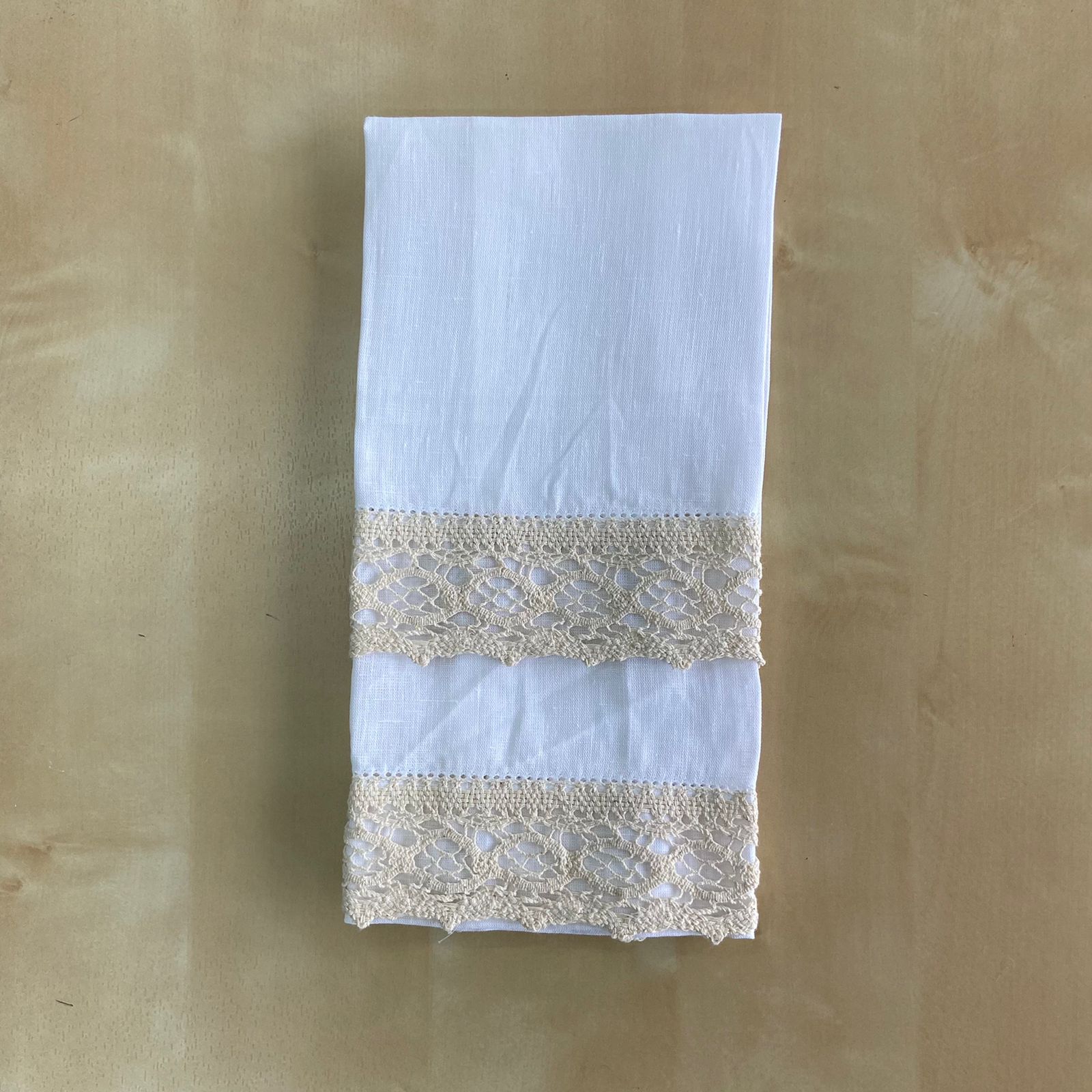 Composto por toalha, fita para laço da vela, fita para laço da concha e saco em forma de envelope bordado para guardar o conjunto. Modelo em linho com detalhe de renda e bordado.