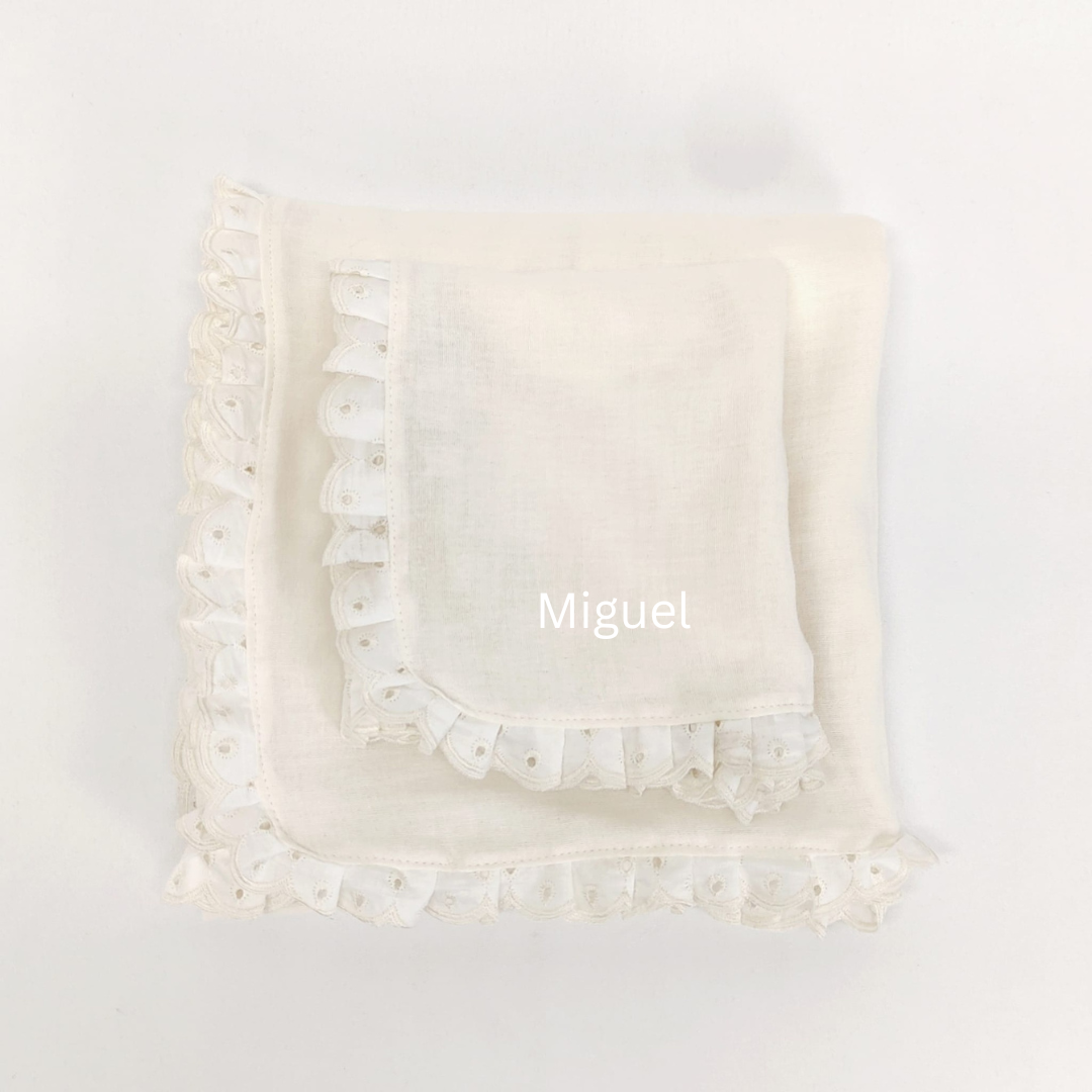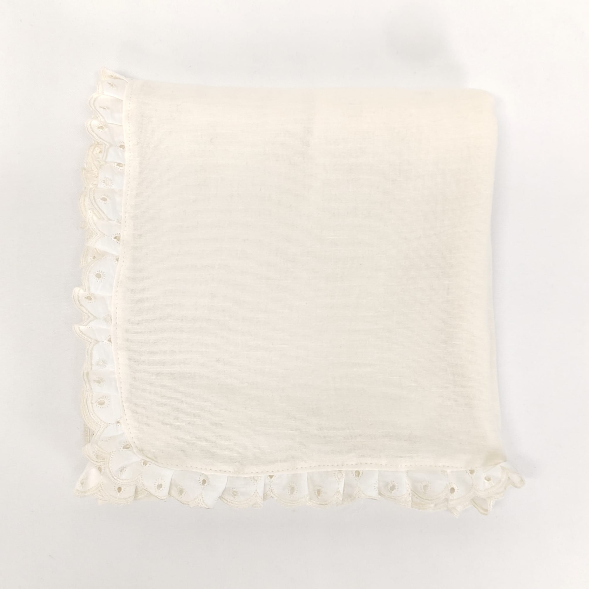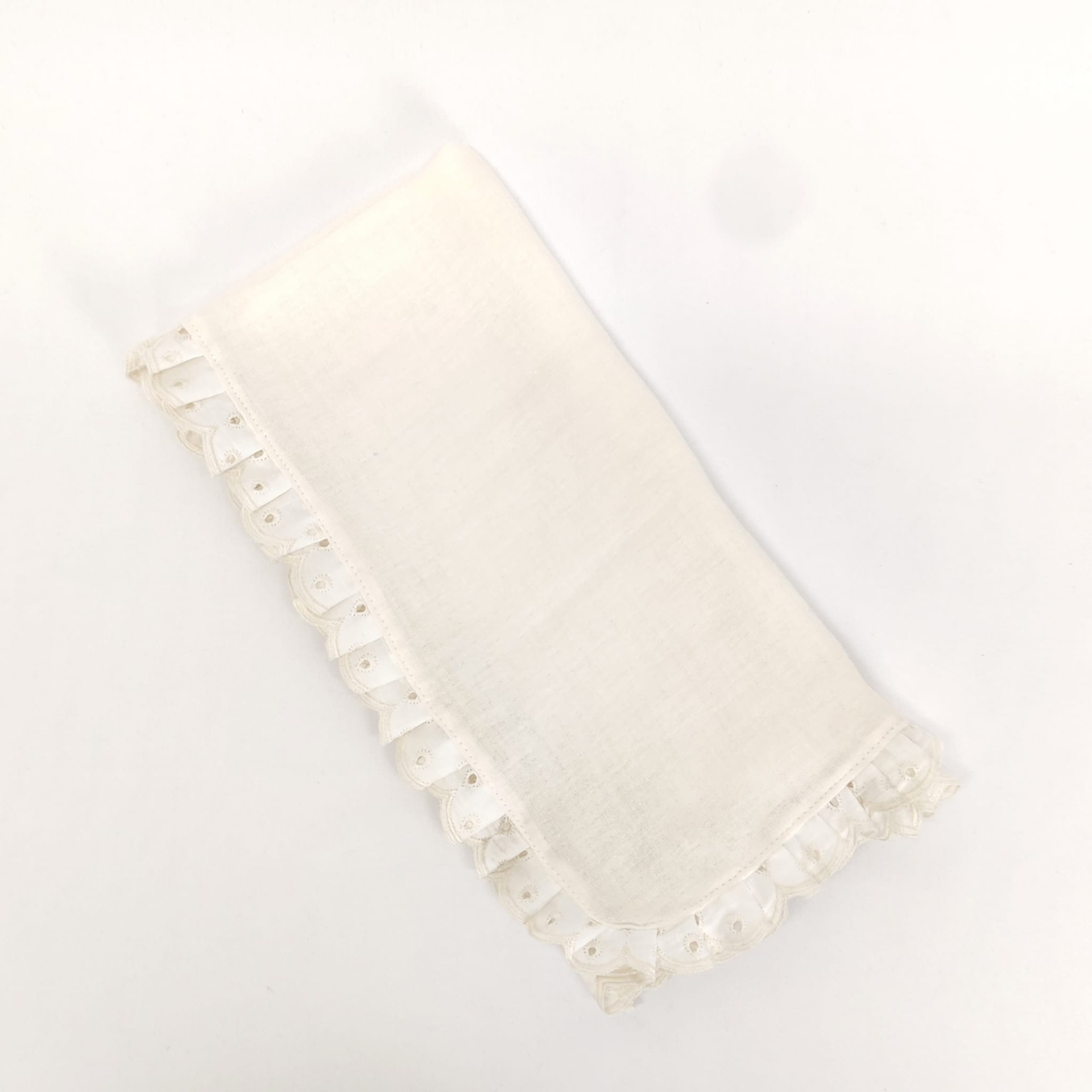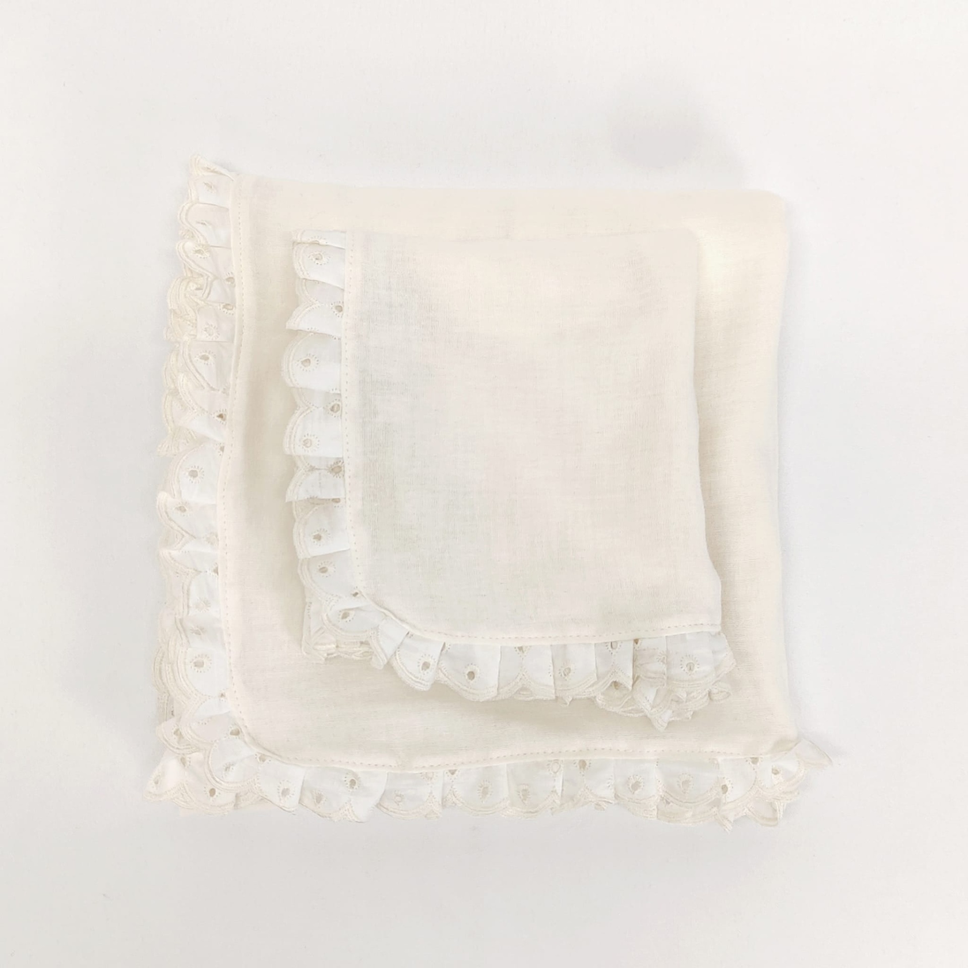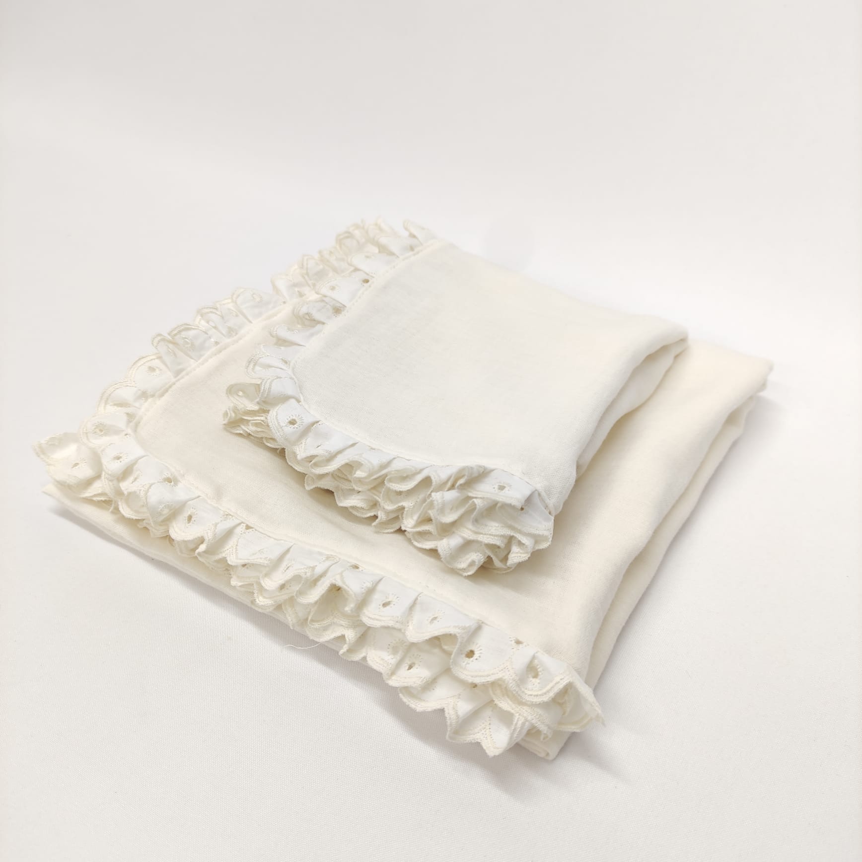 Coleção em musselina de algodão bege com acabamento em renda bege.