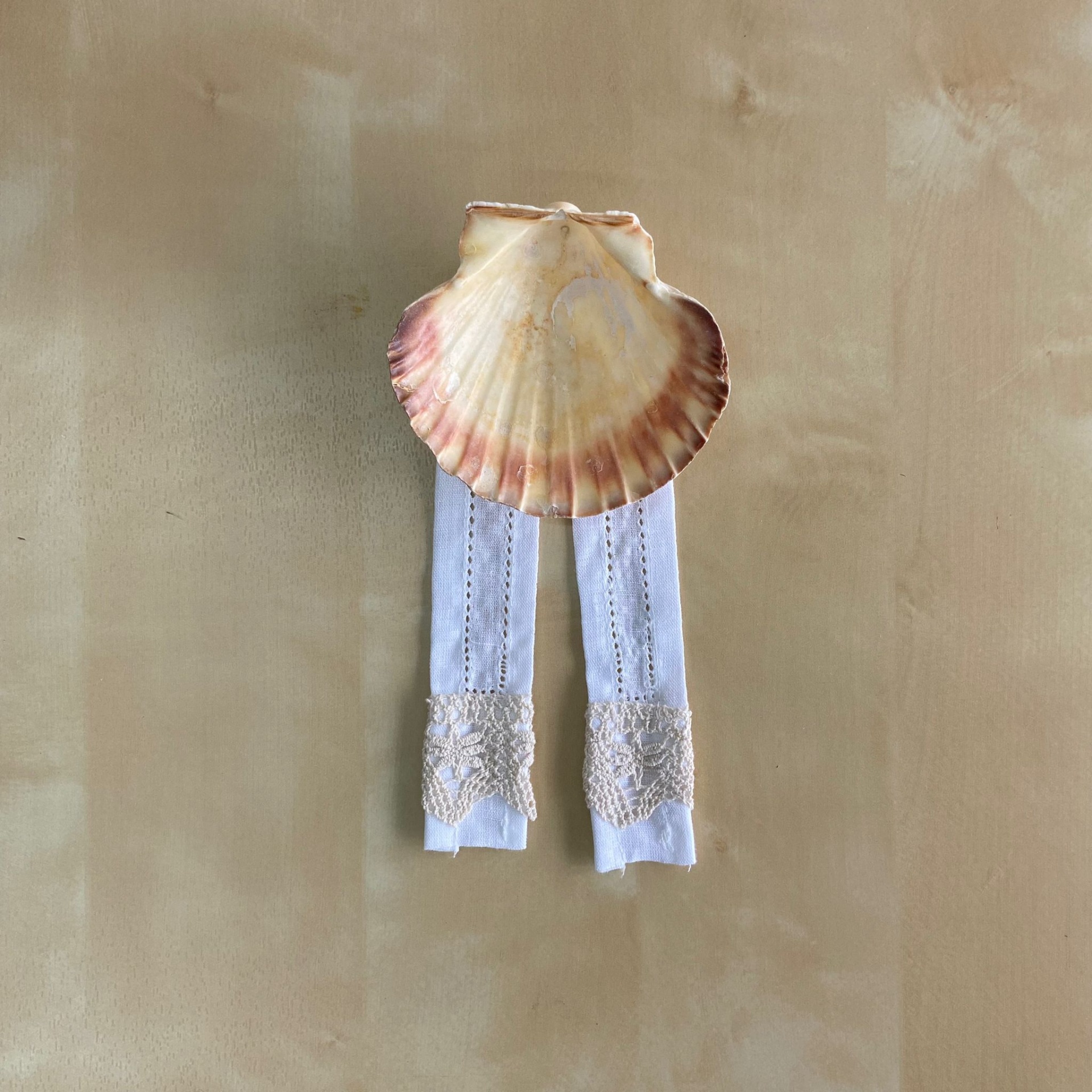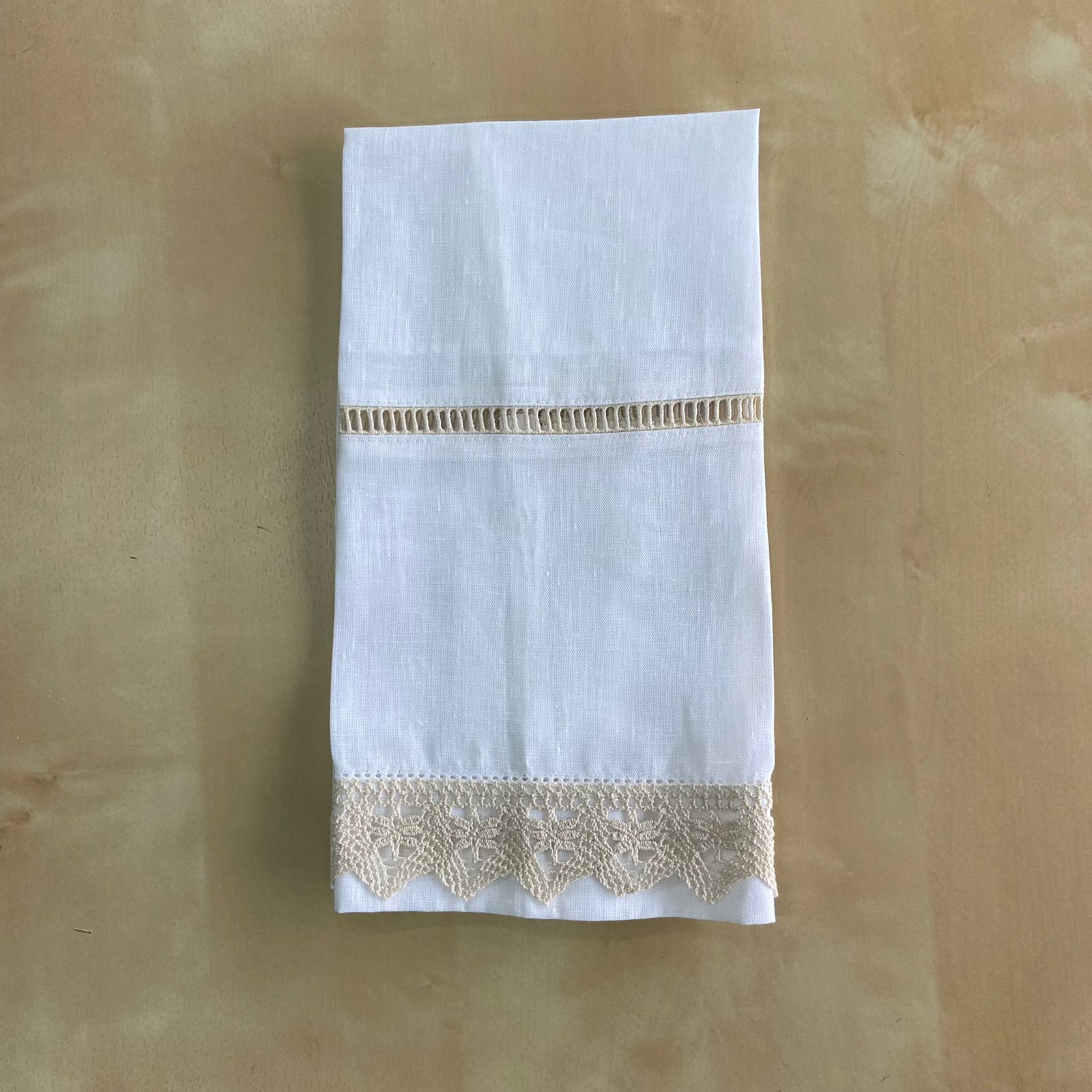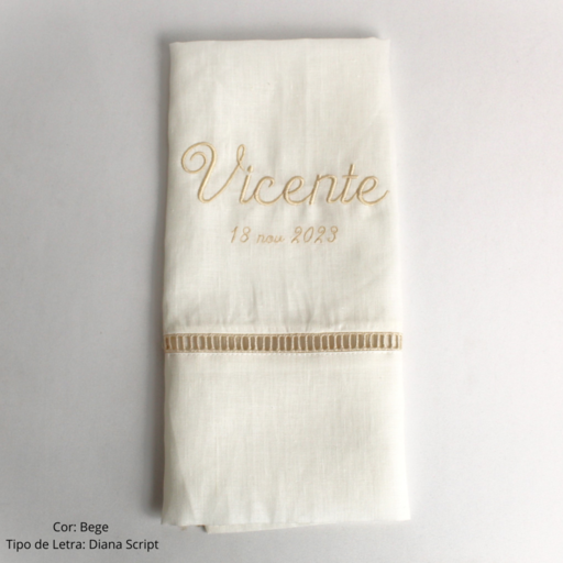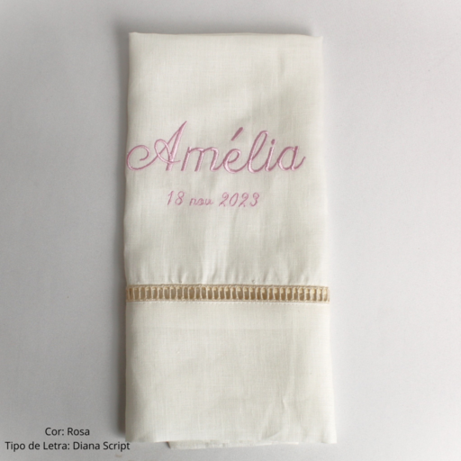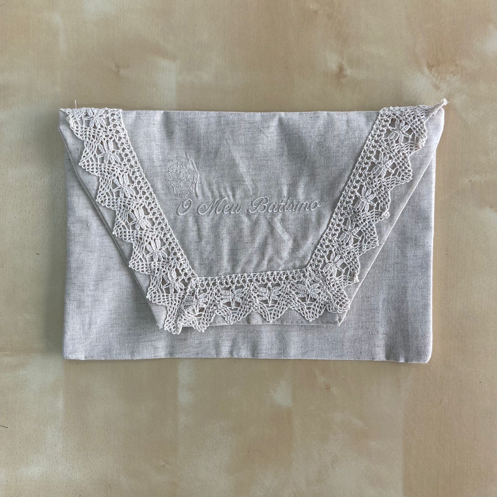Composto por toalha, fita para laço da vela, fita para laço da concha e saco em forma de envelope bordado para guardar o conjunto. Modelo em linho com detalhe de renda e bordado.