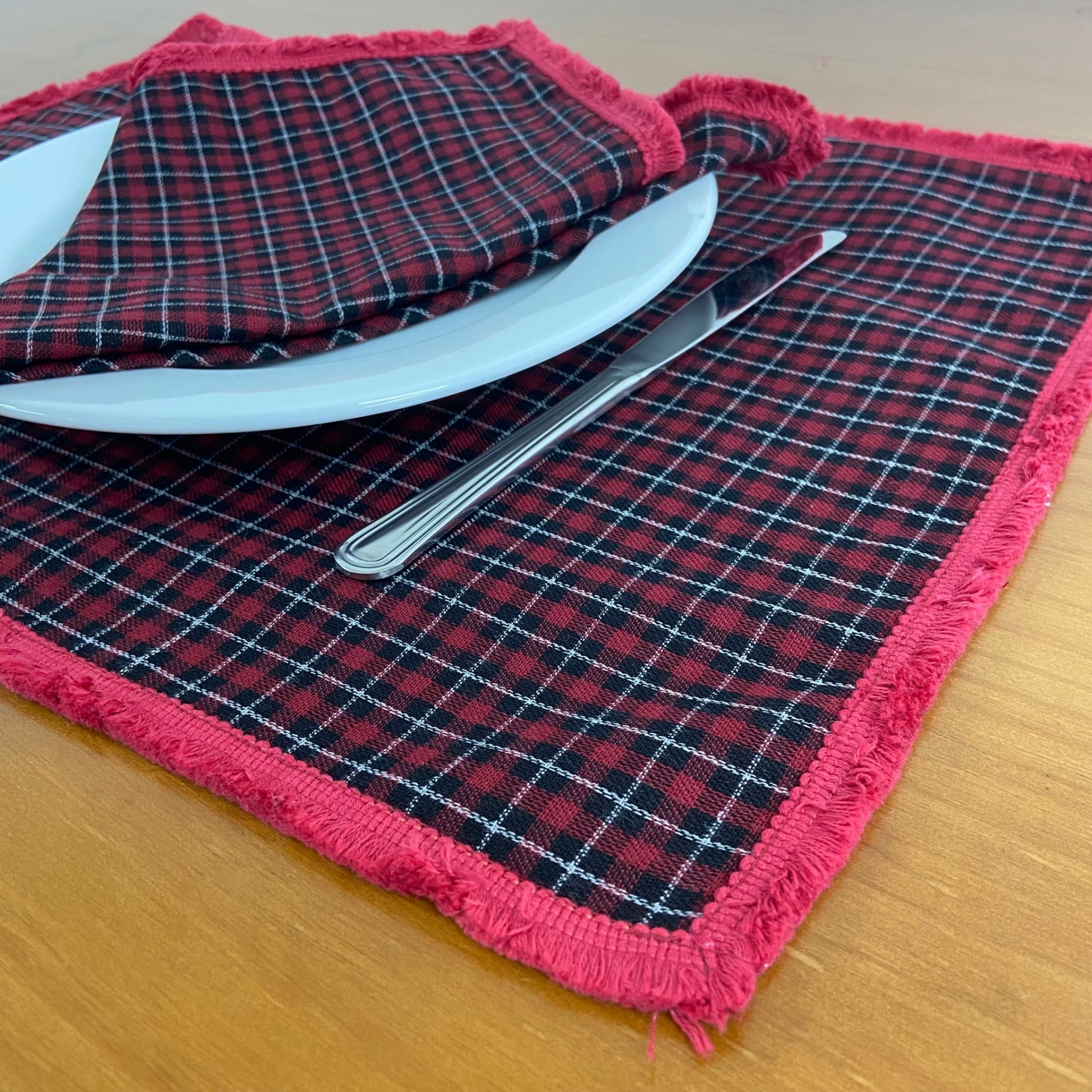 Coleção Natalicia, disponivel vários artigos. Tecido padrão xadrez , com aplicação de renda no acabamento do tecido.