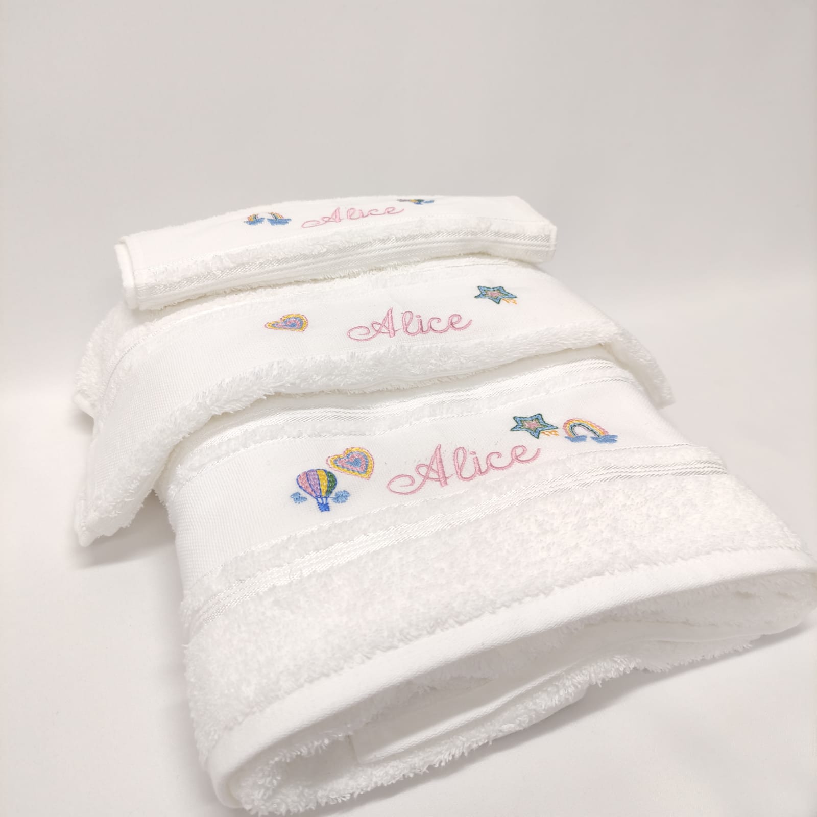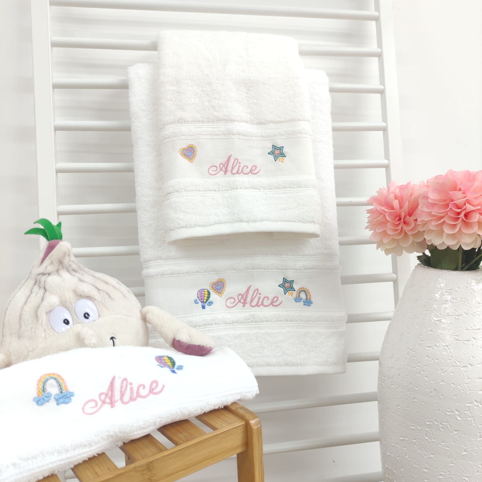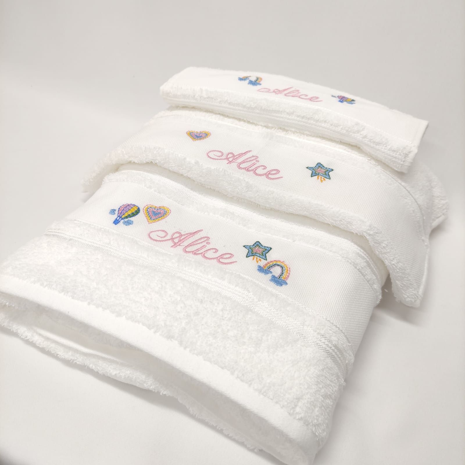 Conjunto de duche ou banho, 100% algodão. Modelo simples com detalhe de bordado personalizado.