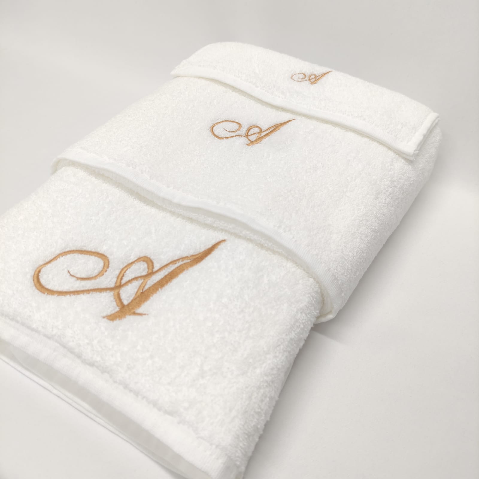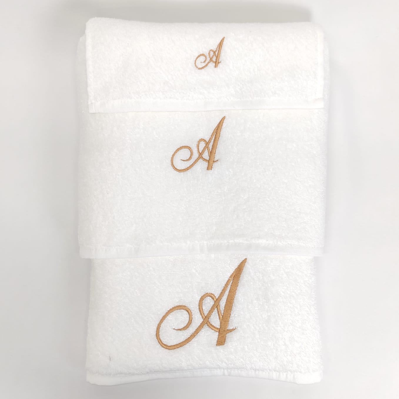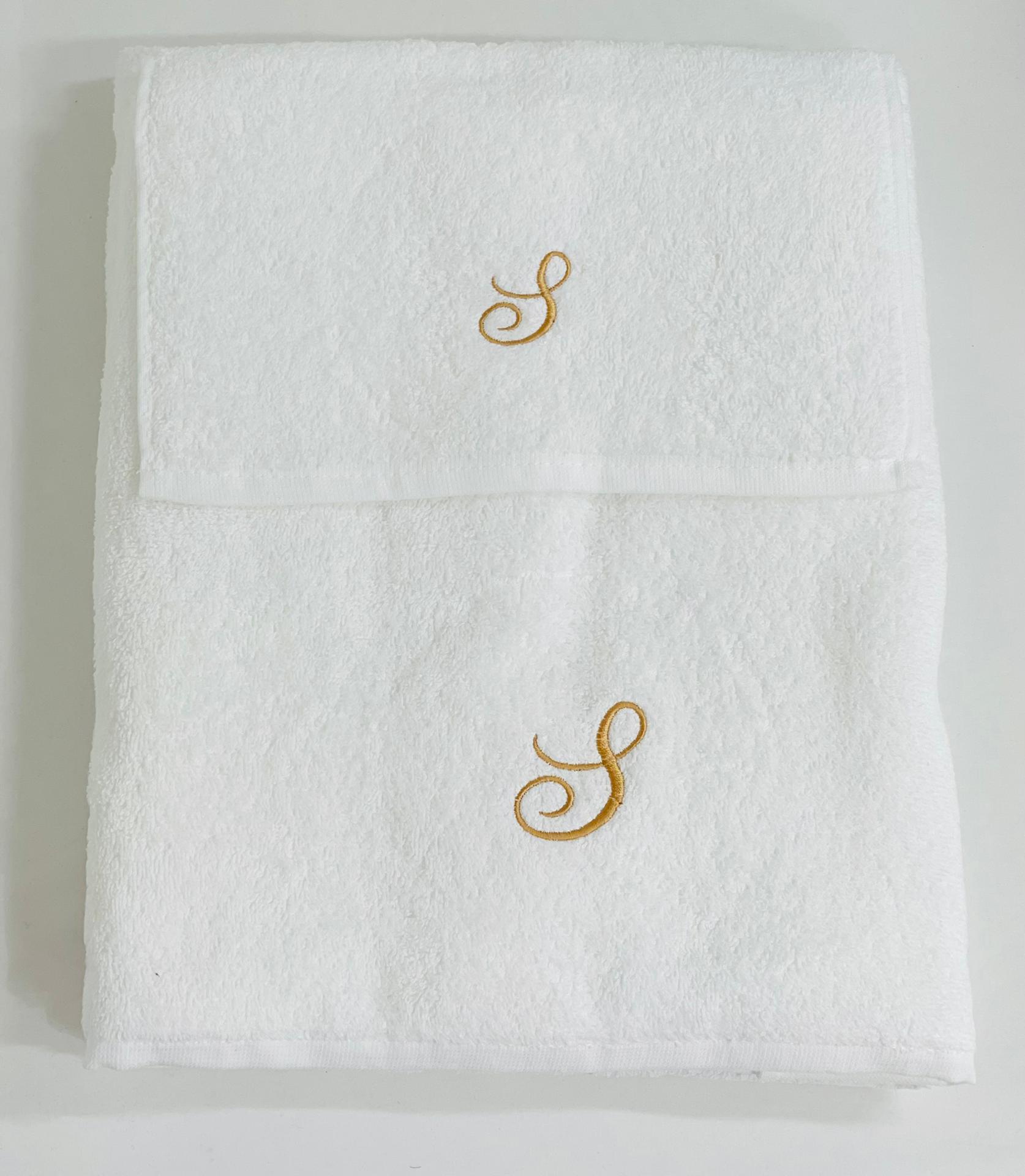 Conjunto de banho ou duche em 100% algodão. Modelo simples com detalhe de letra bordada em dourado.