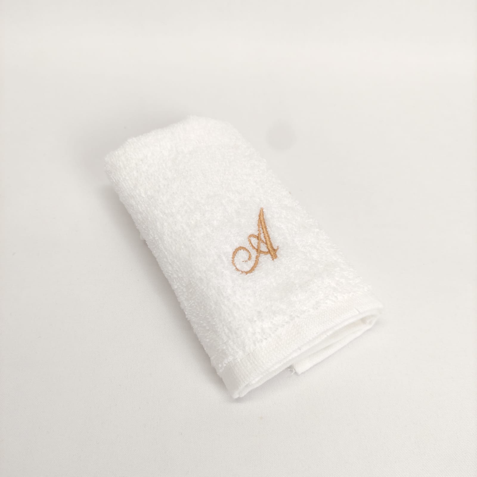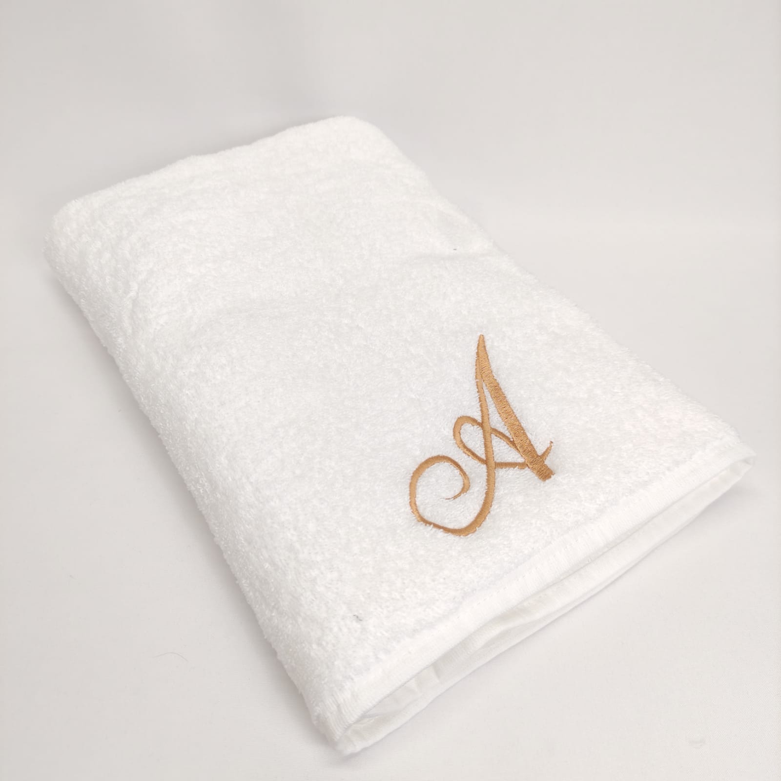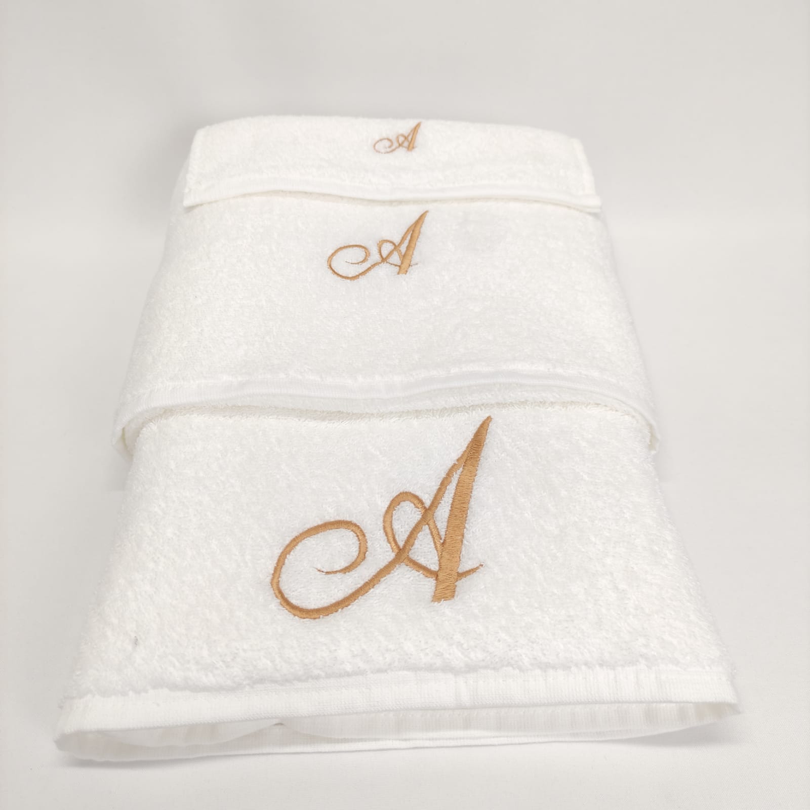 Conjunto de banho ou duche em 100% algodão. Modelo simples com detalhe de letra bordada em dourado.