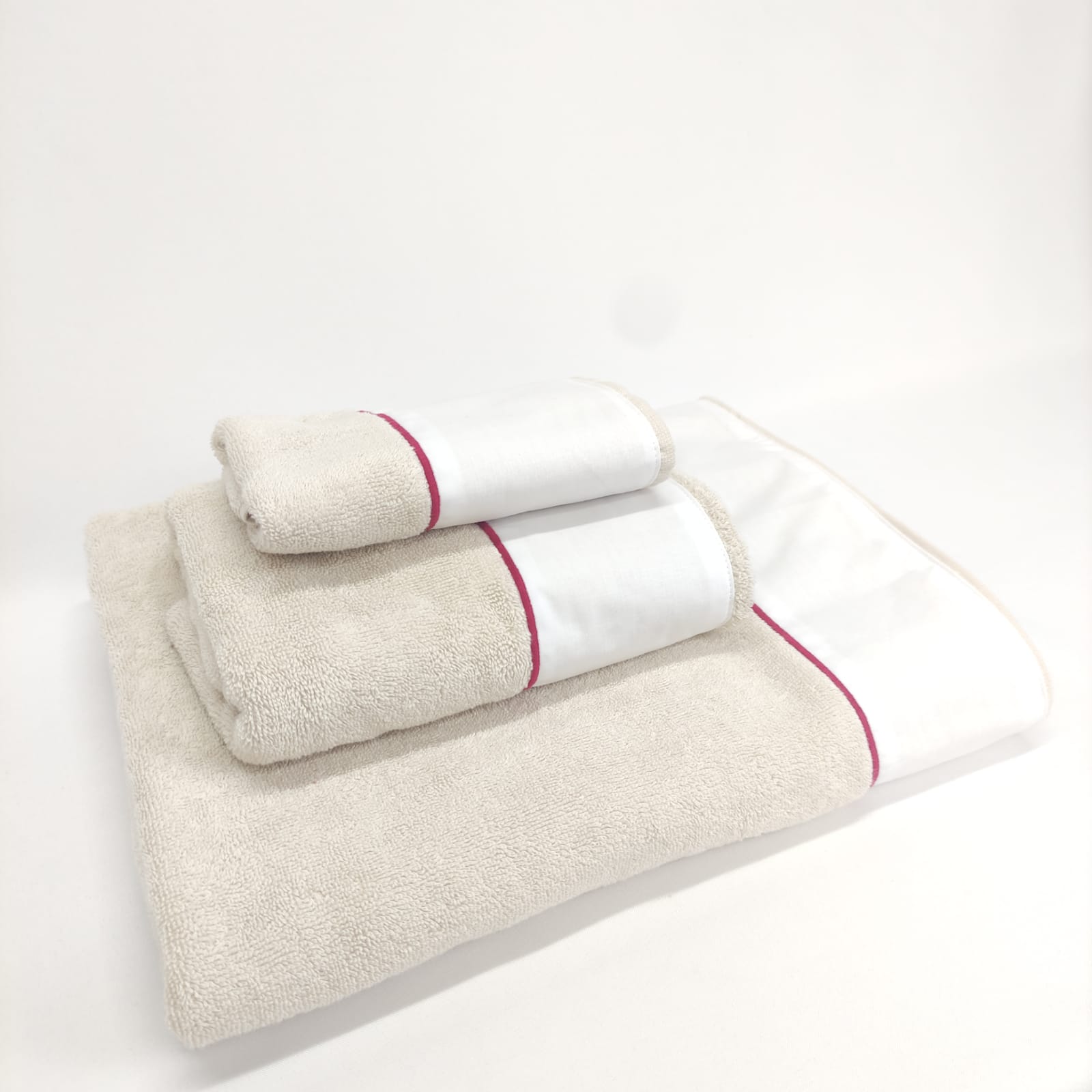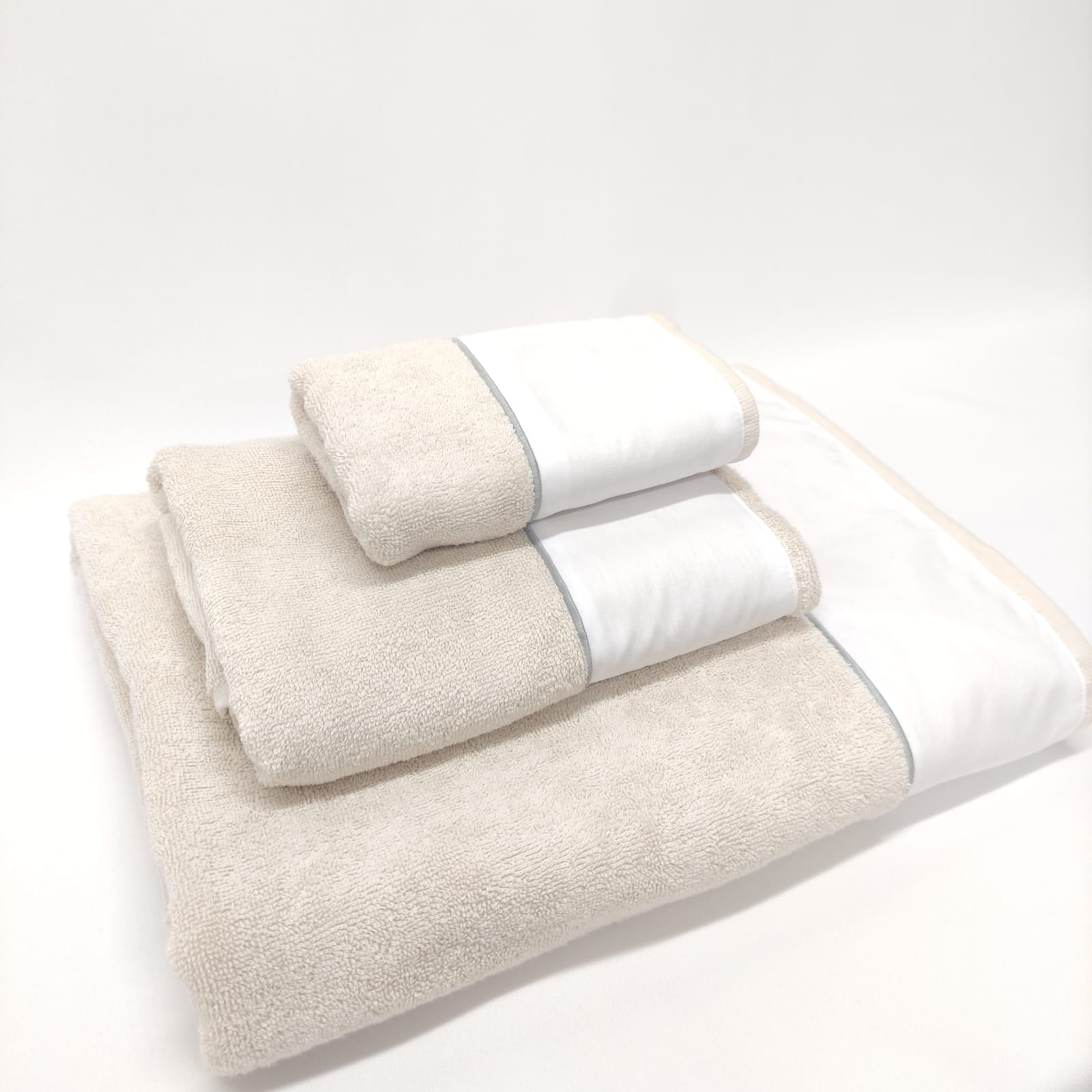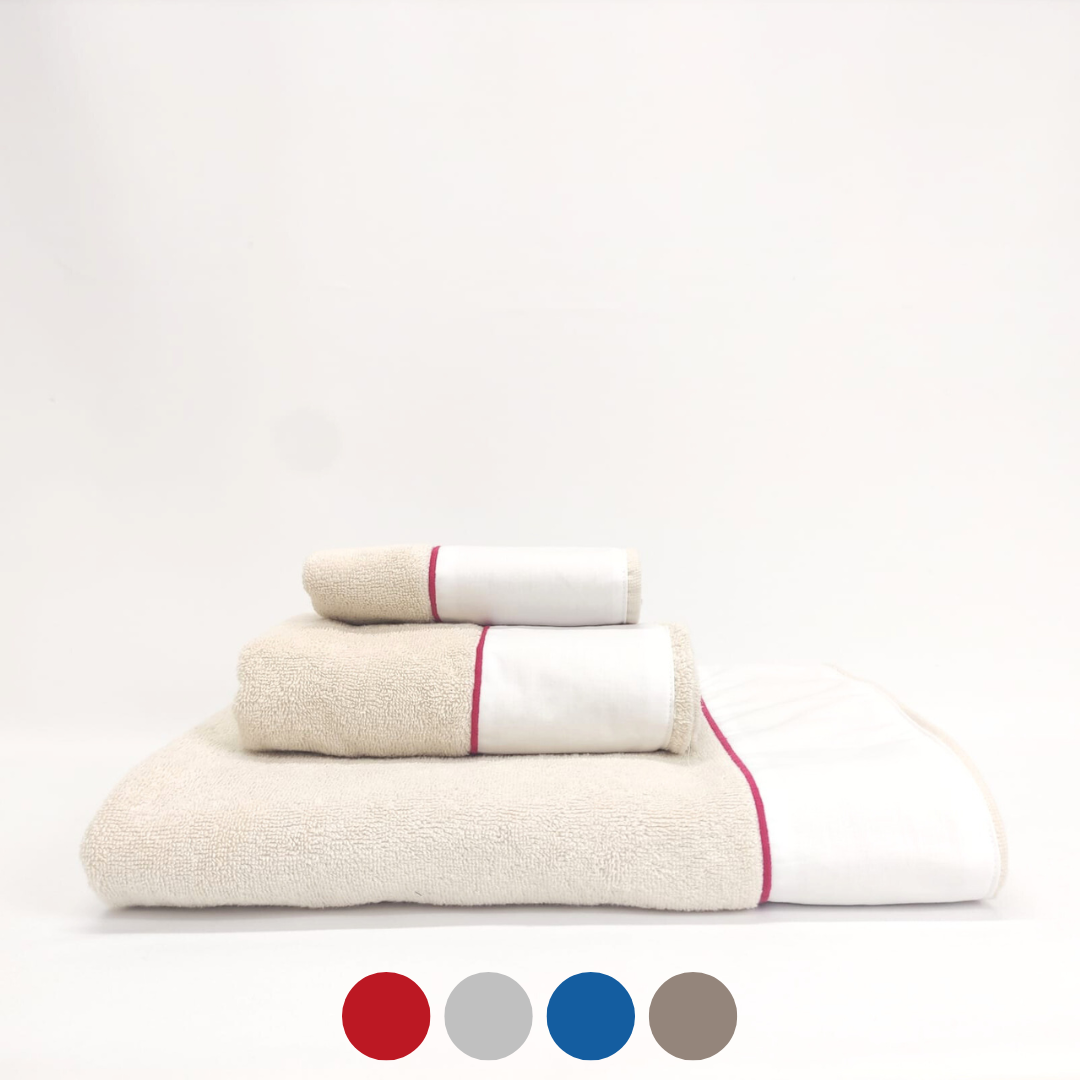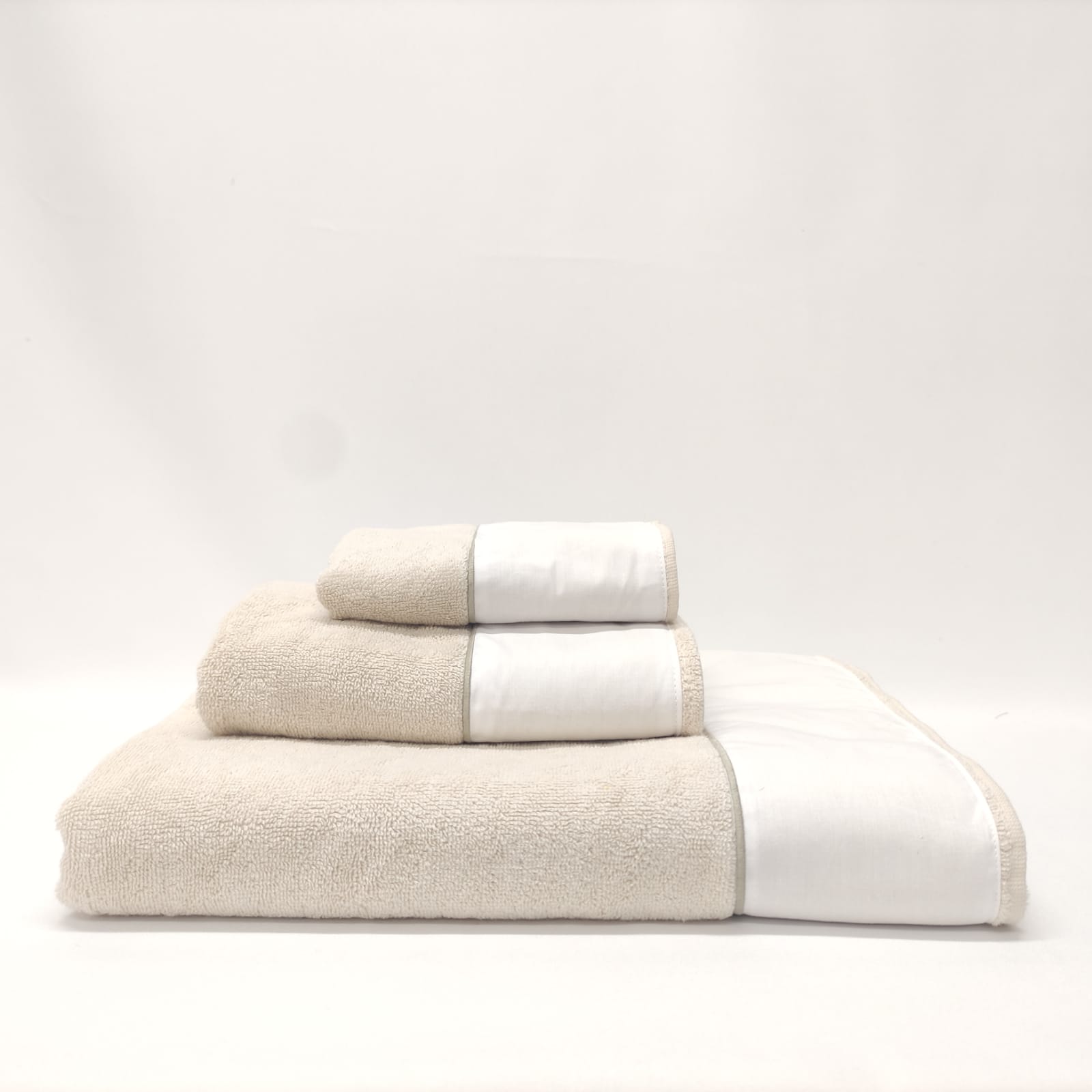Conjunto de toalhas de Banho, em felpo de algodão na cor bege, com pormenor de um rolinho.