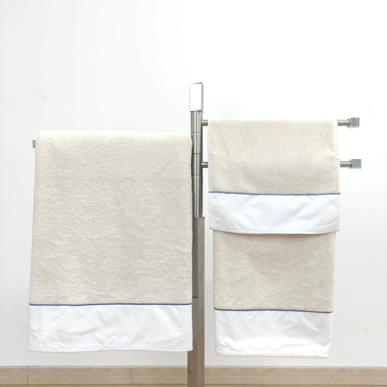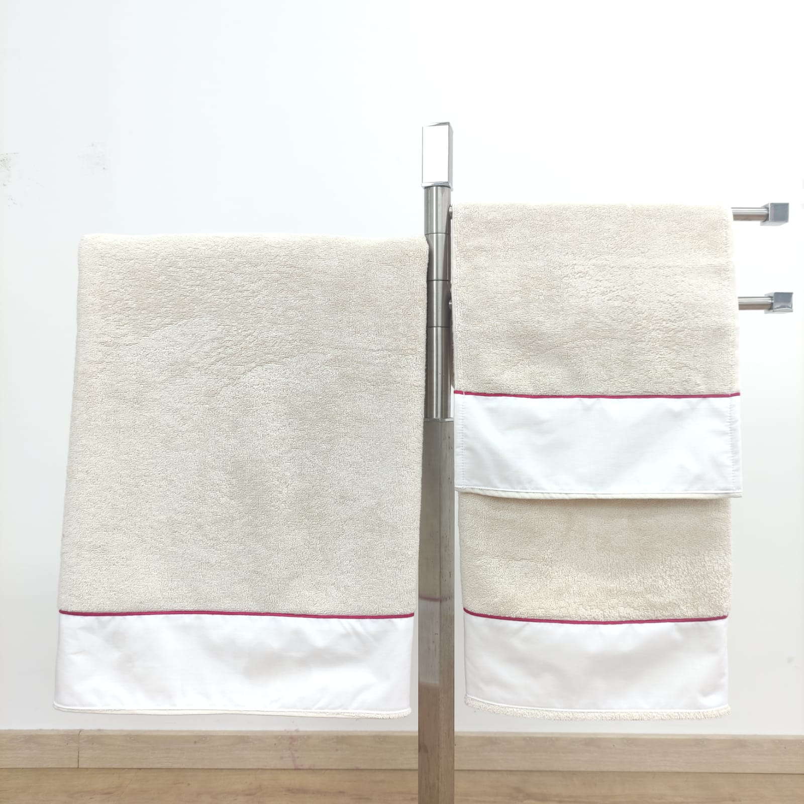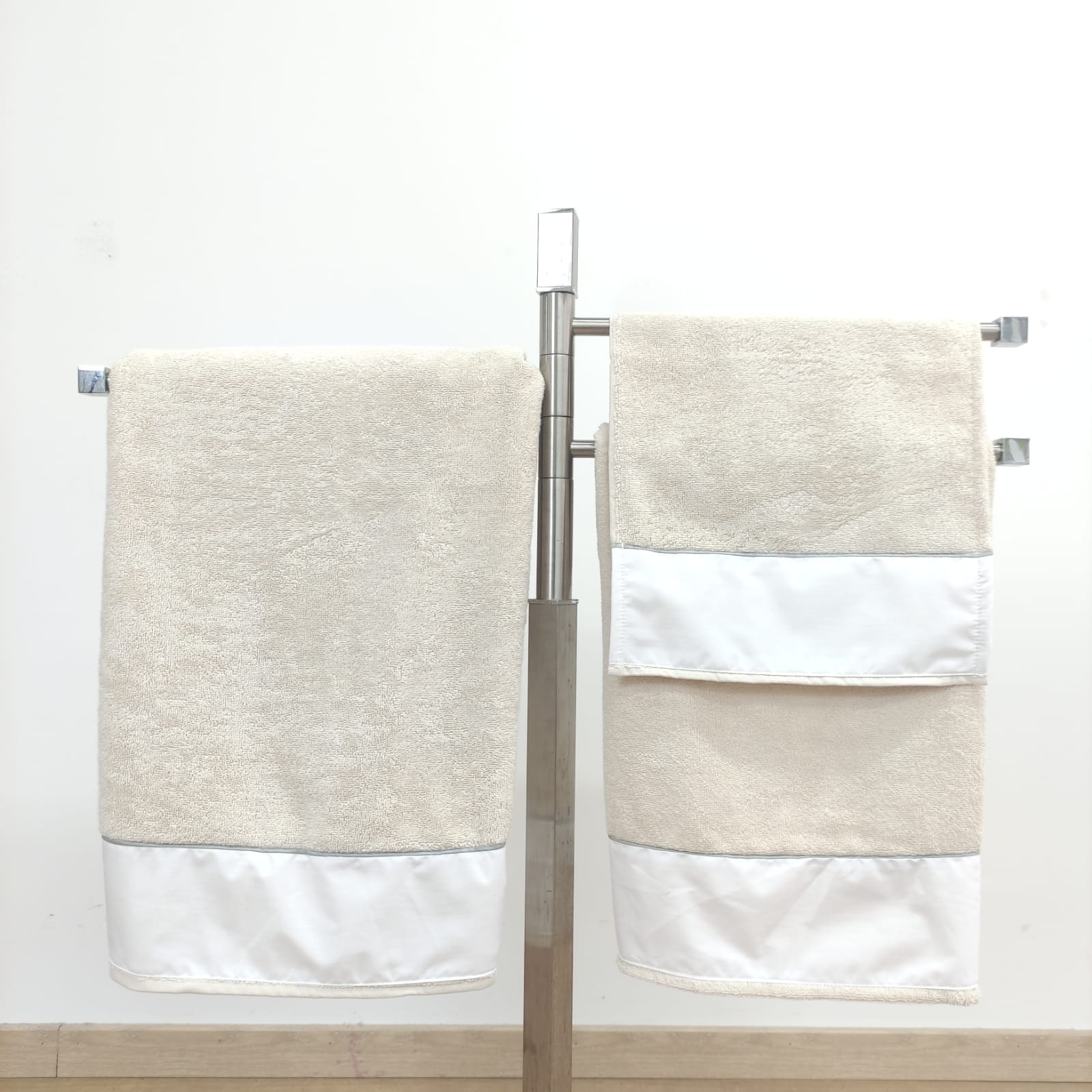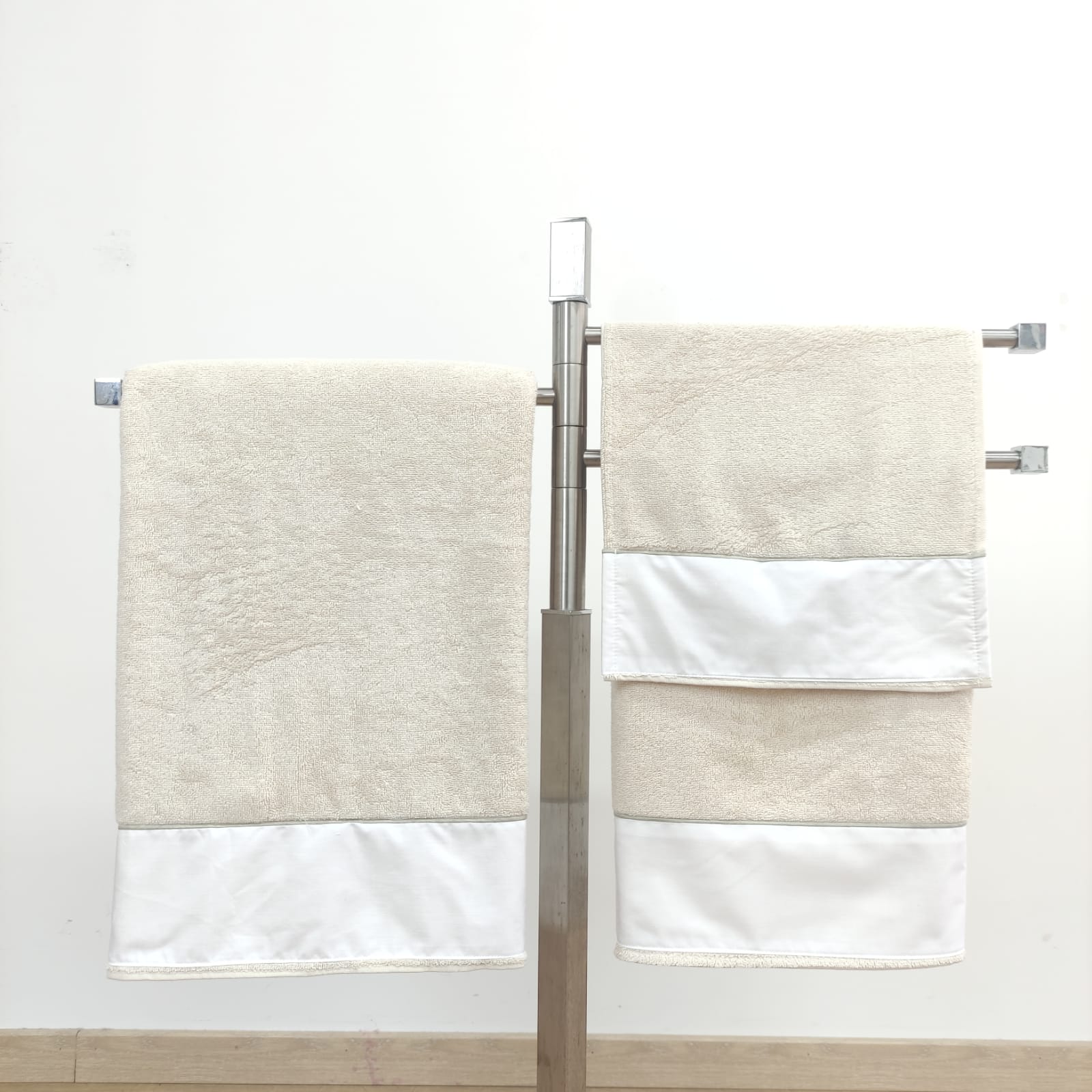 Conjunto de toalhas de Banho, em felpo de algodão na cor bege, com pormenor de um rolinho.