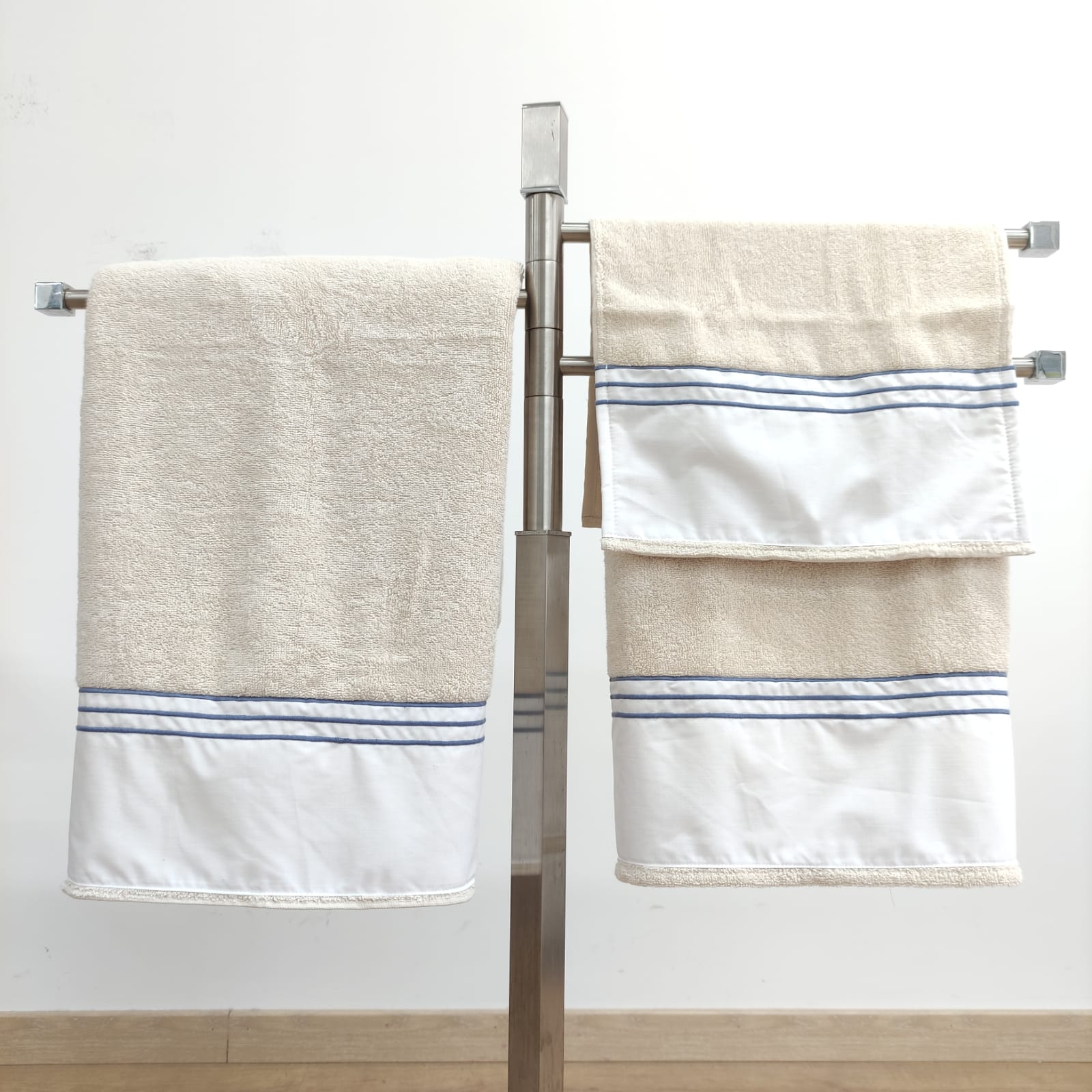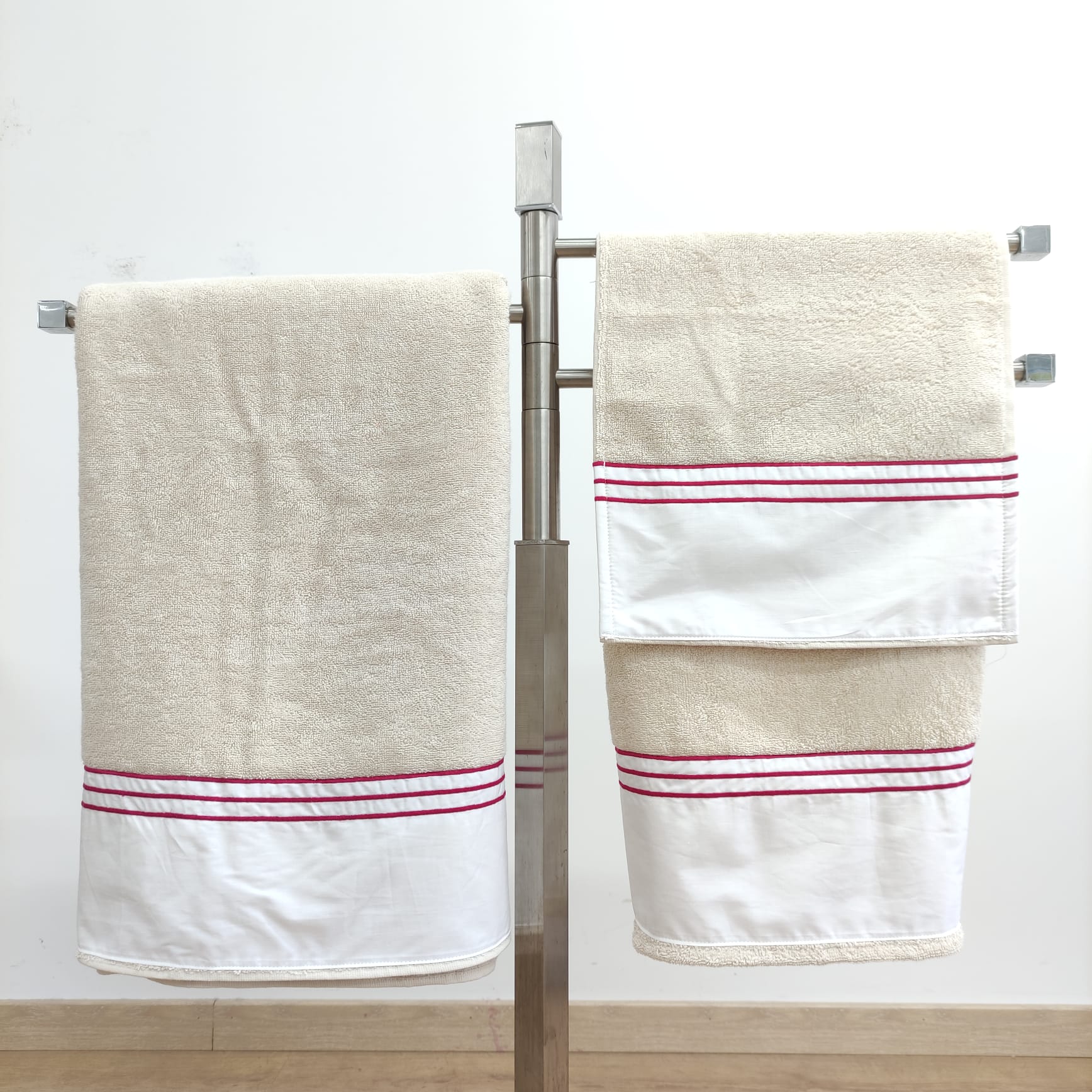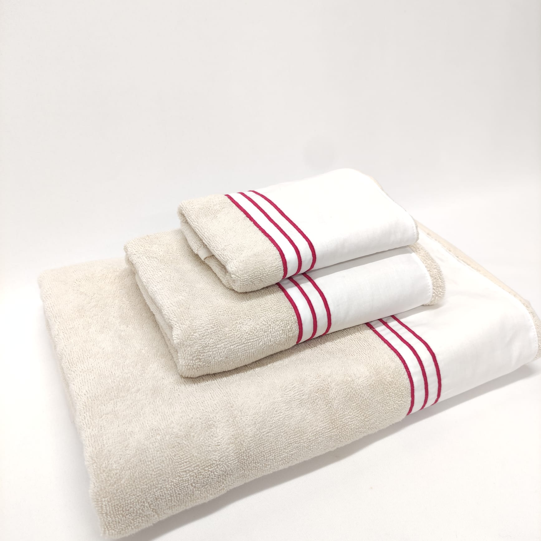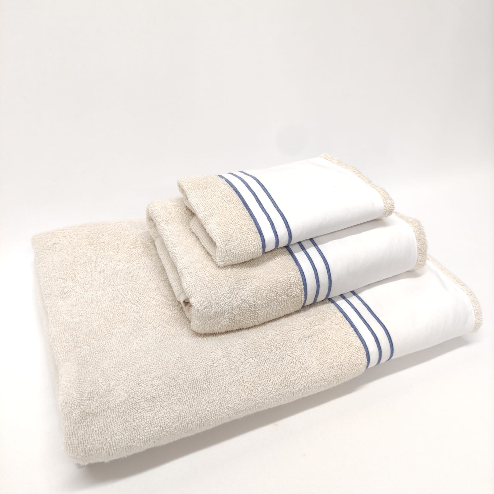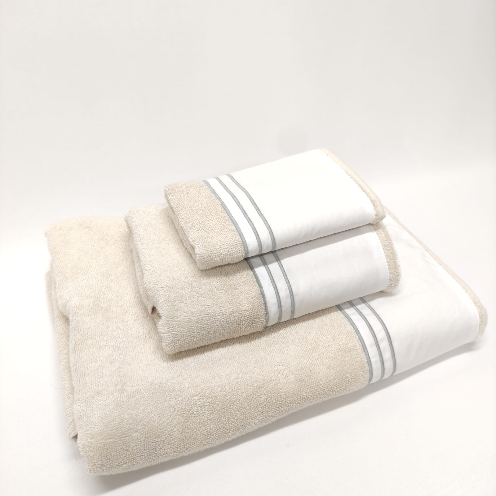 Conjunto de toalhas de Banho, em felpo de algodão na cor bege, com pormenor de três rolinhos.