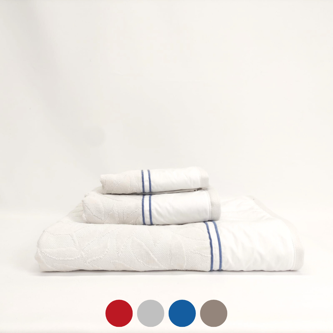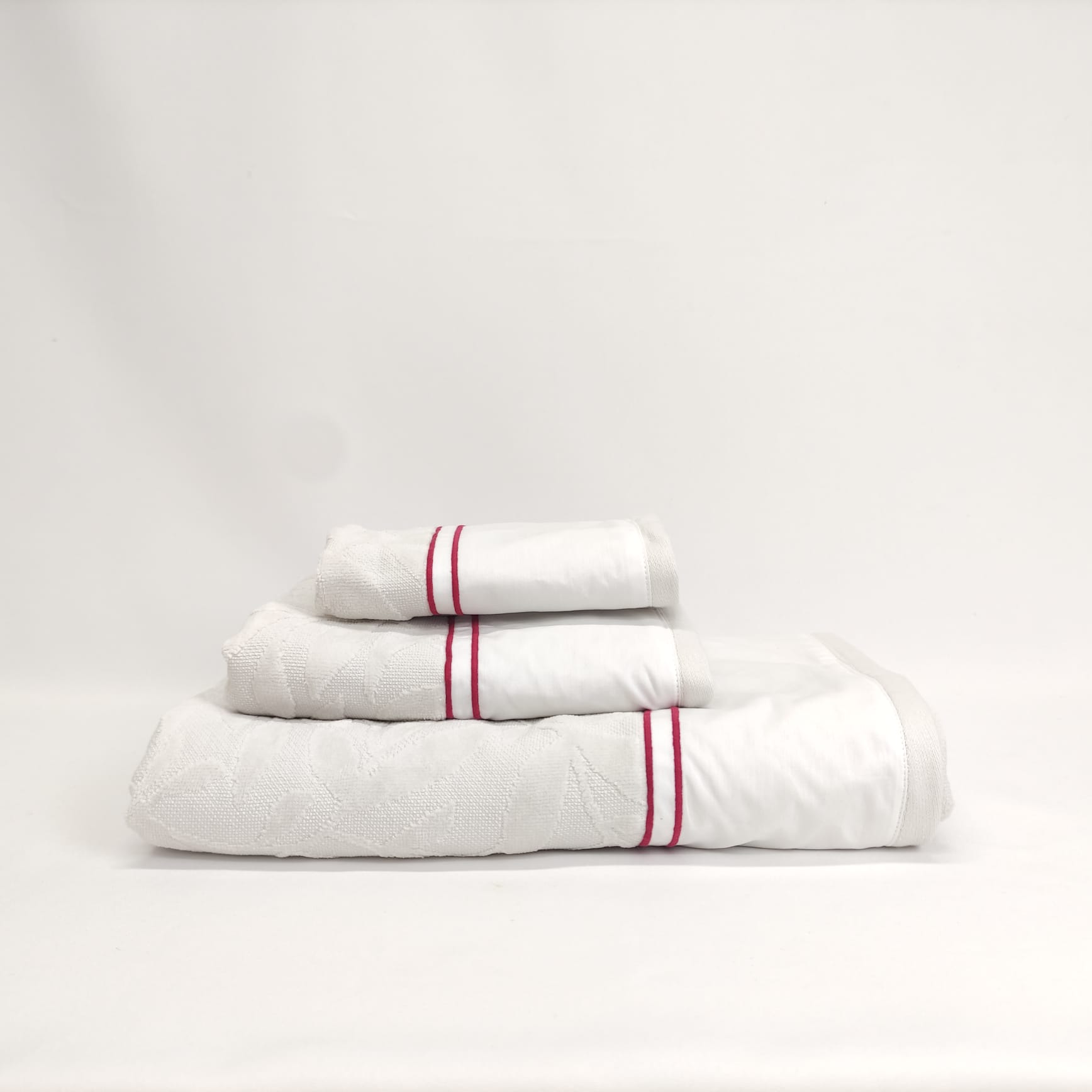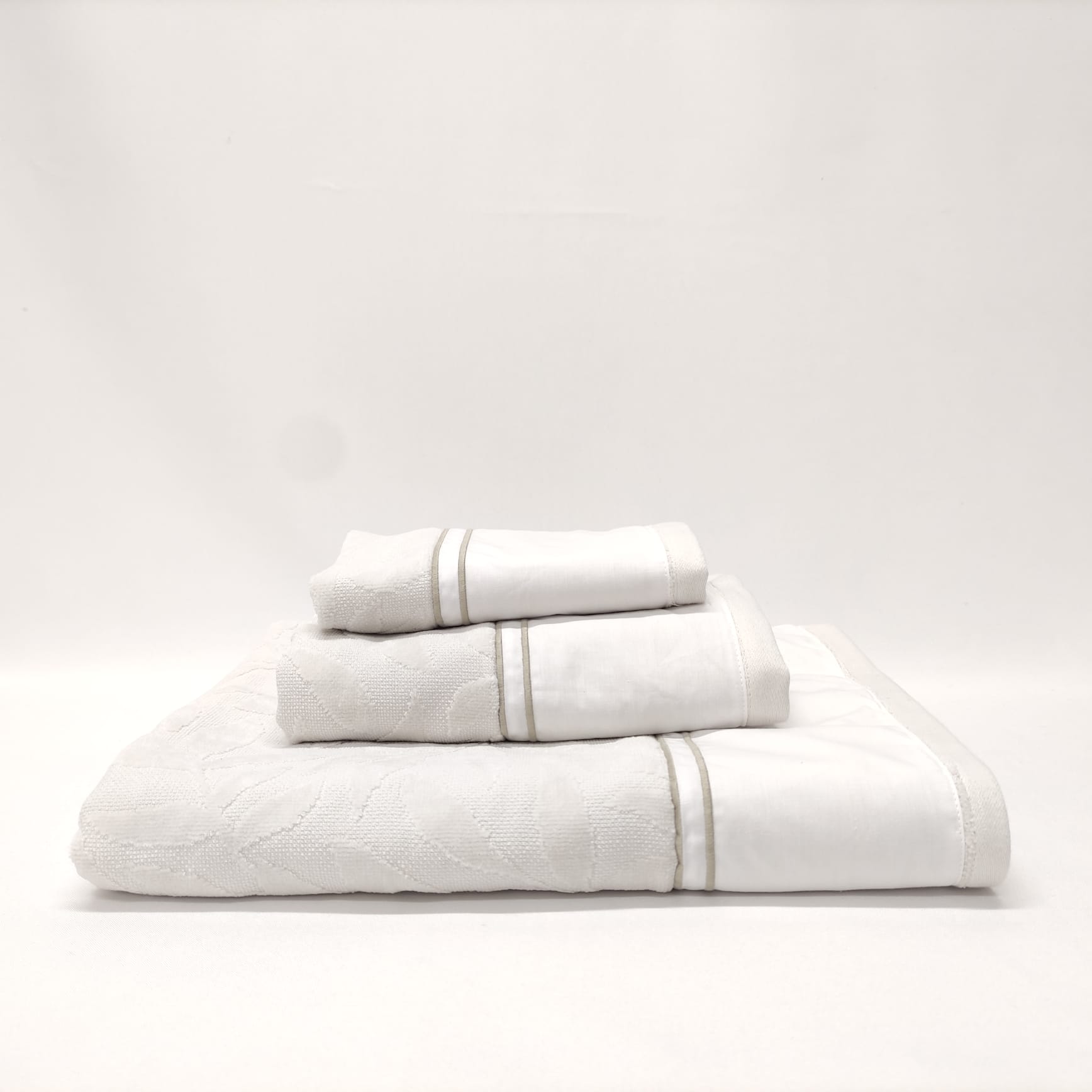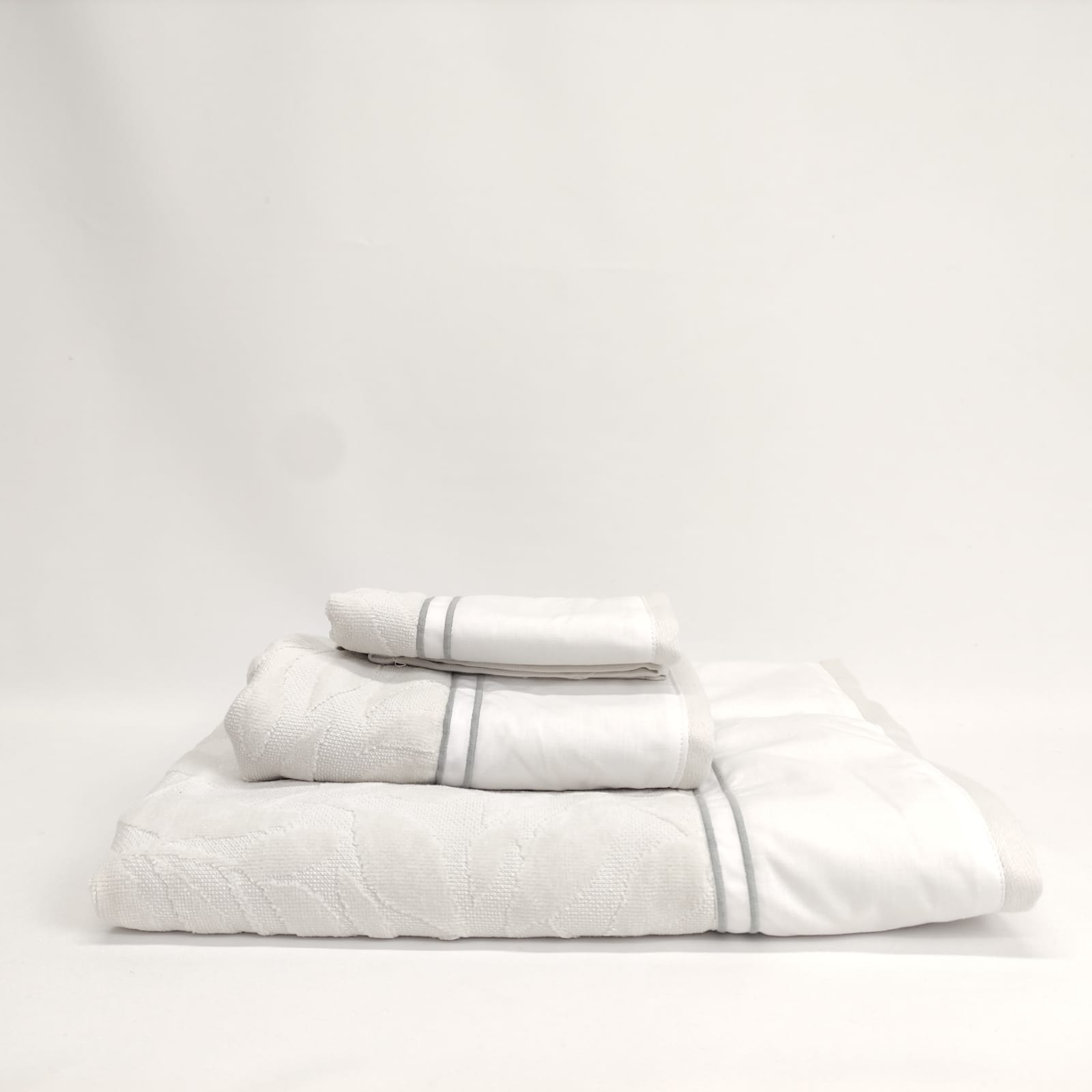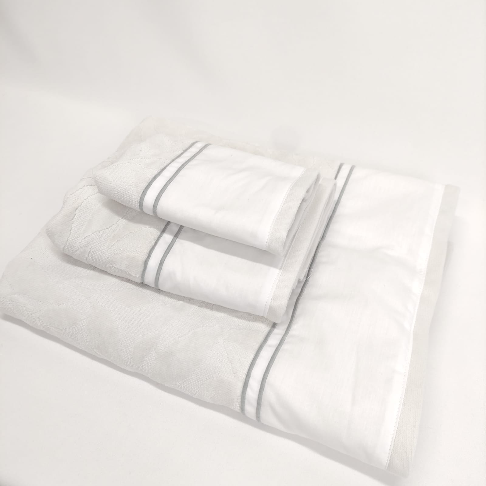Conjunto de toalhas de Banho, em felpo de algodão na cor cinza, com pormenor de dois rolinhos.
