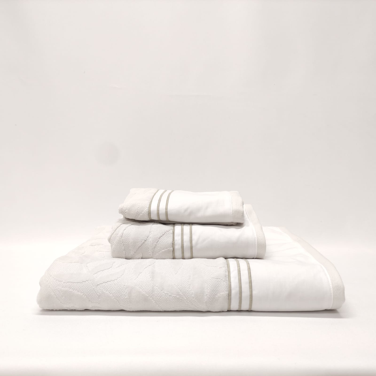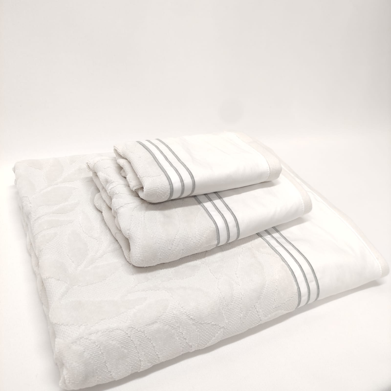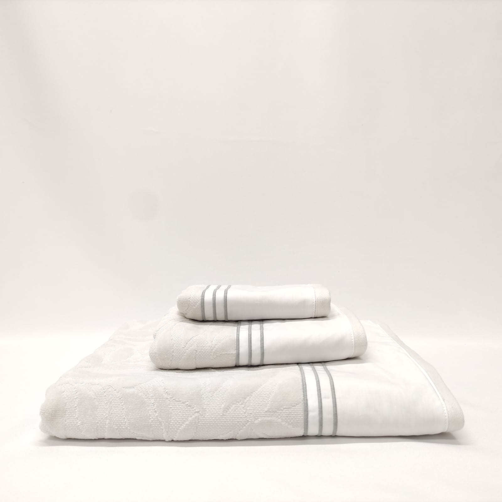 Conjunto de toalhas de Banho, em felpo de algodão na cor cinza, com pormenor de três rolinhos.