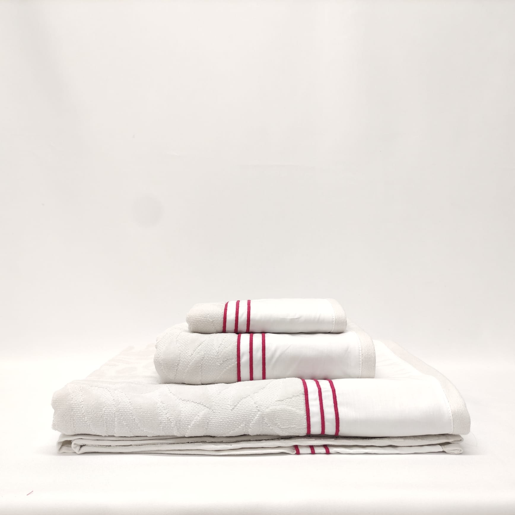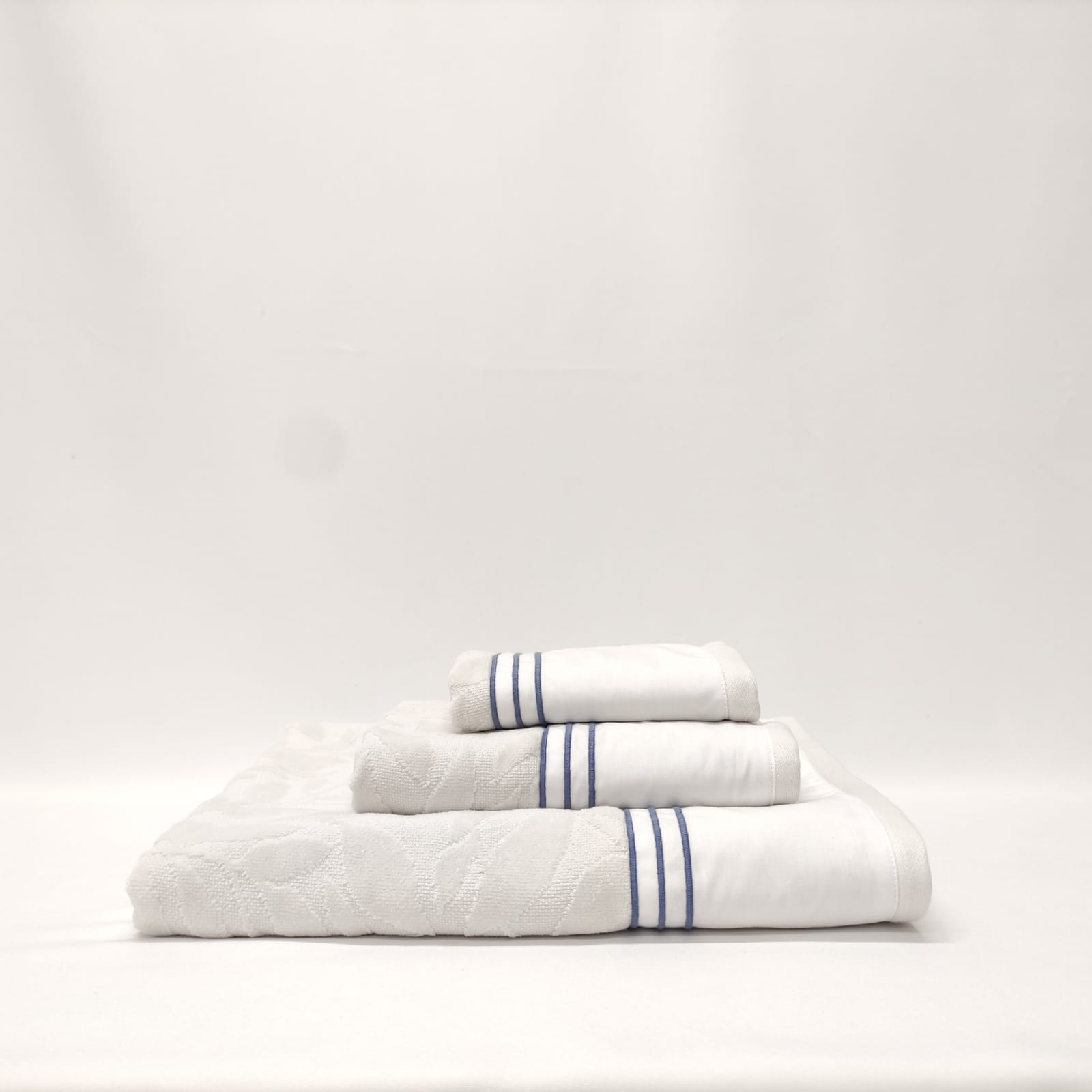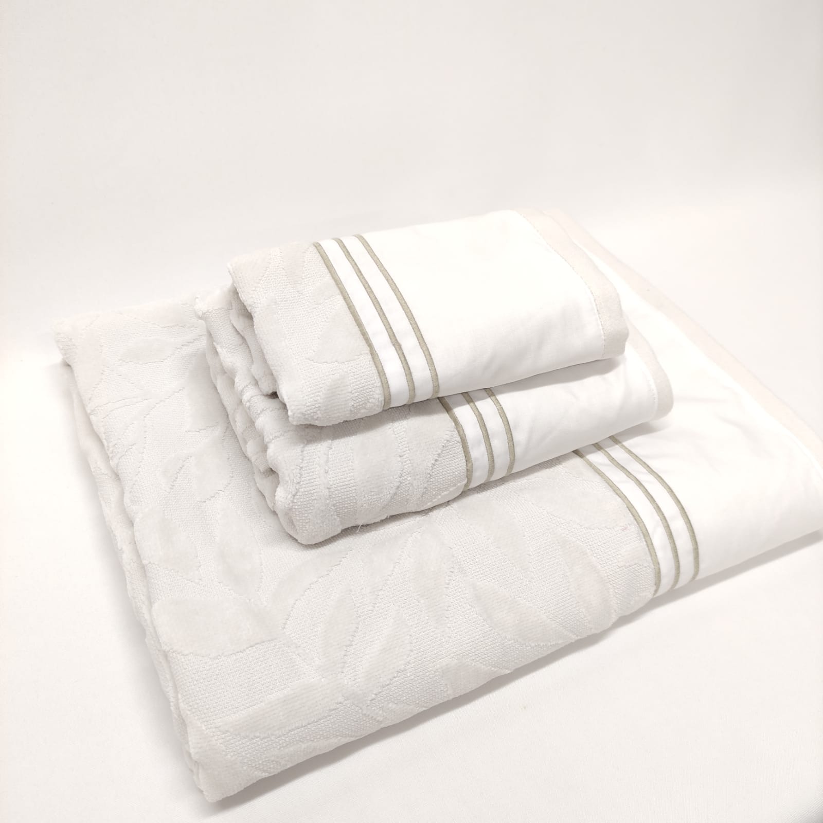 Conjunto de toalhas de Banho, em felpo de algodão na cor cinza, com pormenor de três rolinhos.