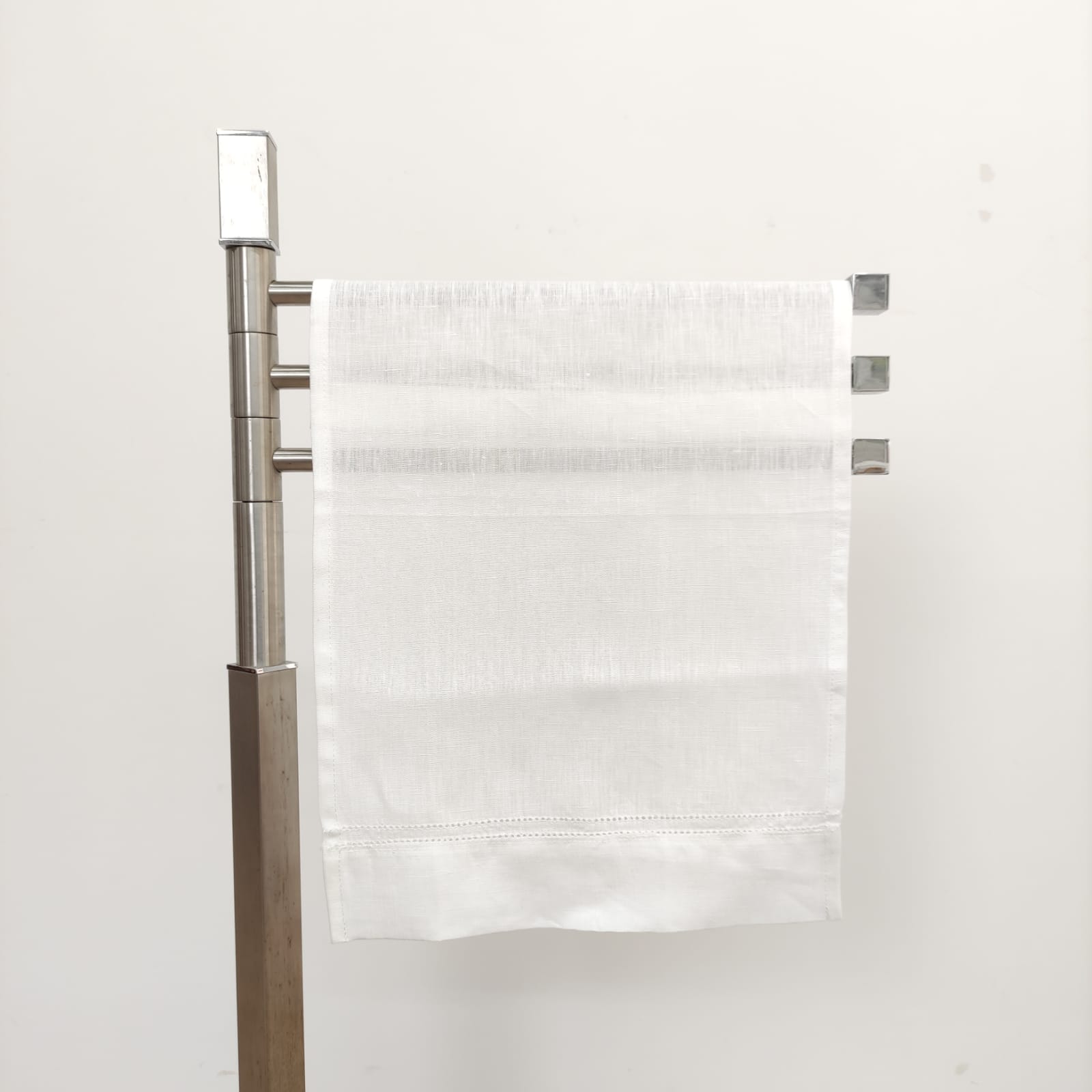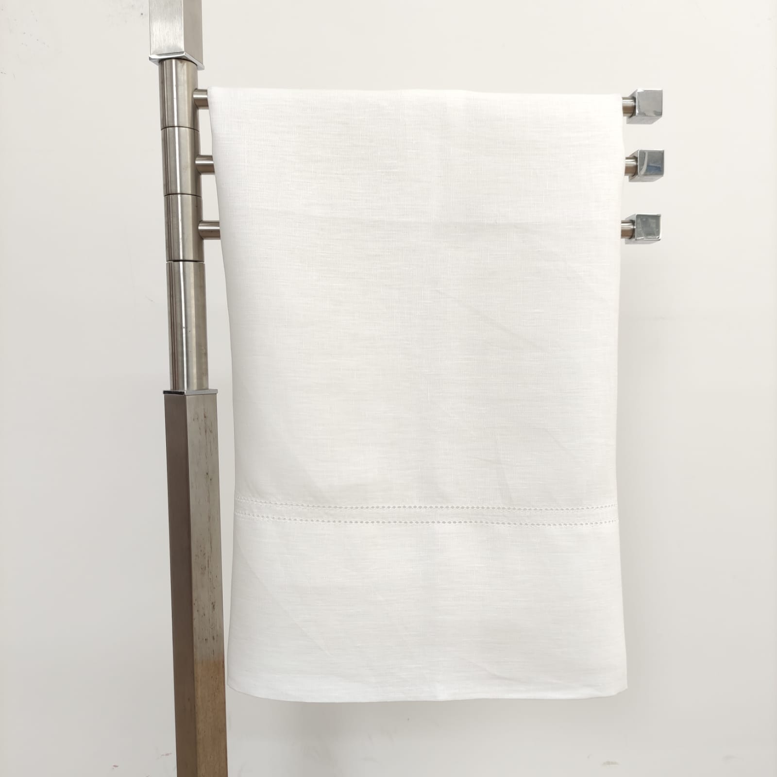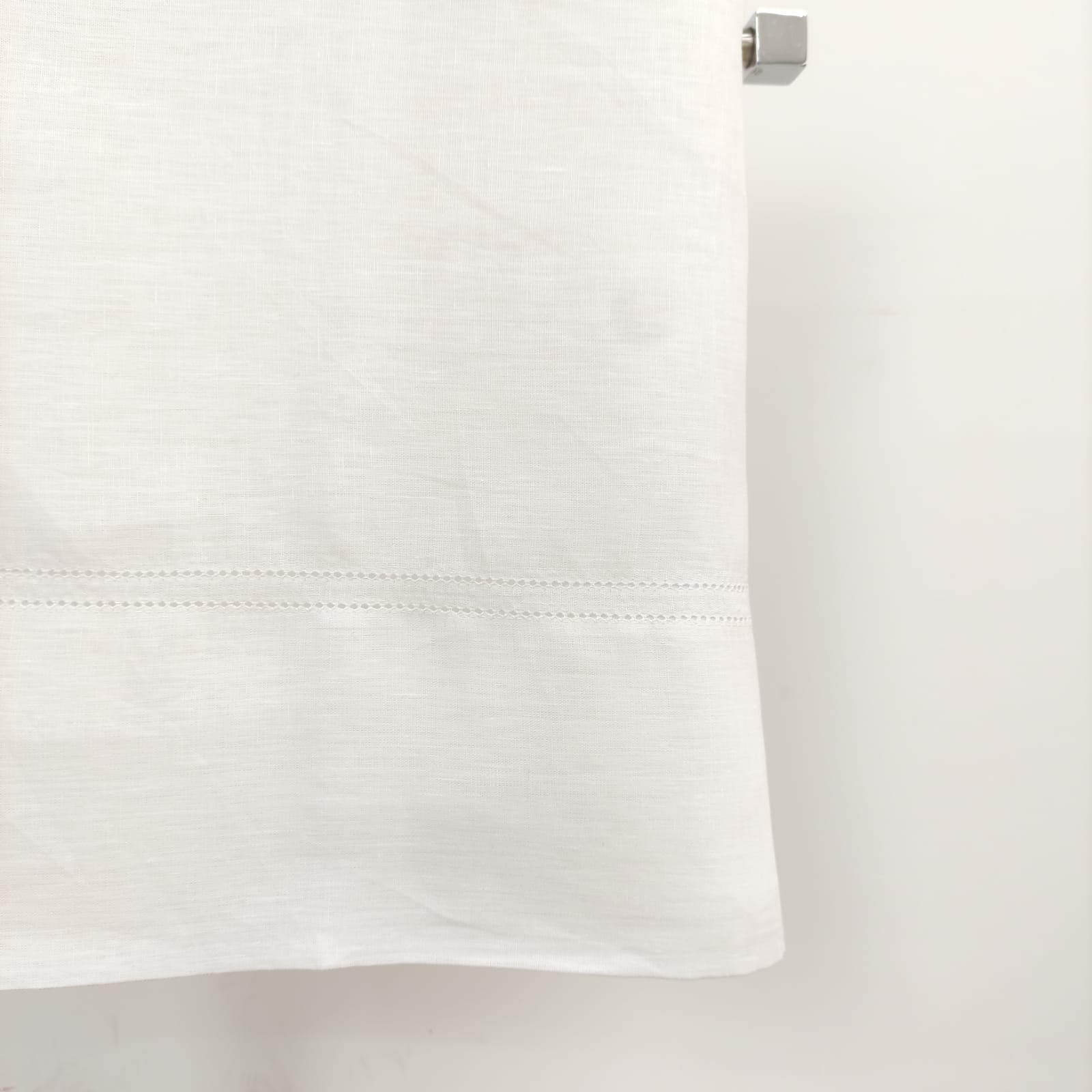 Toalha de linho na cor branco com detalhe de ponto aberto.  Uma linha de trabalhado Ponto Aberto em cima e duas linhas de Ponto Aberto em baixo.