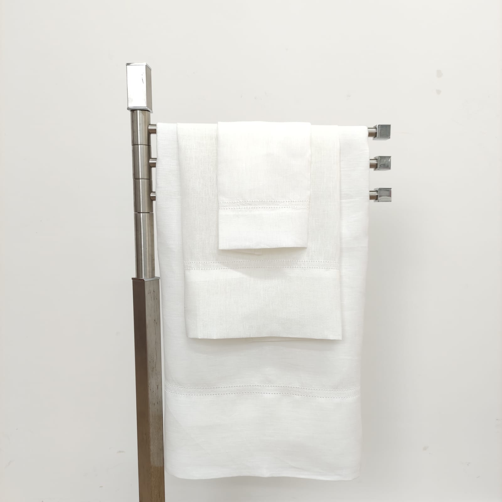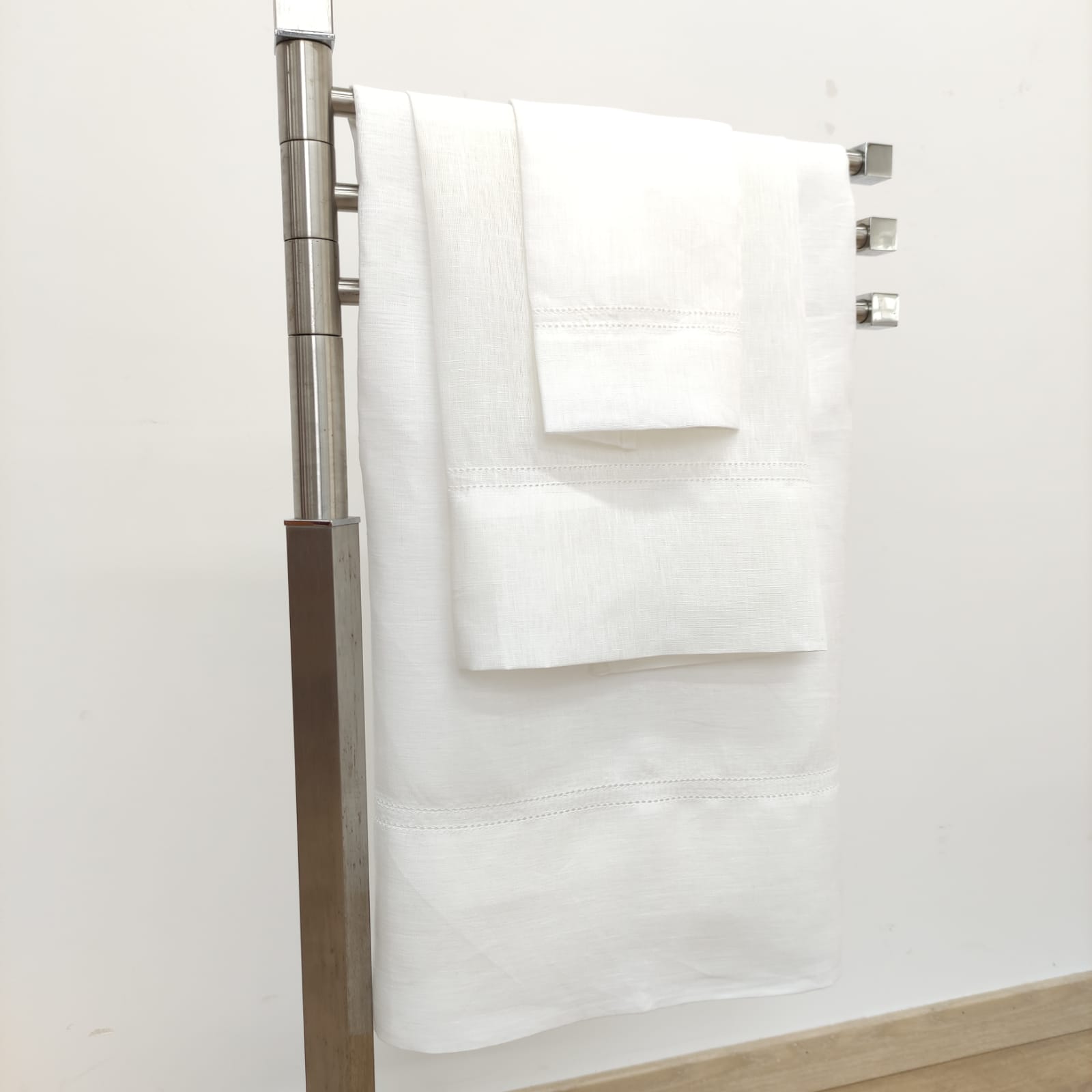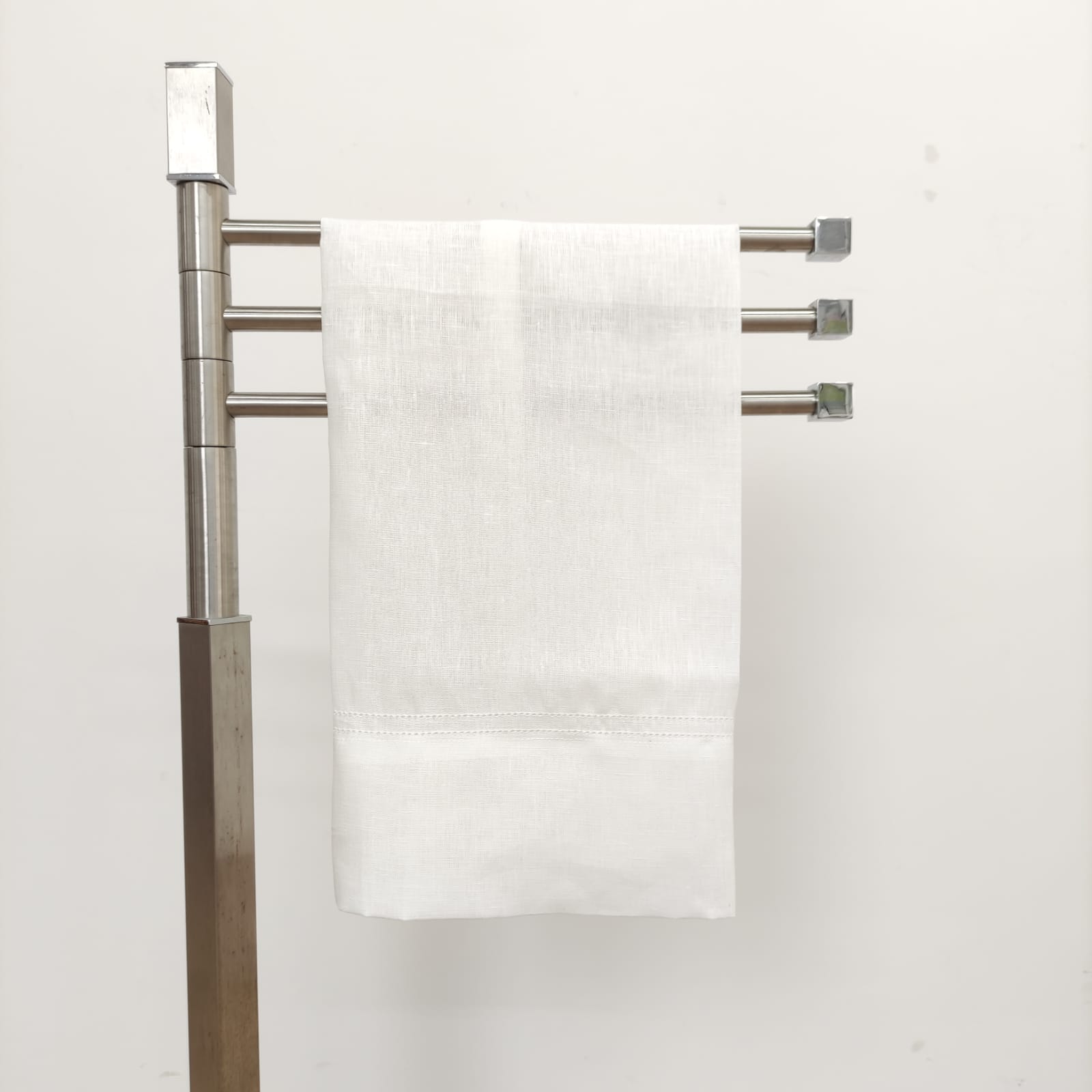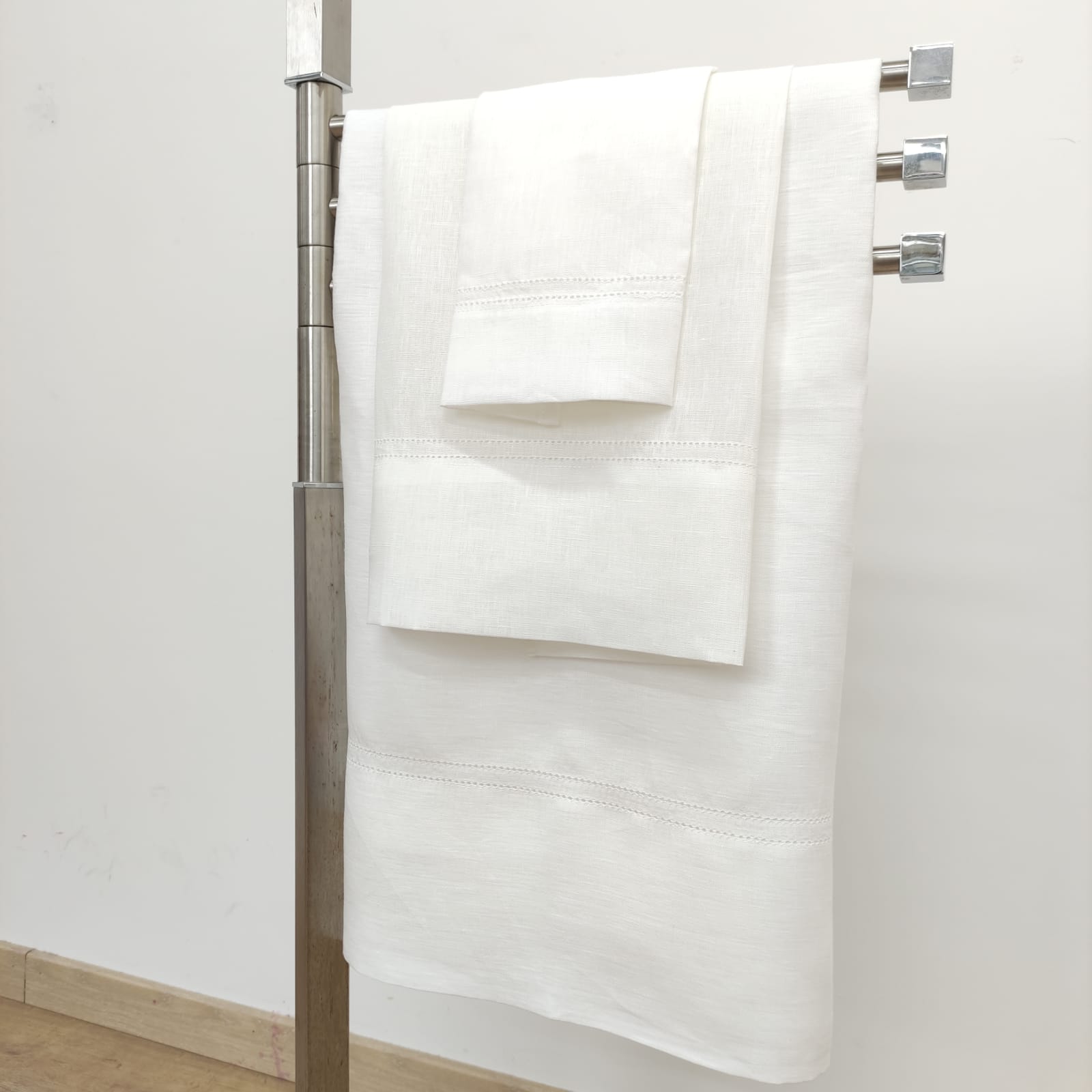 Toalha de linho na cor branco com detalhe de ponto aberto.  Uma linha de trabalhado Ponto Aberto em cima e duas linhas de Ponto Aberto em baixo.