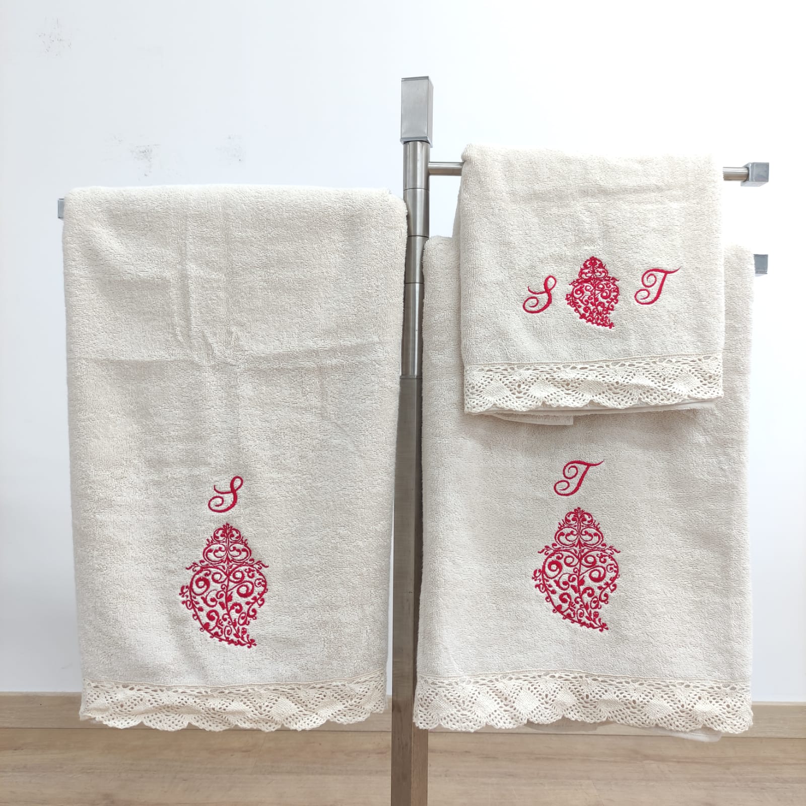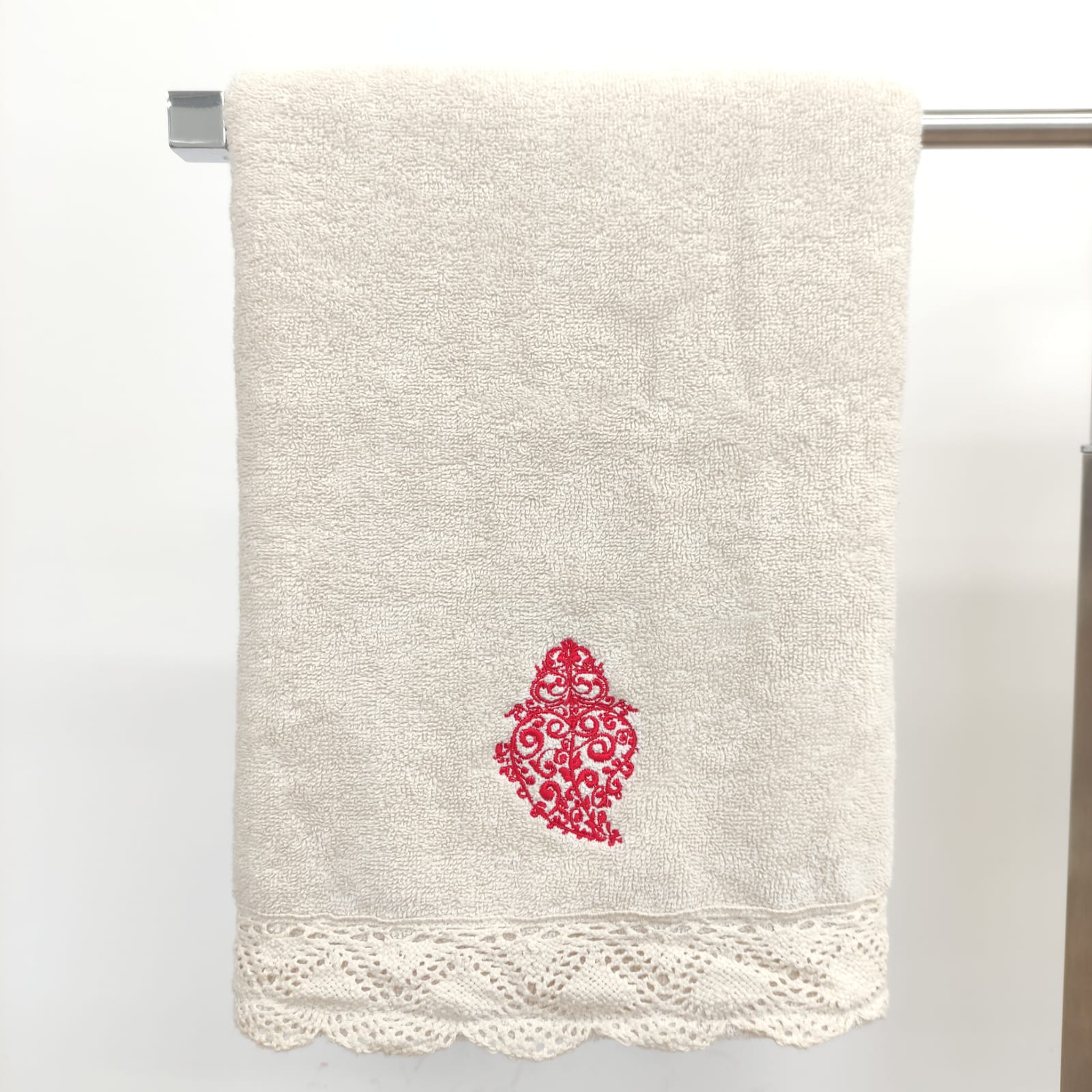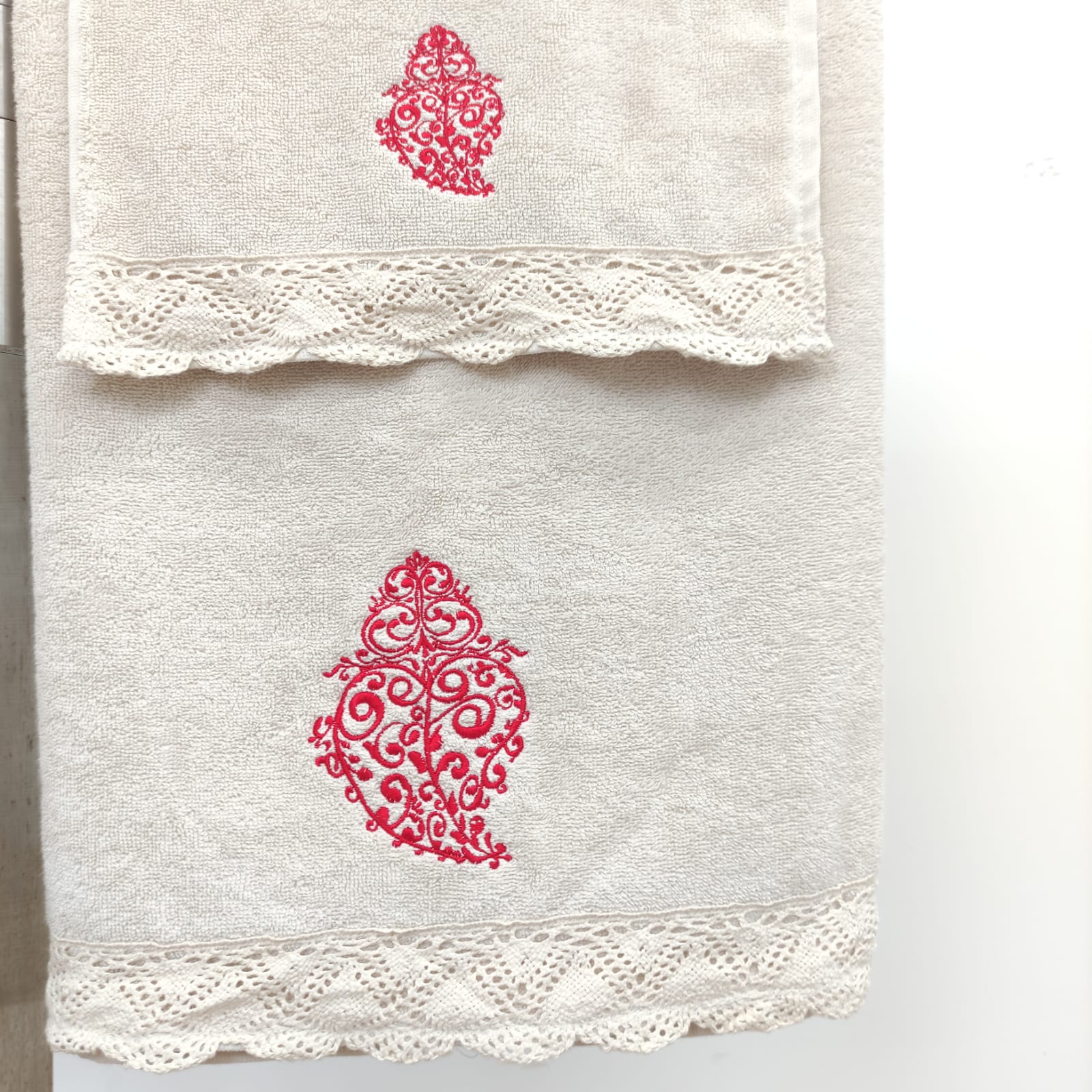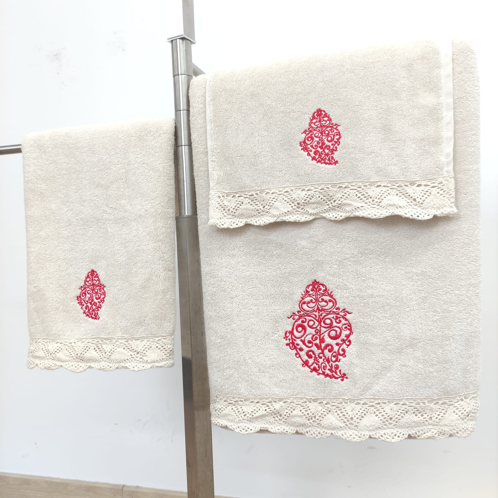 Conjunto de toalhas em felpo de algodão bege com pormenor de renda e um bordado delicado do coração de viana em vermelho. Disponível com opção de personalização.