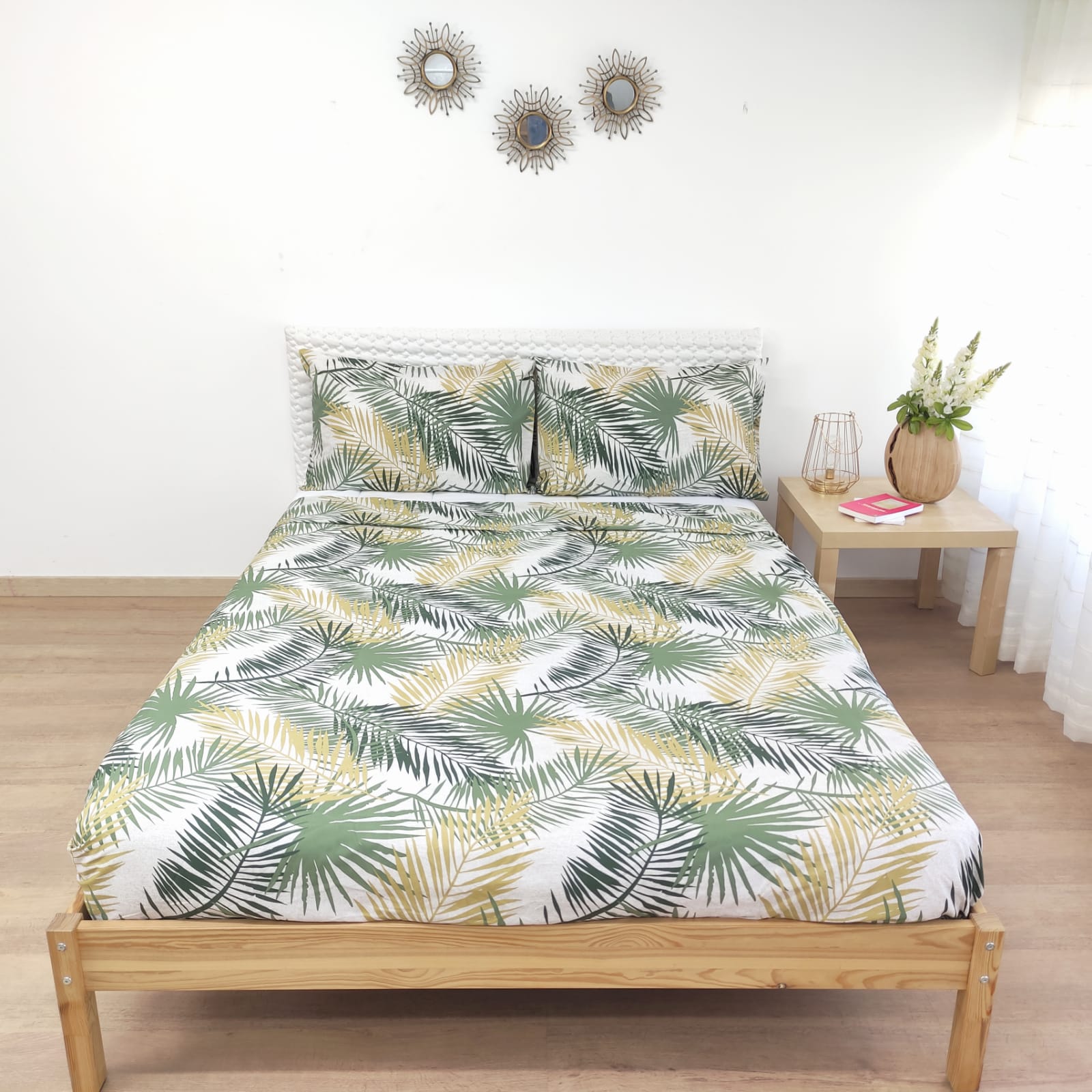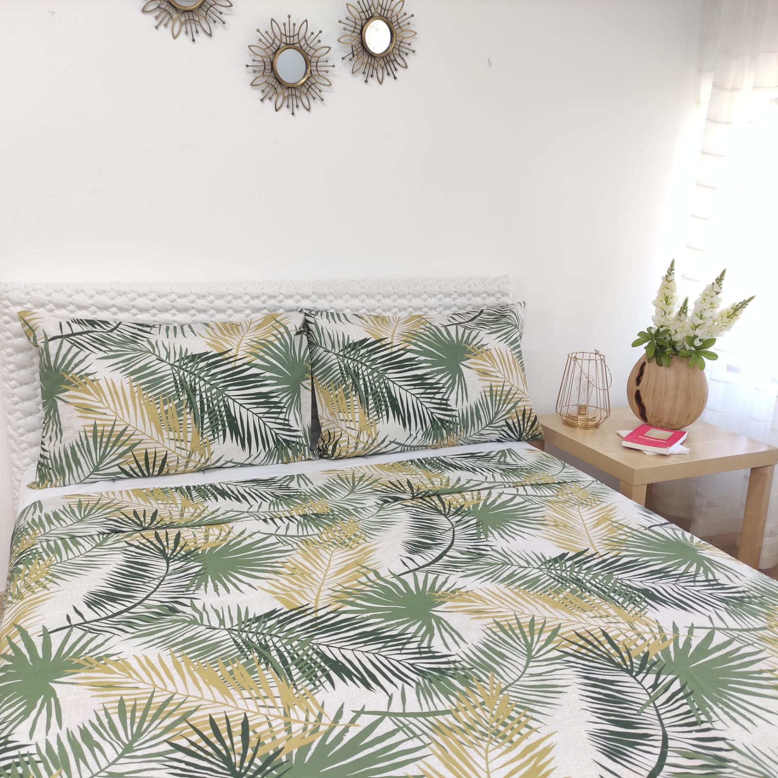Jogo de lençóis algodão estampado composto por fronhas de almofadas estampadas, lençol de cima estampado e lençol de baixo liso branco.
