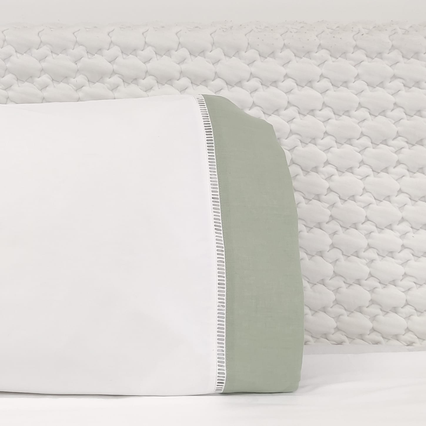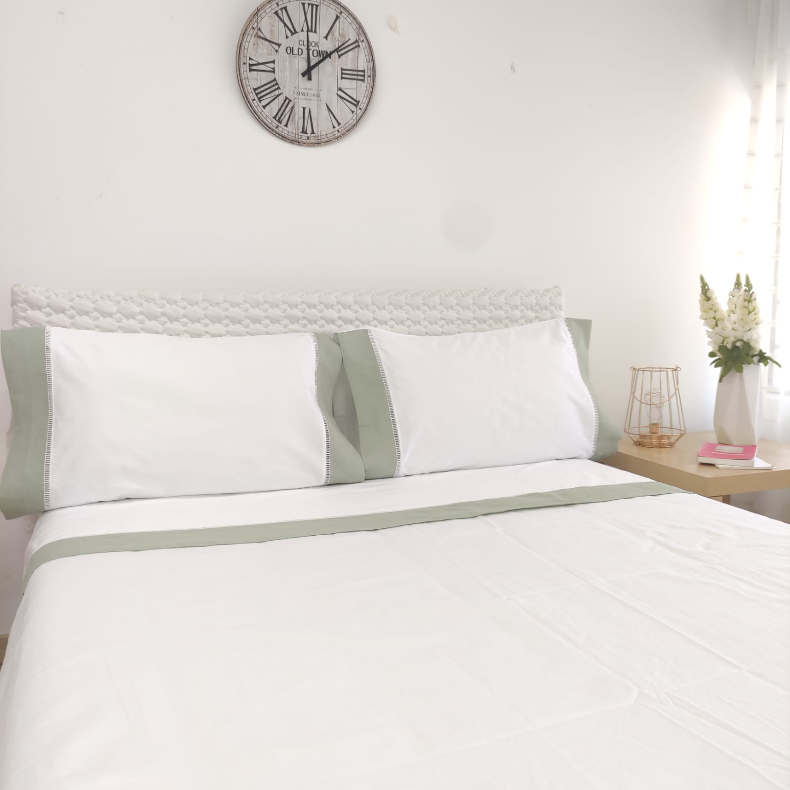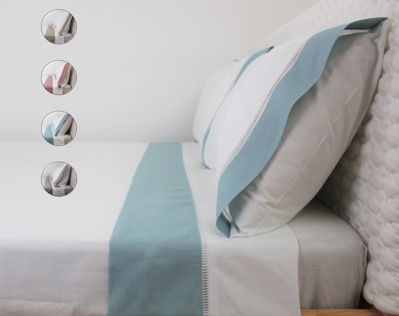 Jogo de lençóis. Modelo em algodão com detalhe de barra em linho no lençol de cima e fronha de almofada.