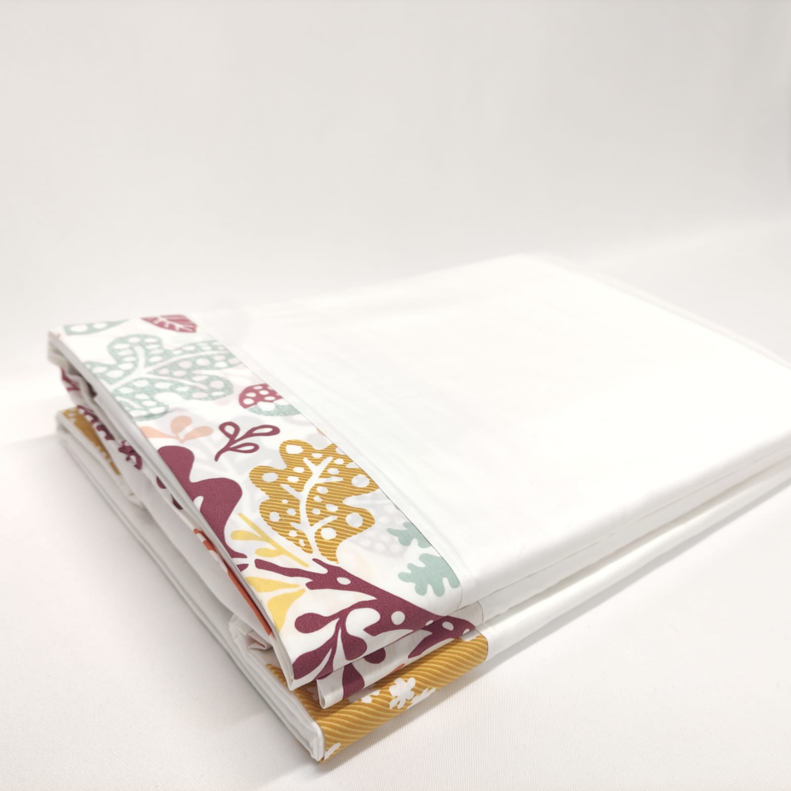 Jogo de lençóis algodão. Modelo liso de cor branca com barra colorida.