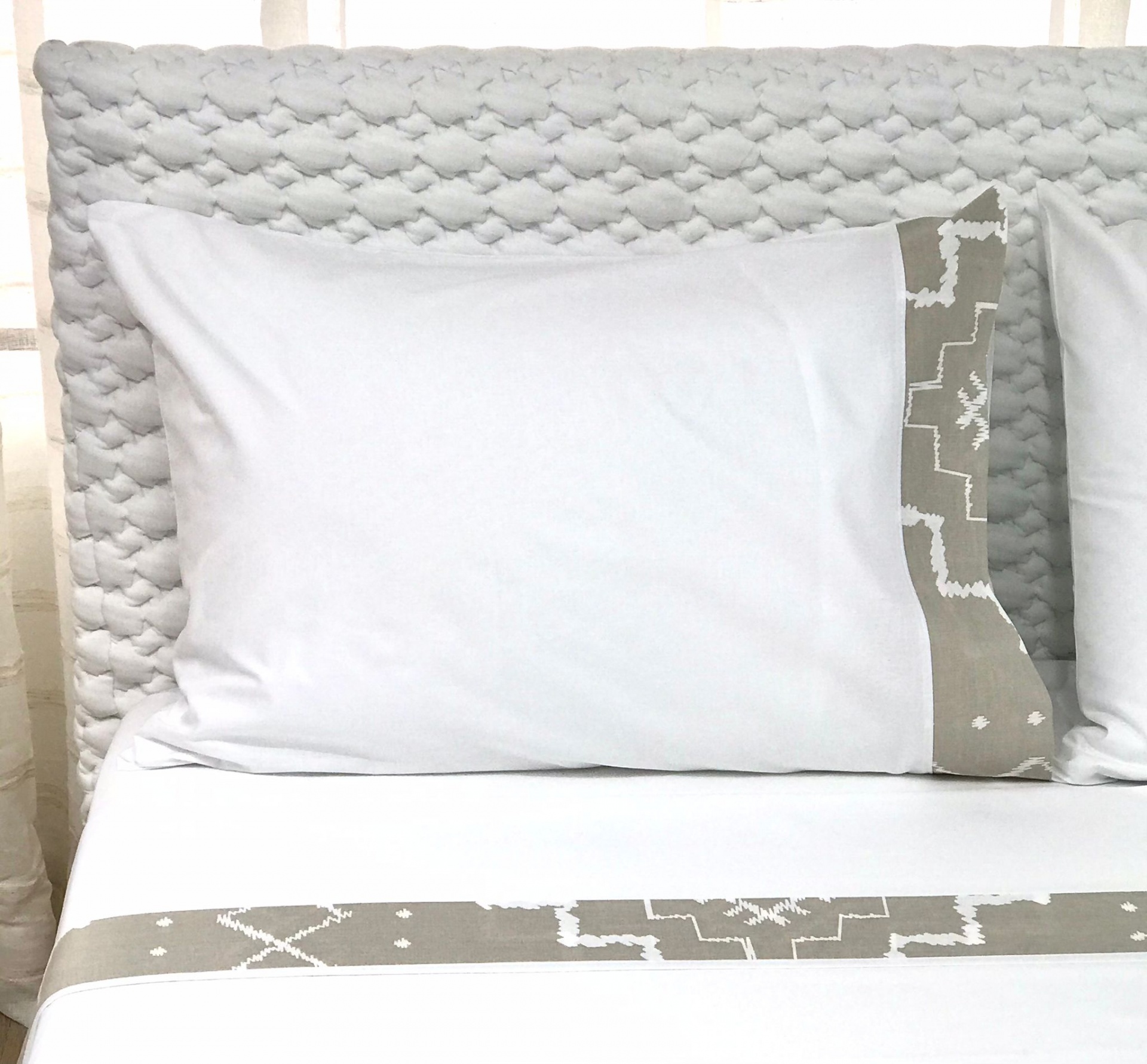 Jogo de lençóis branco algodão. Modelo com barra no lençol de cima e na fronha de almofada.