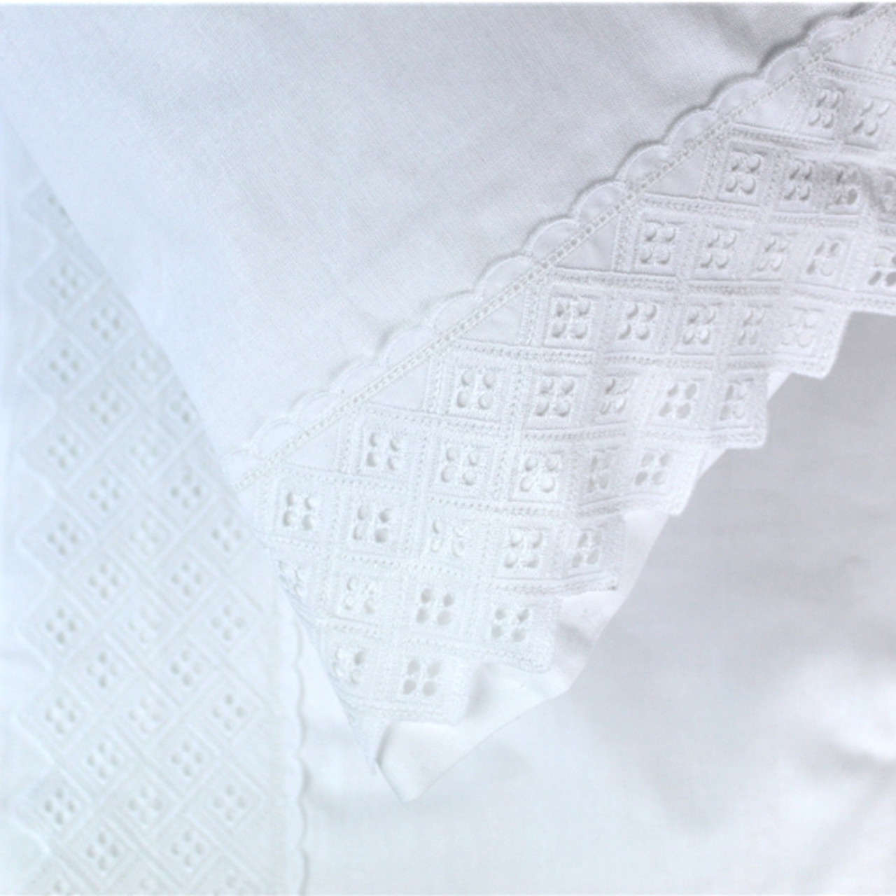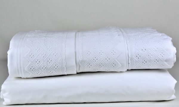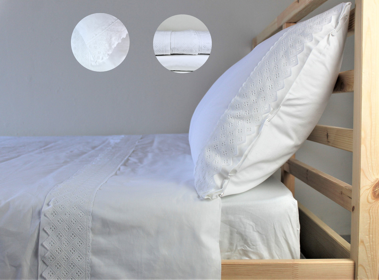 Jogo de lençóis algodão. Pormenor de renda no lençol de cima e fronha de almofada.