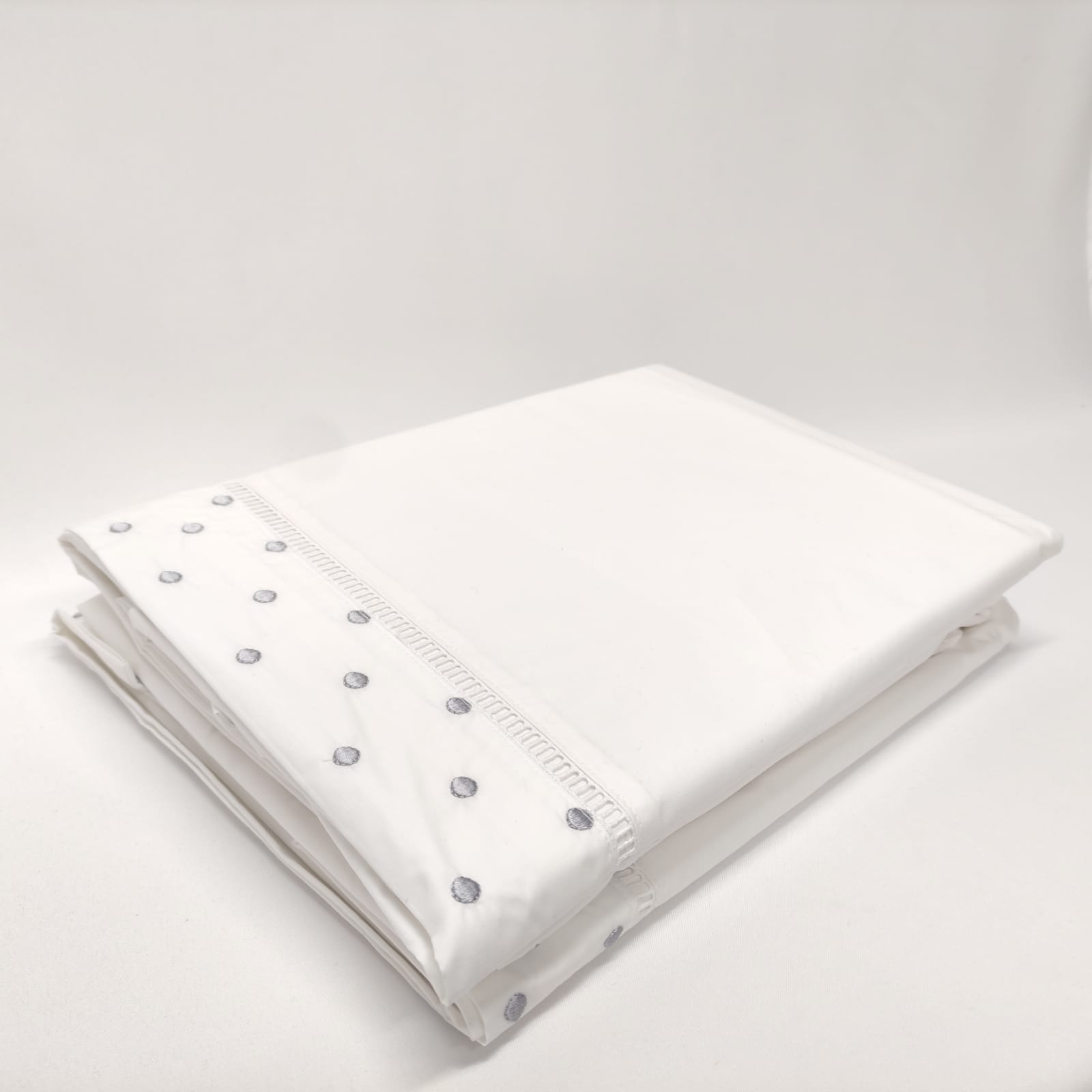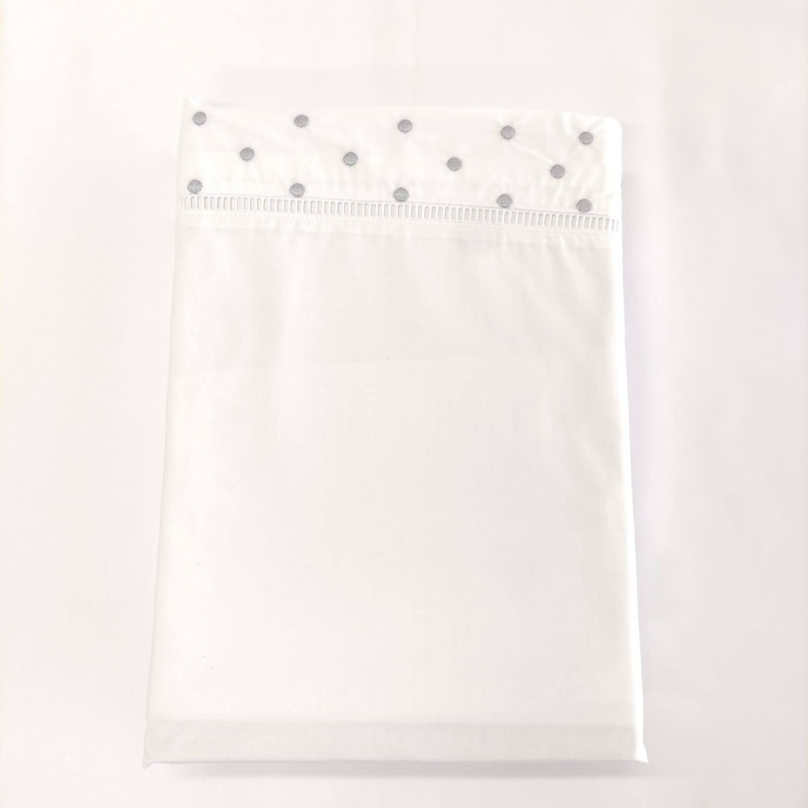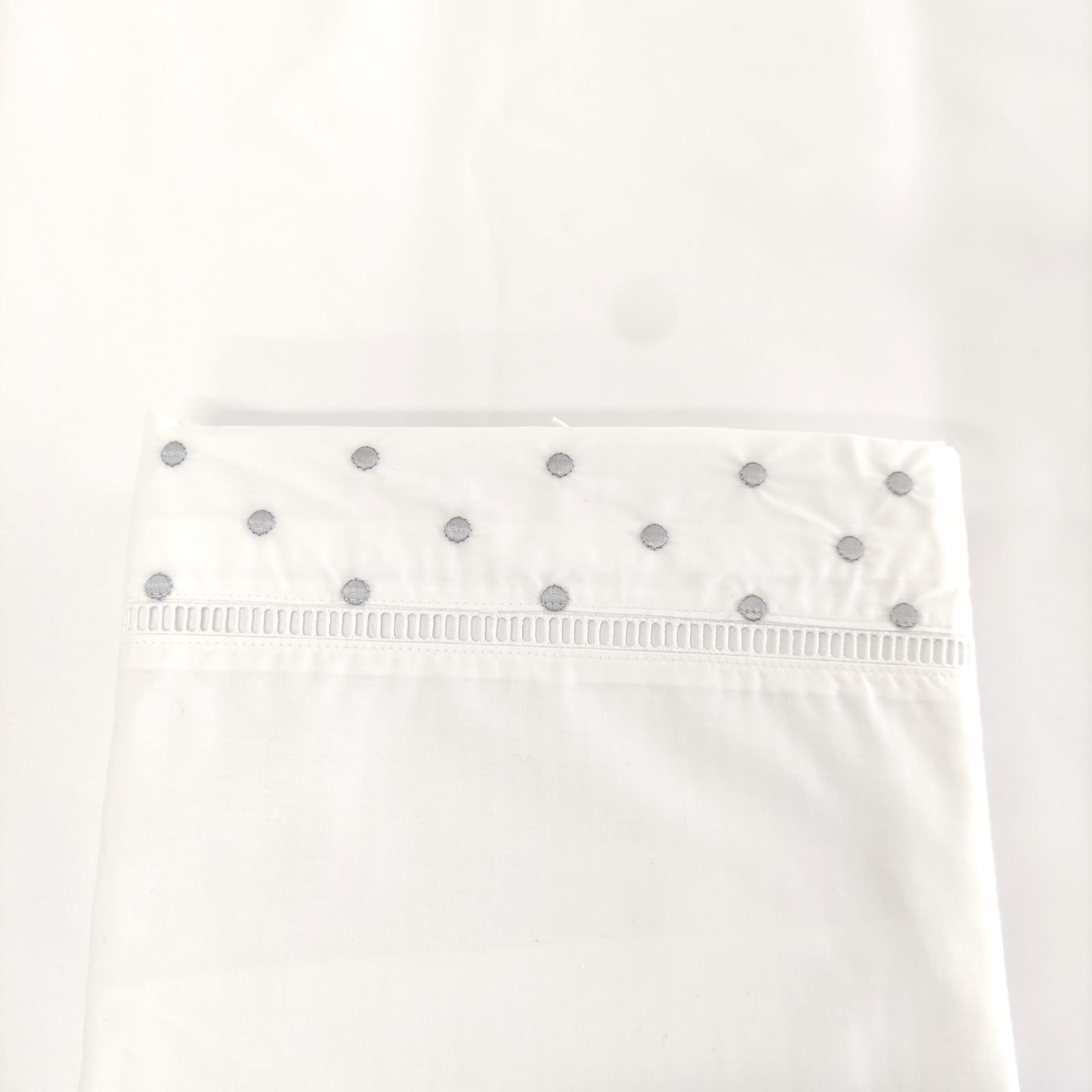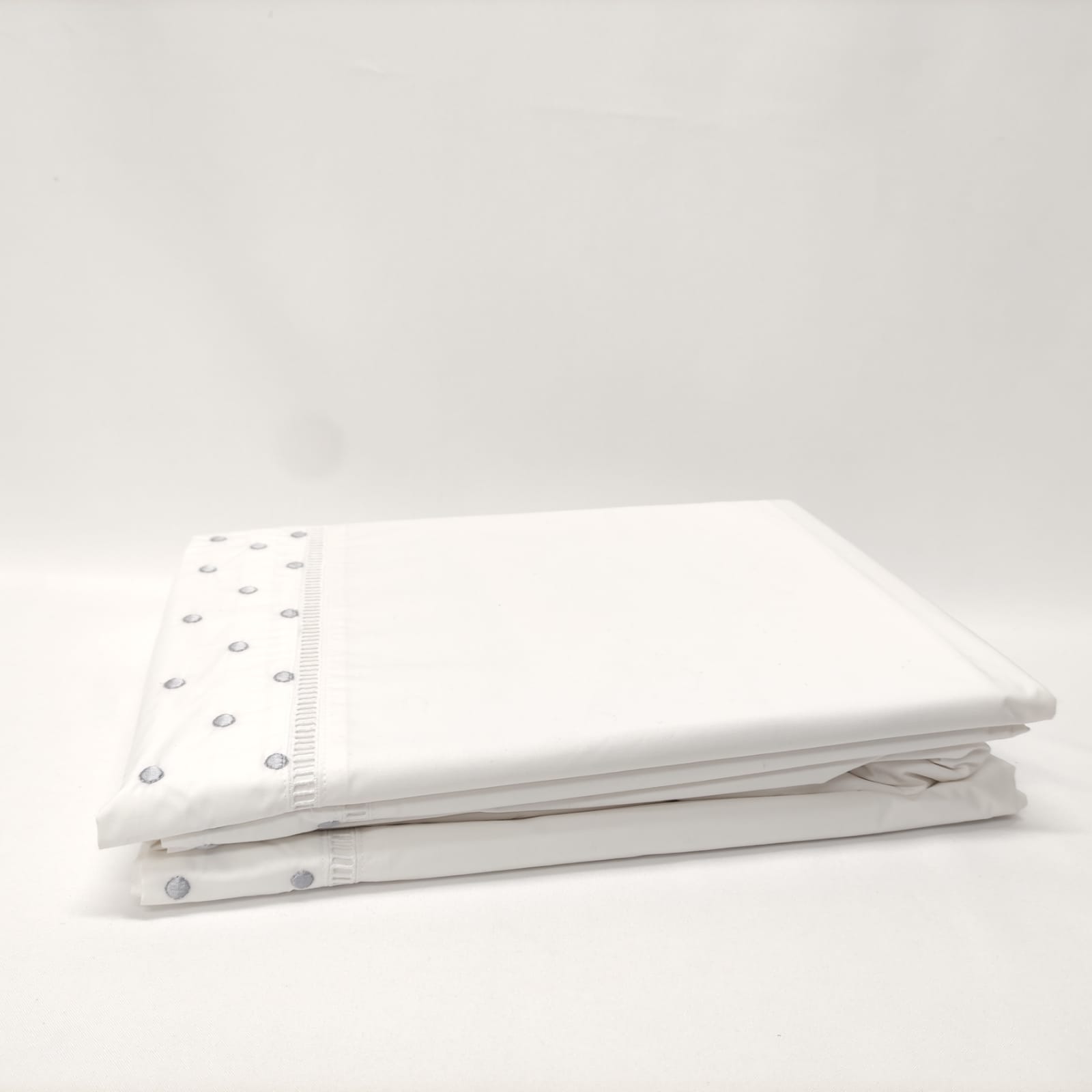 Jogo de lençóis algodão. Detalhe em ponto escadote e bolas no lençol de cima e fronha de almofada.