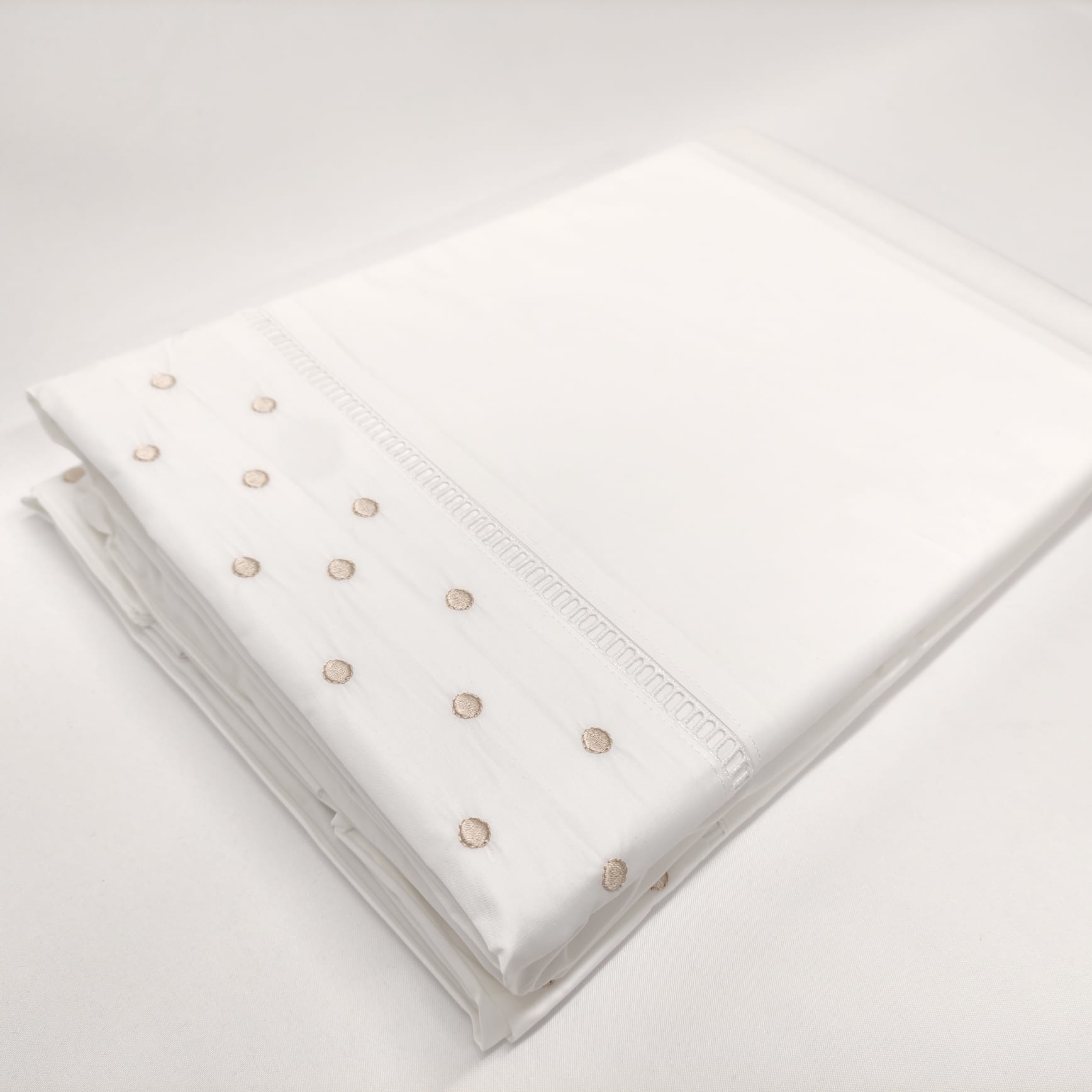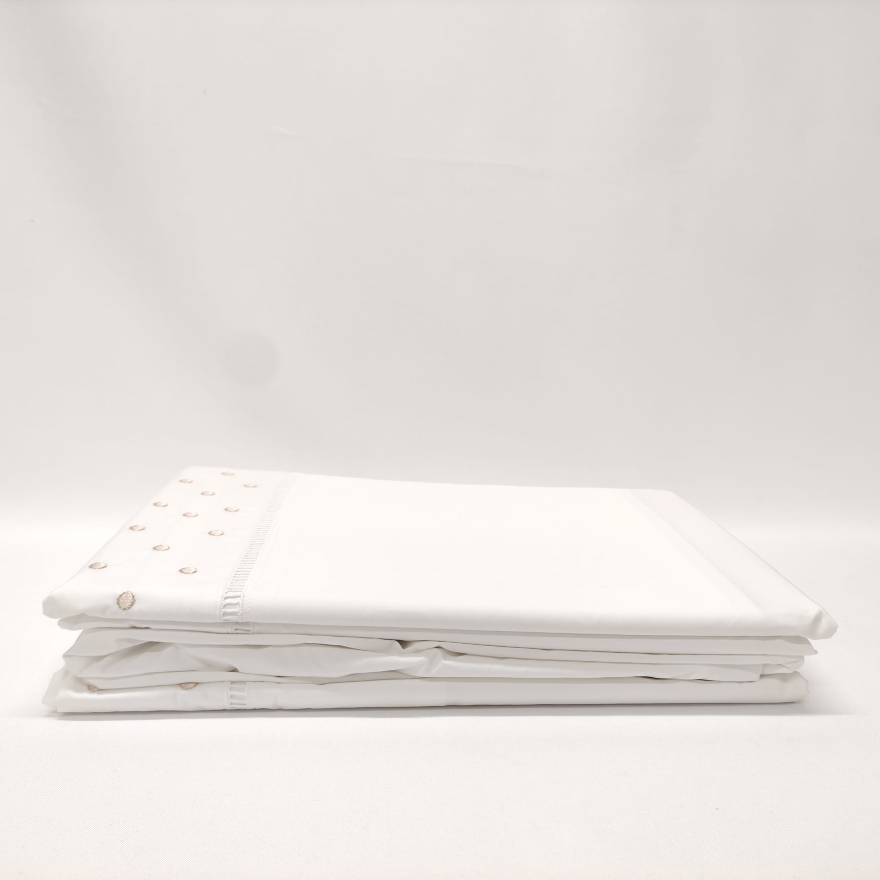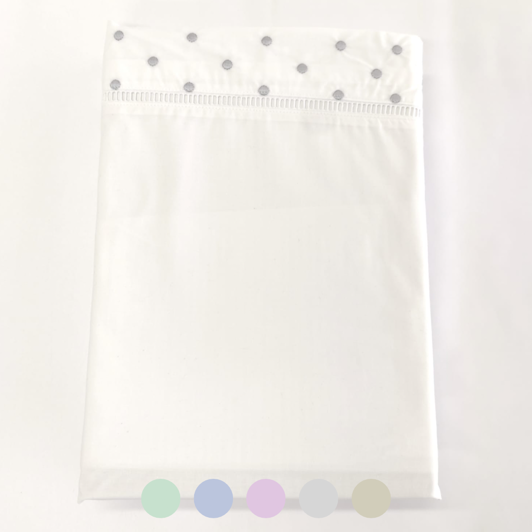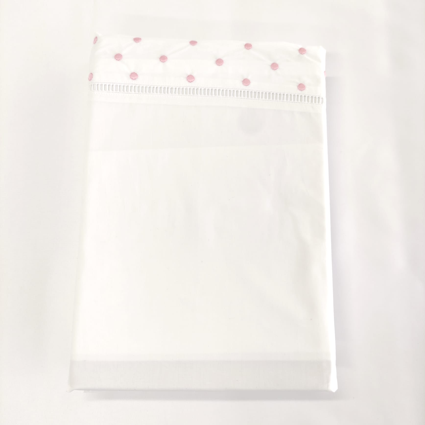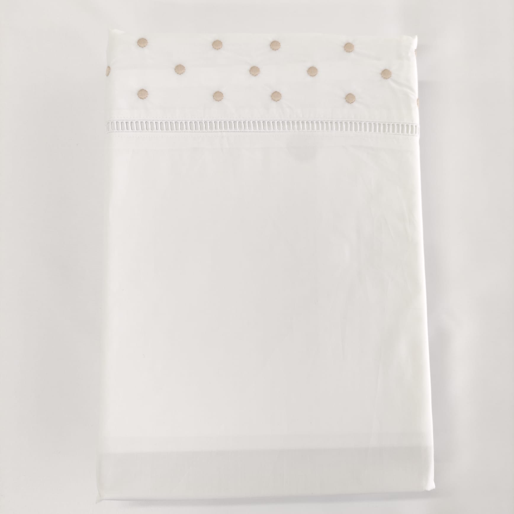 Jogo de lençóis algodão. Detalhe em ponto escadote e bolas no lençol de cima e fronha de almofada.