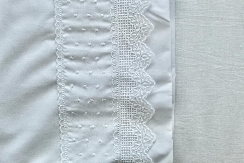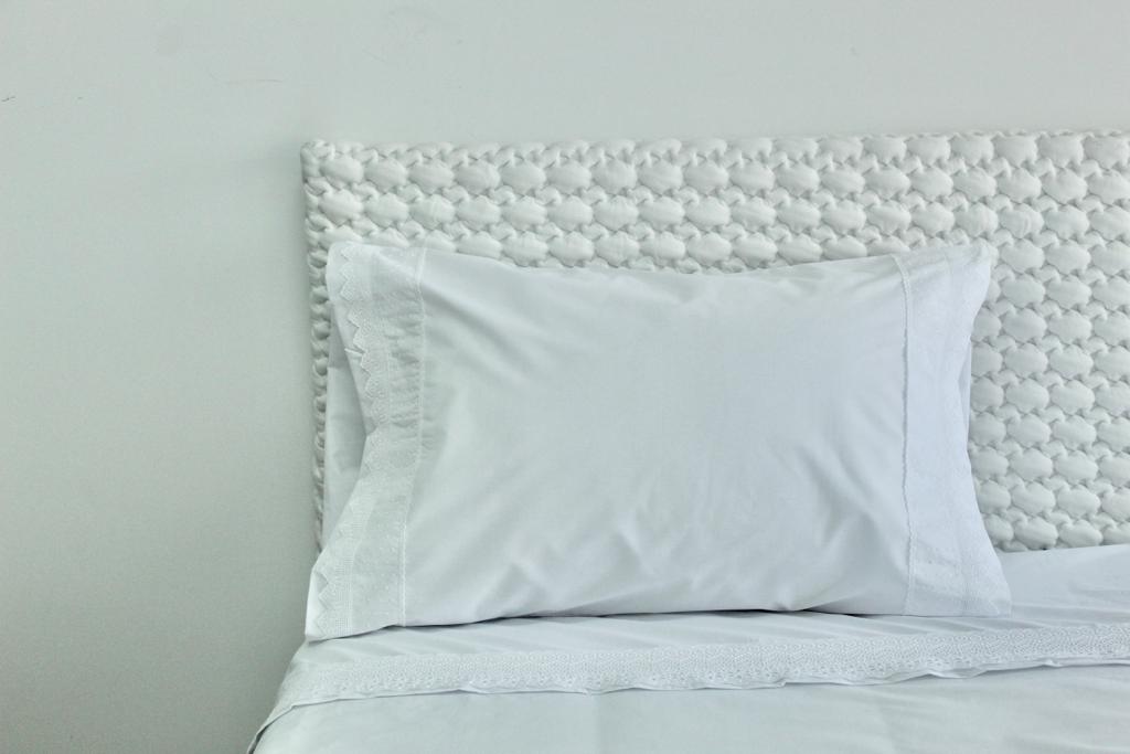 Jogo de lençóis algodão. Pormenor de renda no lençol de cima e fronha de almofada.
