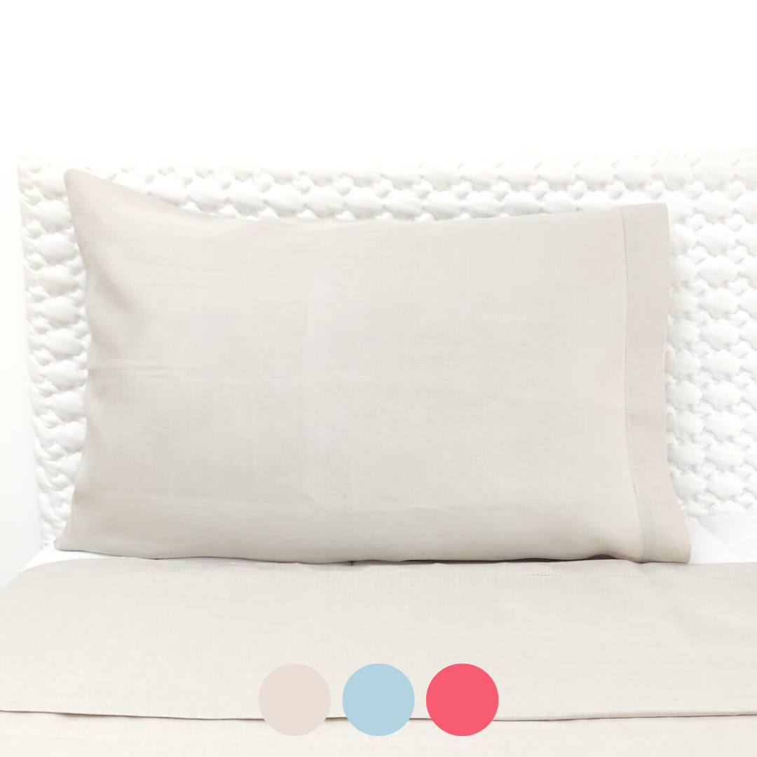 Conjunto de Lençóis Denver, em linho de alta qualidade e com o acabamento em ponto-aberto, disponível em linho pérola, azul e coral. A opção perfeita para quem procura noites tranquilas e confortáveis.