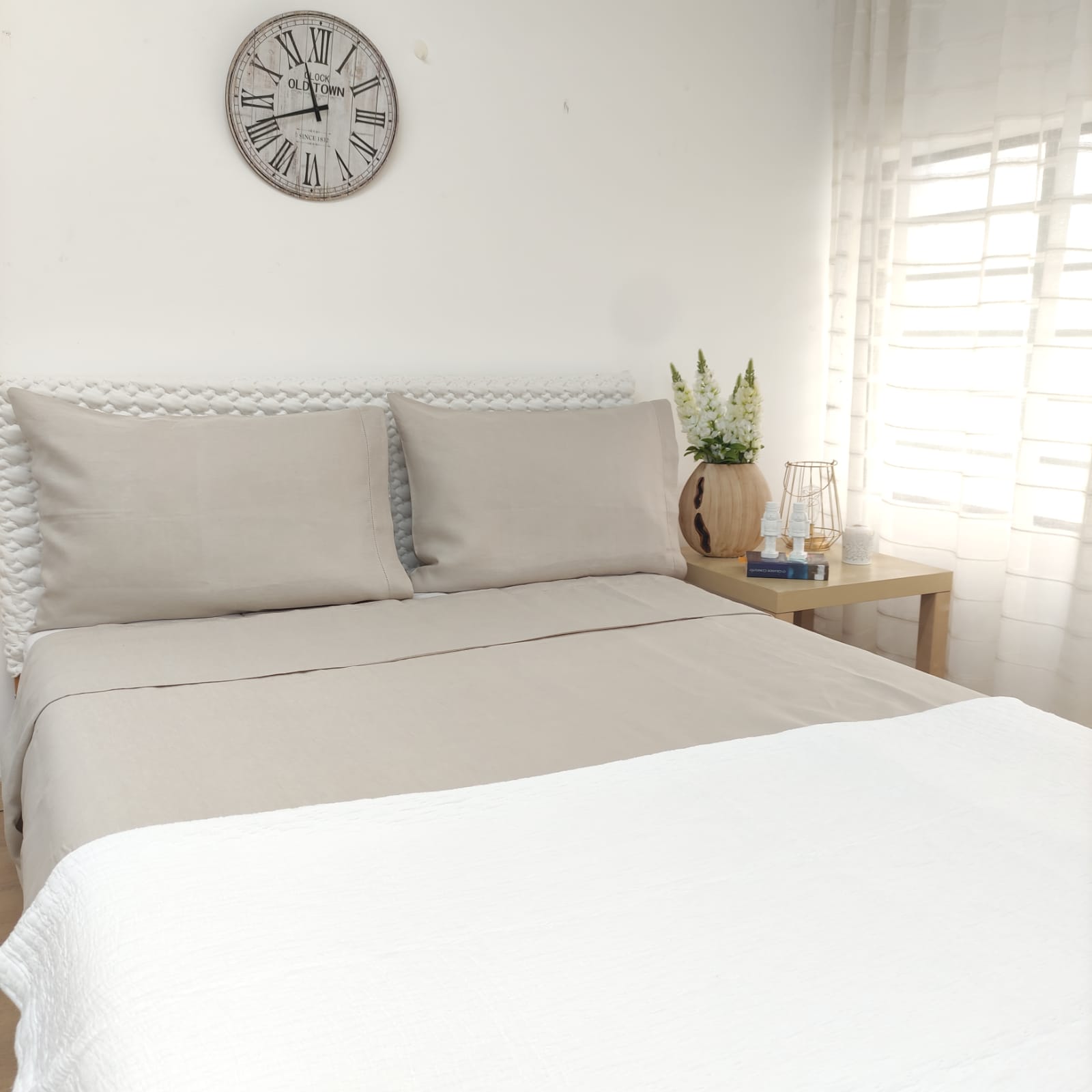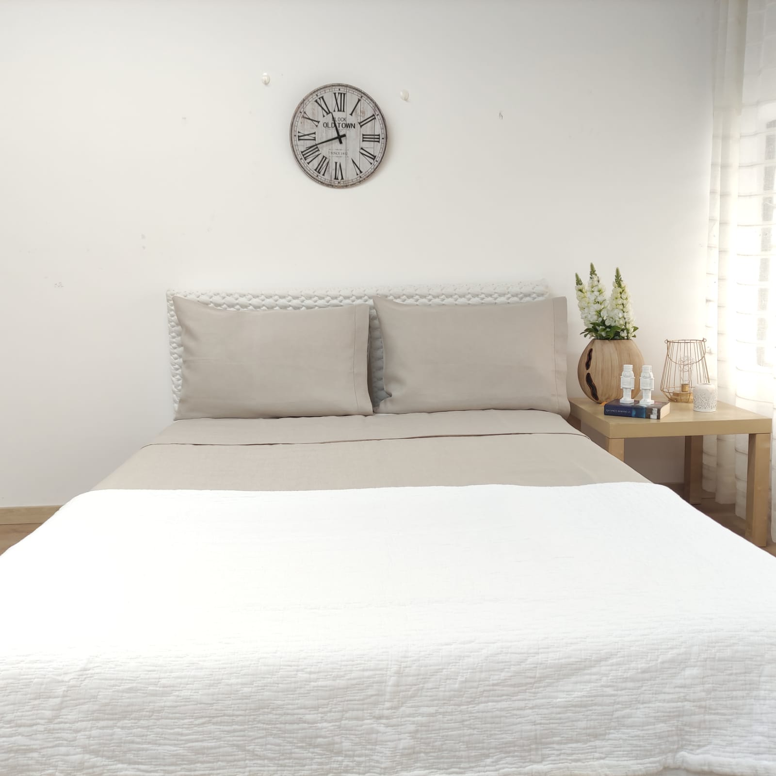 - Cama 140 (Casal) - 1 lençol de baixo com elástico (140x200cm) com mais 30cm de altura + 1 lençol de cima (210x280cm) + 2 fronhas de almofada (50x70cm)