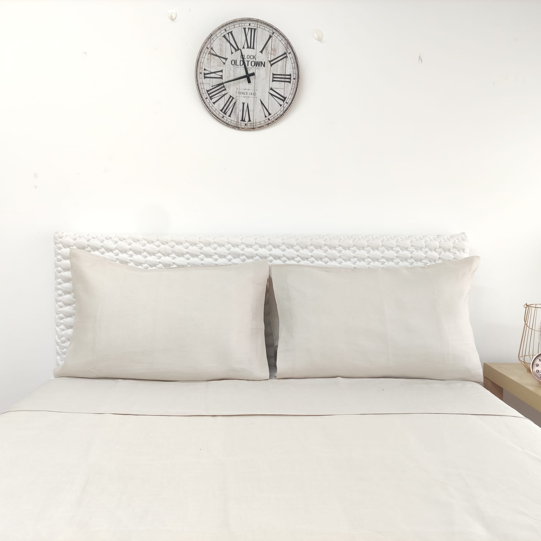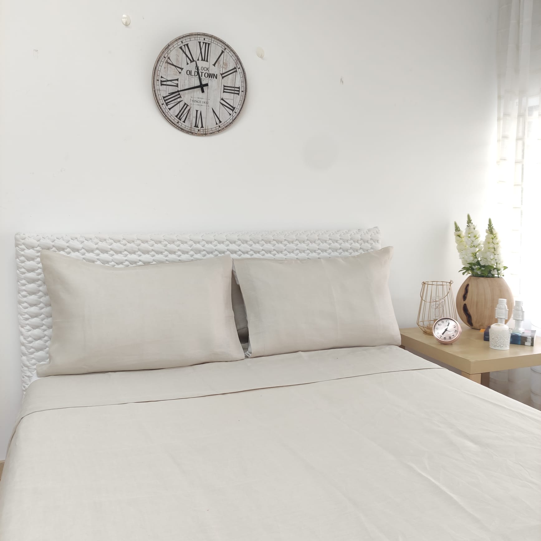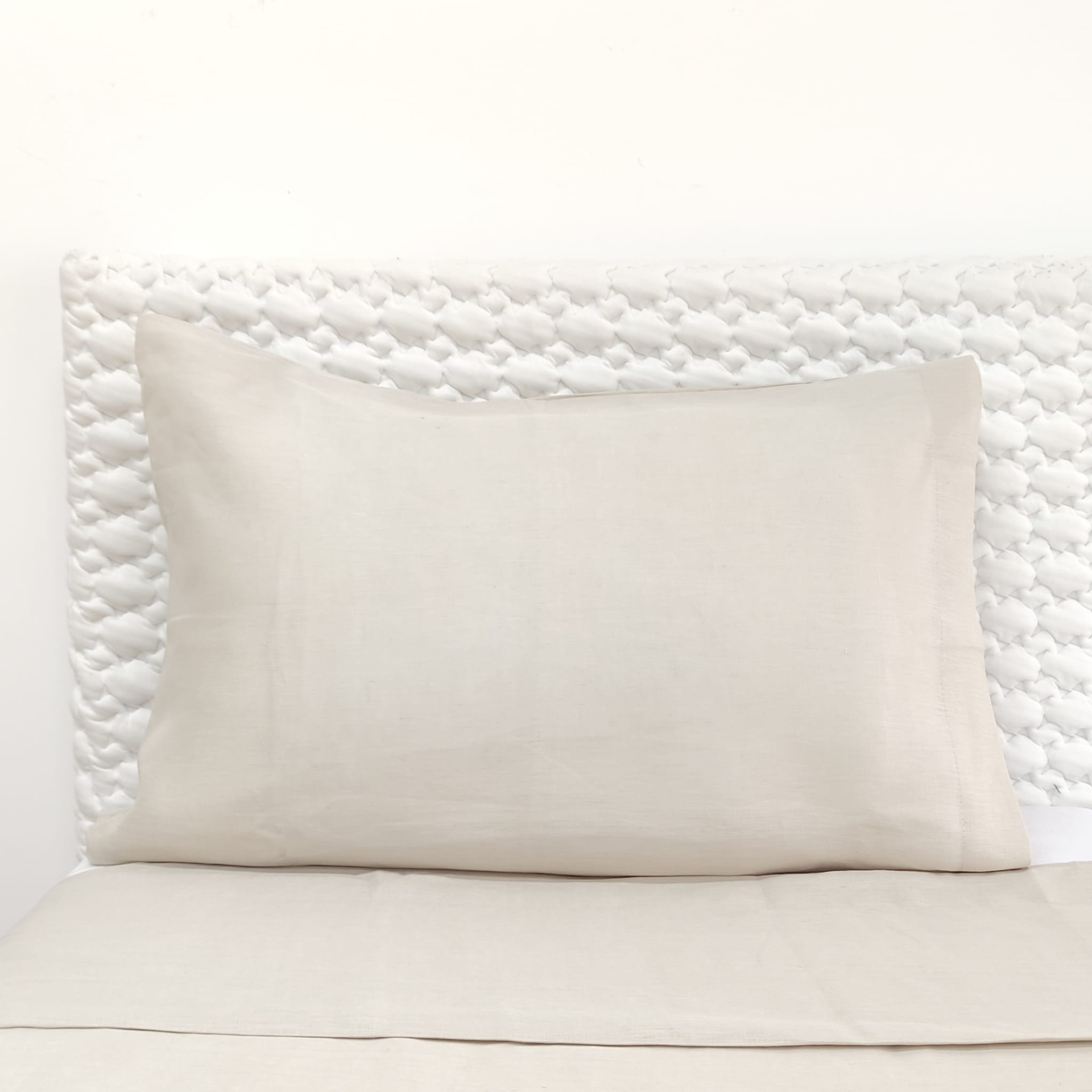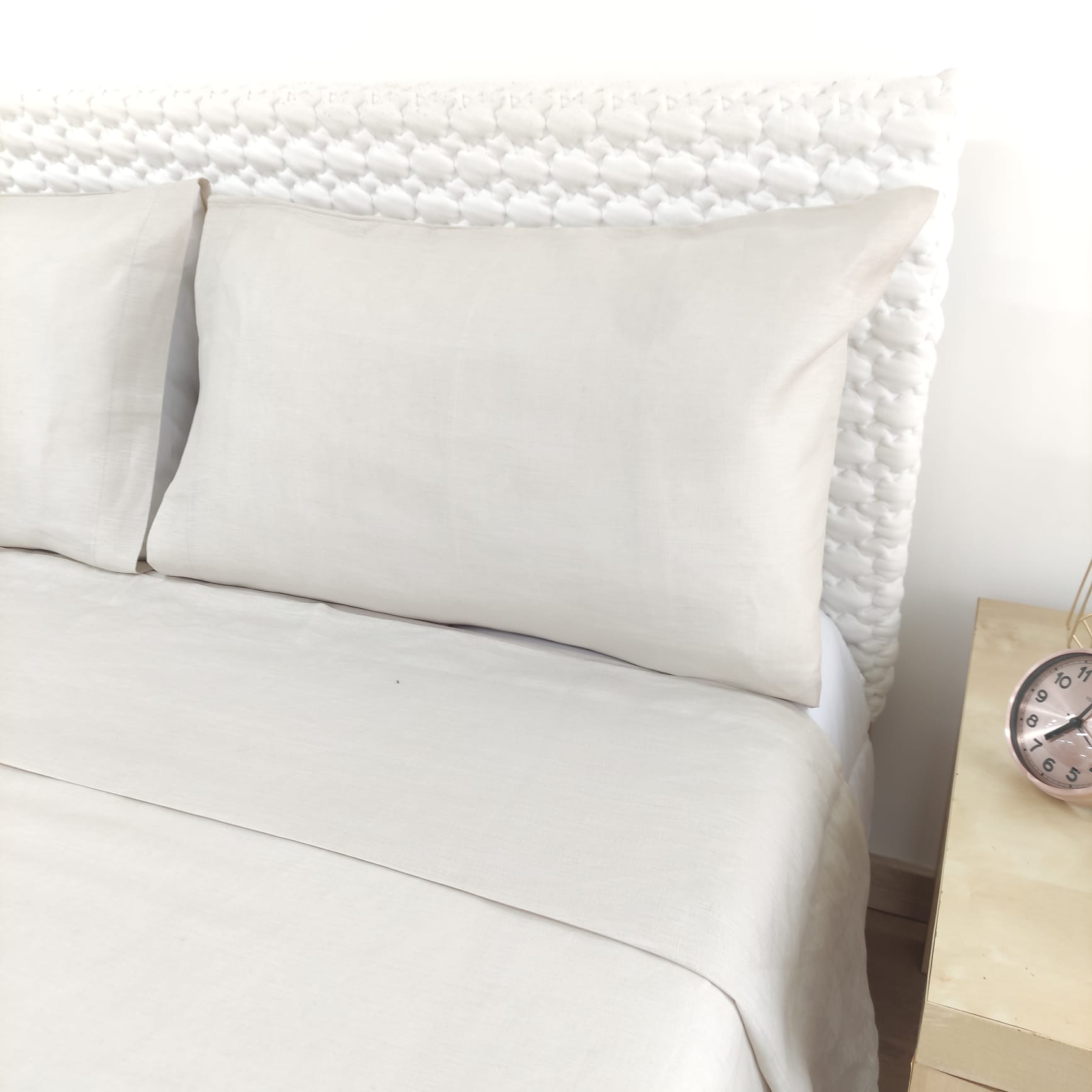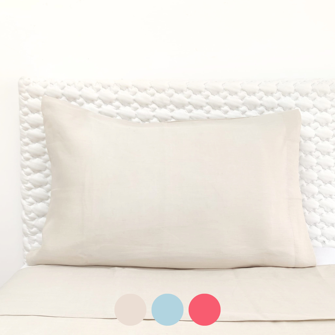 Conjunto de Lençóis Talin, em linho de alta qualidade, disponível em linho pérola, azul e coral. A opção perfeita para quem procura noites tranquilas e confortáveis.