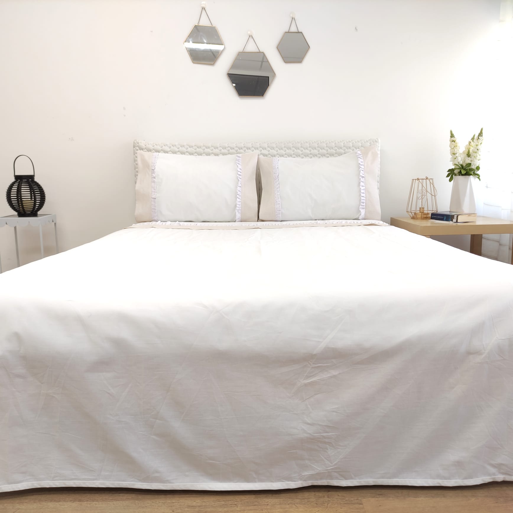 - Cama 200 (King Size) - 1 lençol de baixo com elástico (200x200cm) com mais 30cm de altura + 1 lençol de cima (280x280cm) + 2 fronhas de almofada (50x75cm)