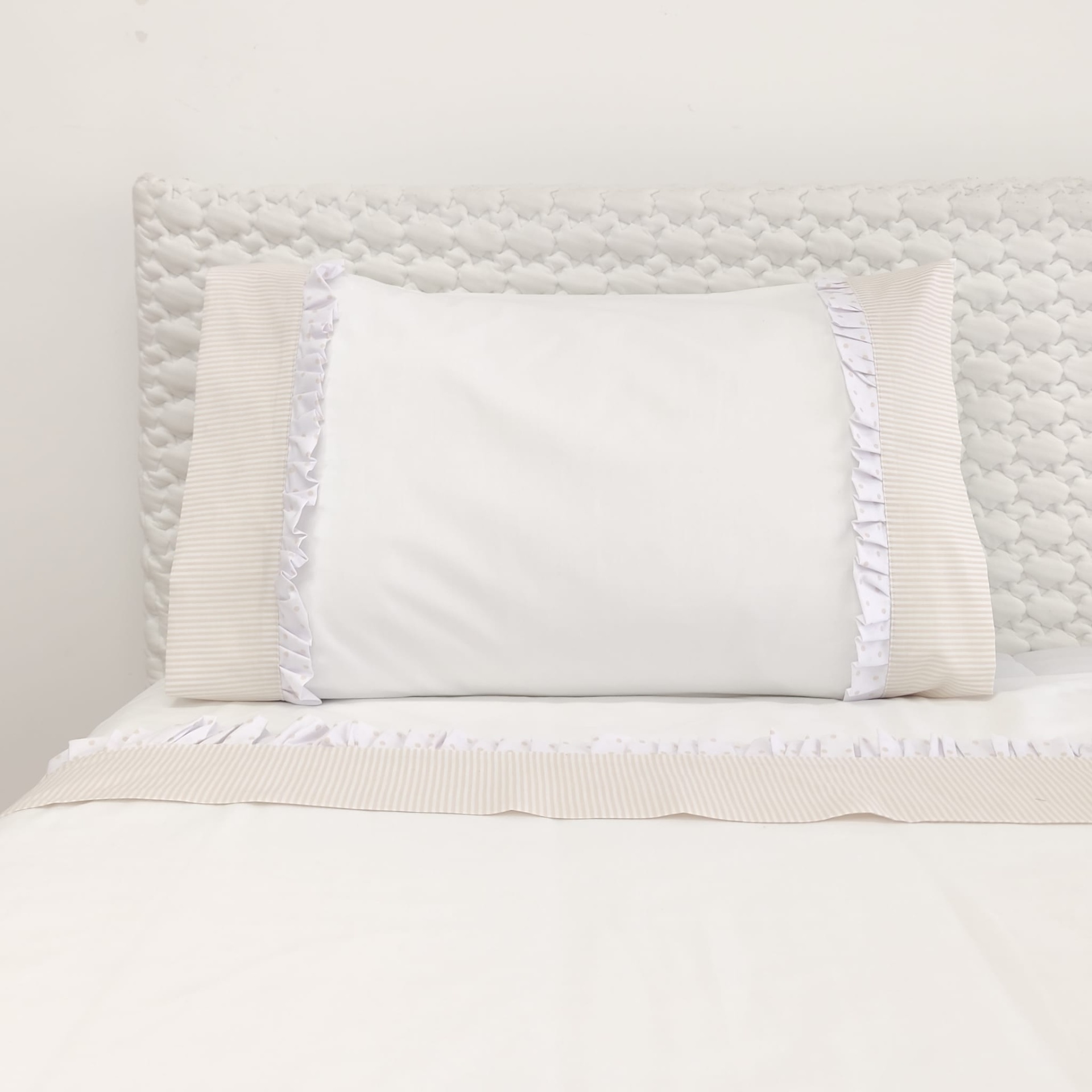 Jogo de lençóis algodão. Modelo liso, de cor branca com barra colorida e pormenor em folho.