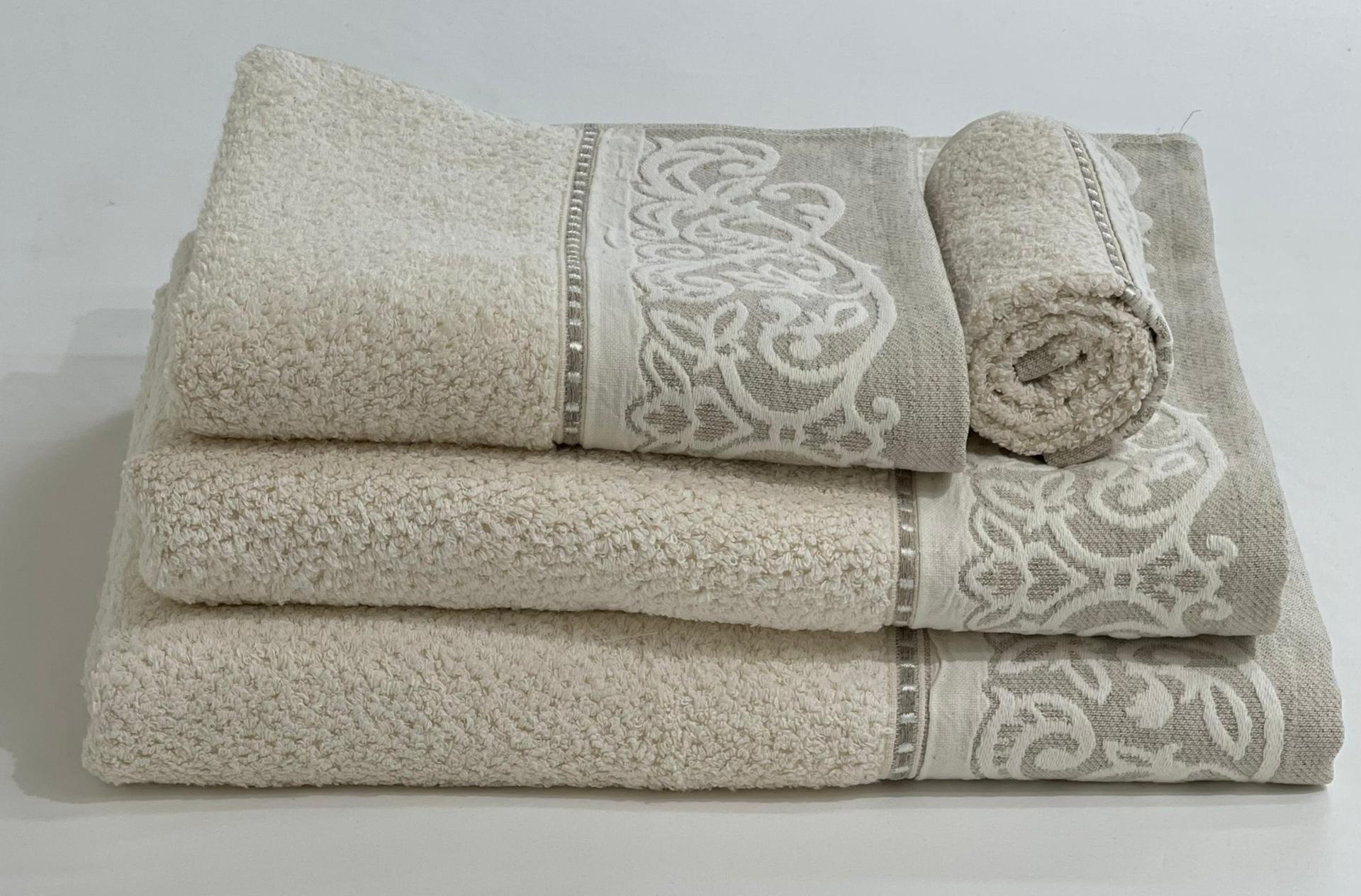 Conjunto de toalhas bege com bordado ornamental cinza e branco