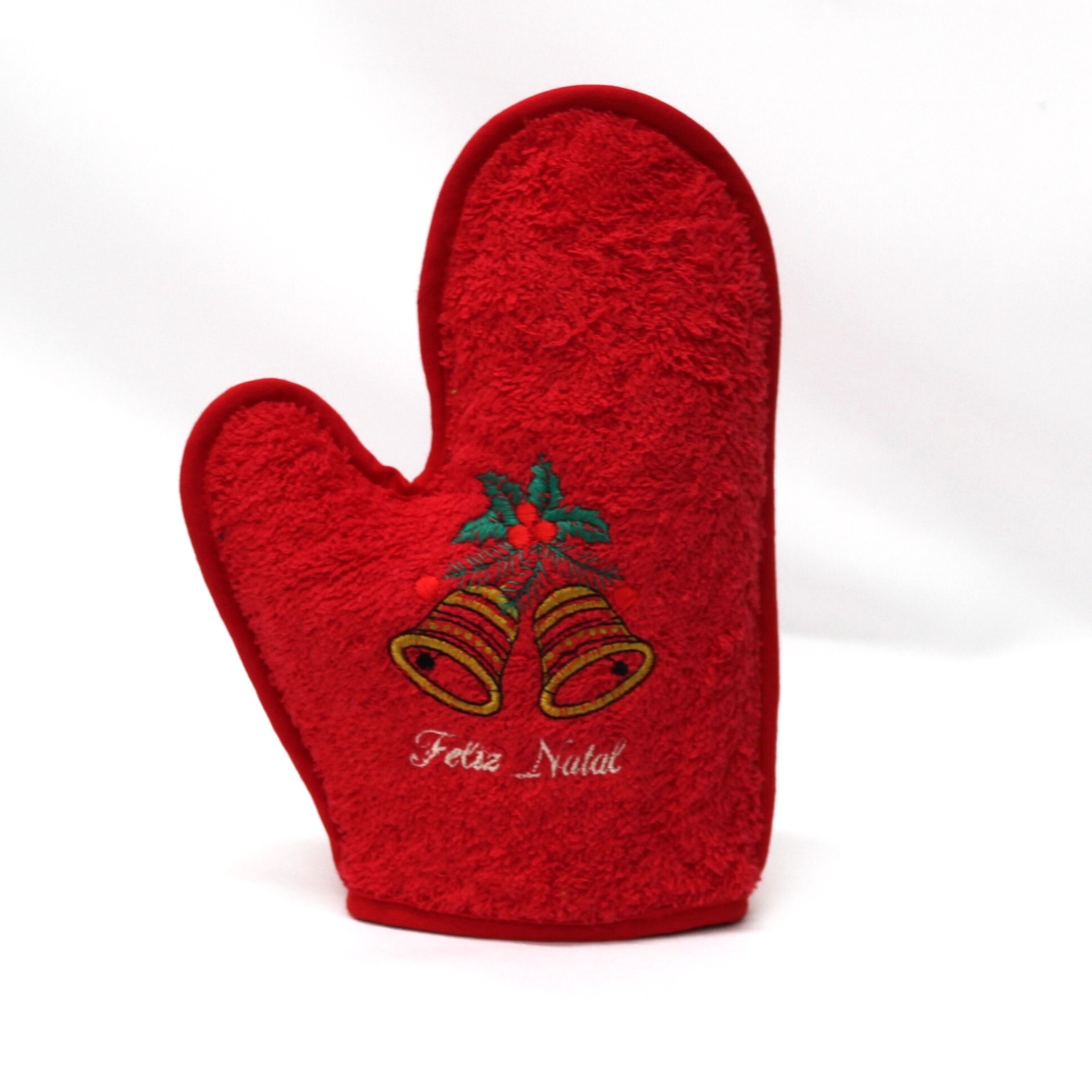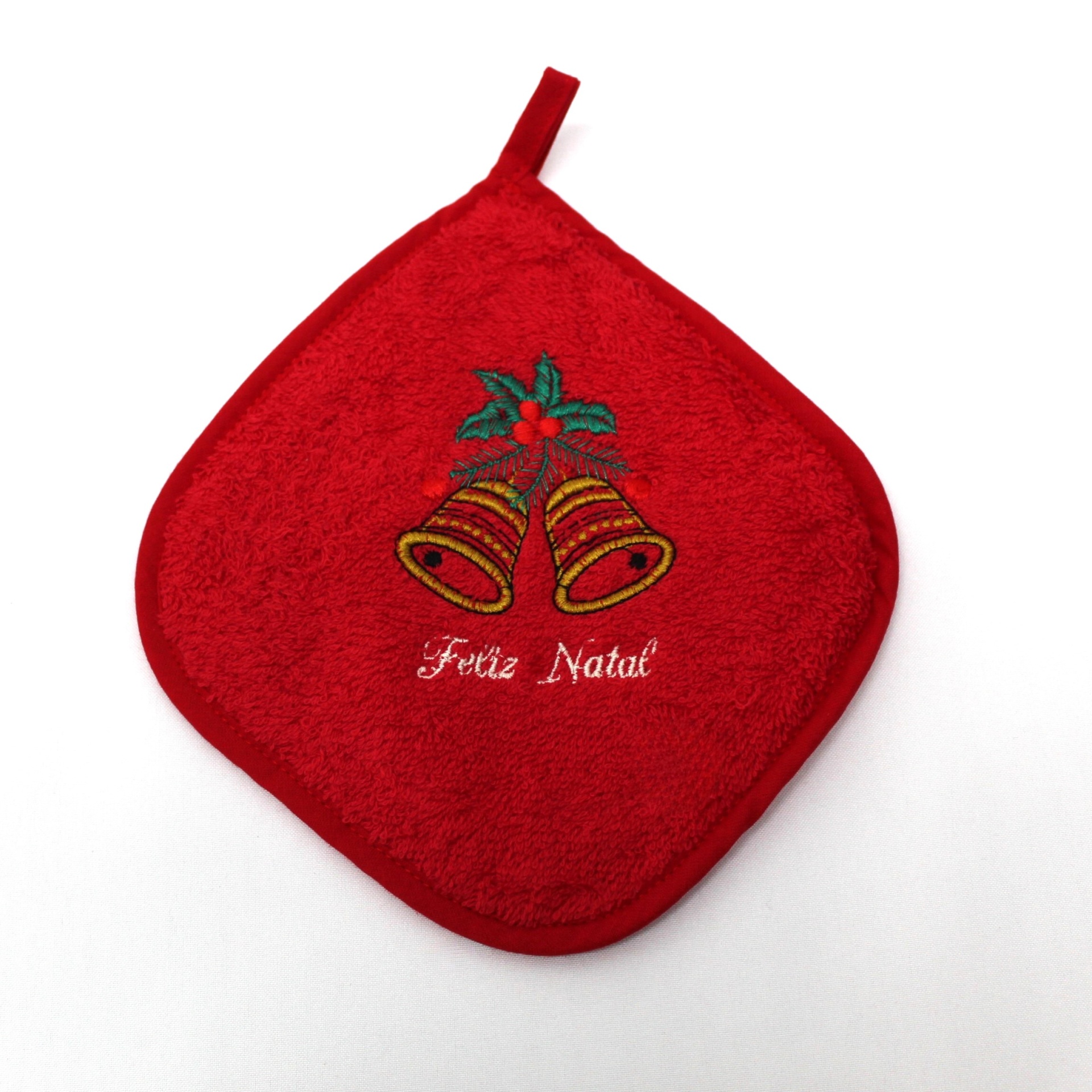 Conjunto de Pega e luva vermelho com bordado natalicio, de sinos.