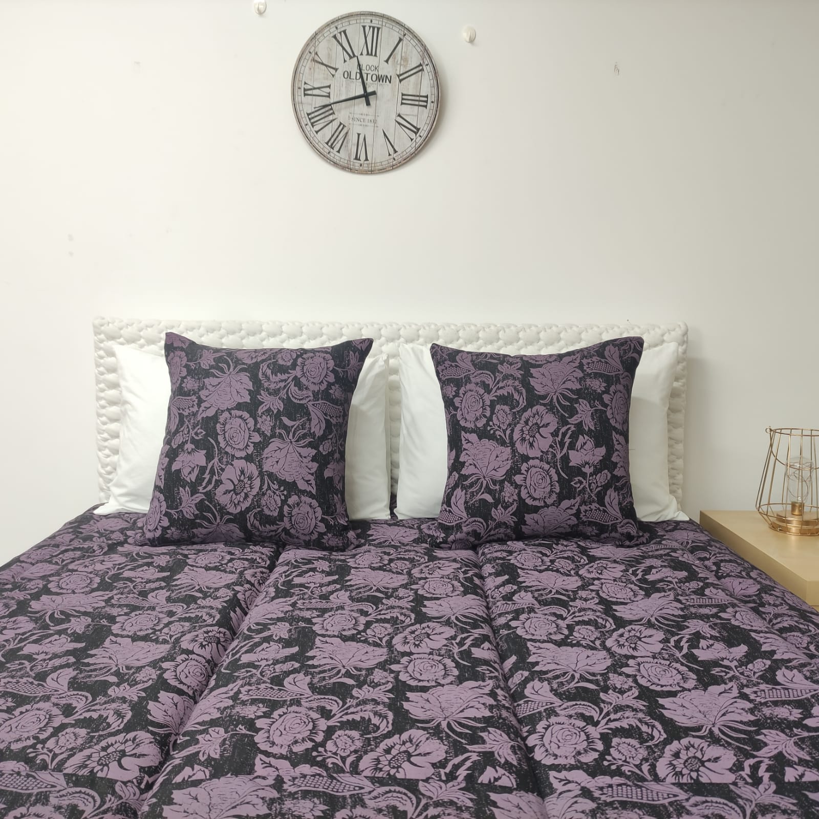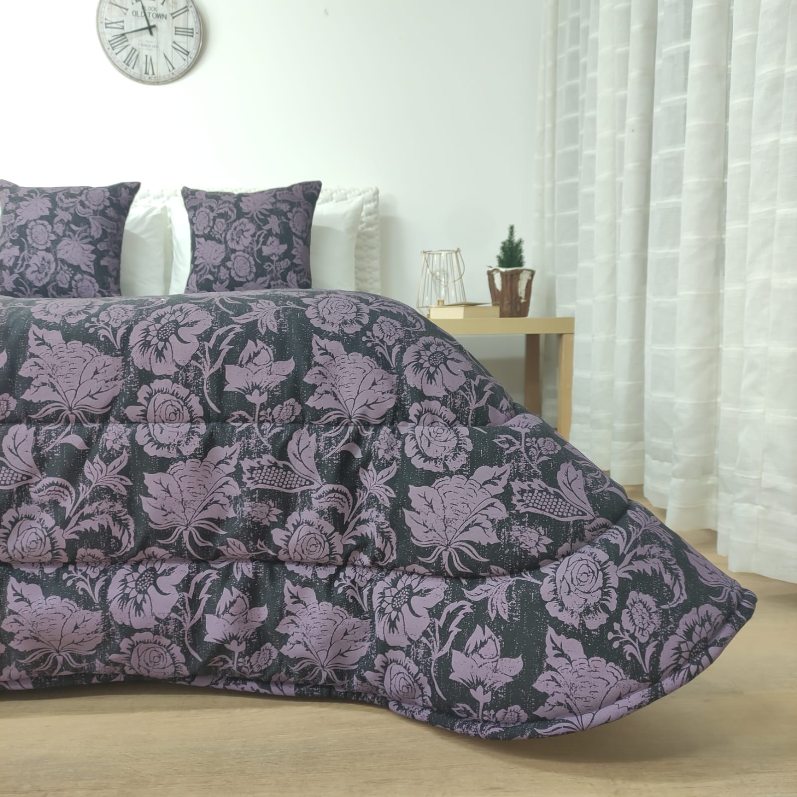 Edredão Decorativo, em algodão para assegurar a suavidade e o conforto, com um padrão sofisticado disponível em roxo, verde e cinza.