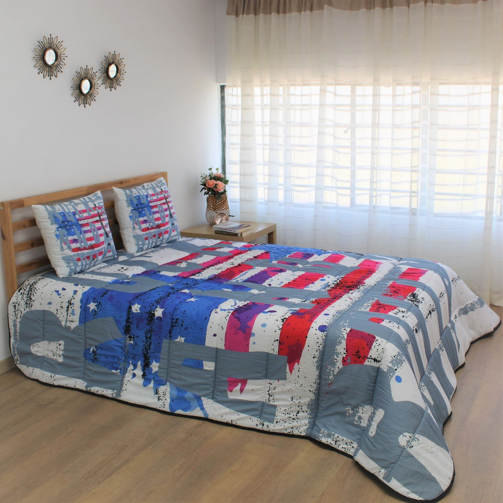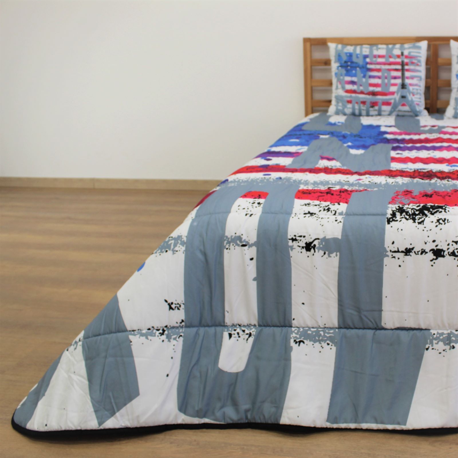 Edredão Decorativo Rock, em tons de azul, cinza e branco. Inclui 2 almofadas.