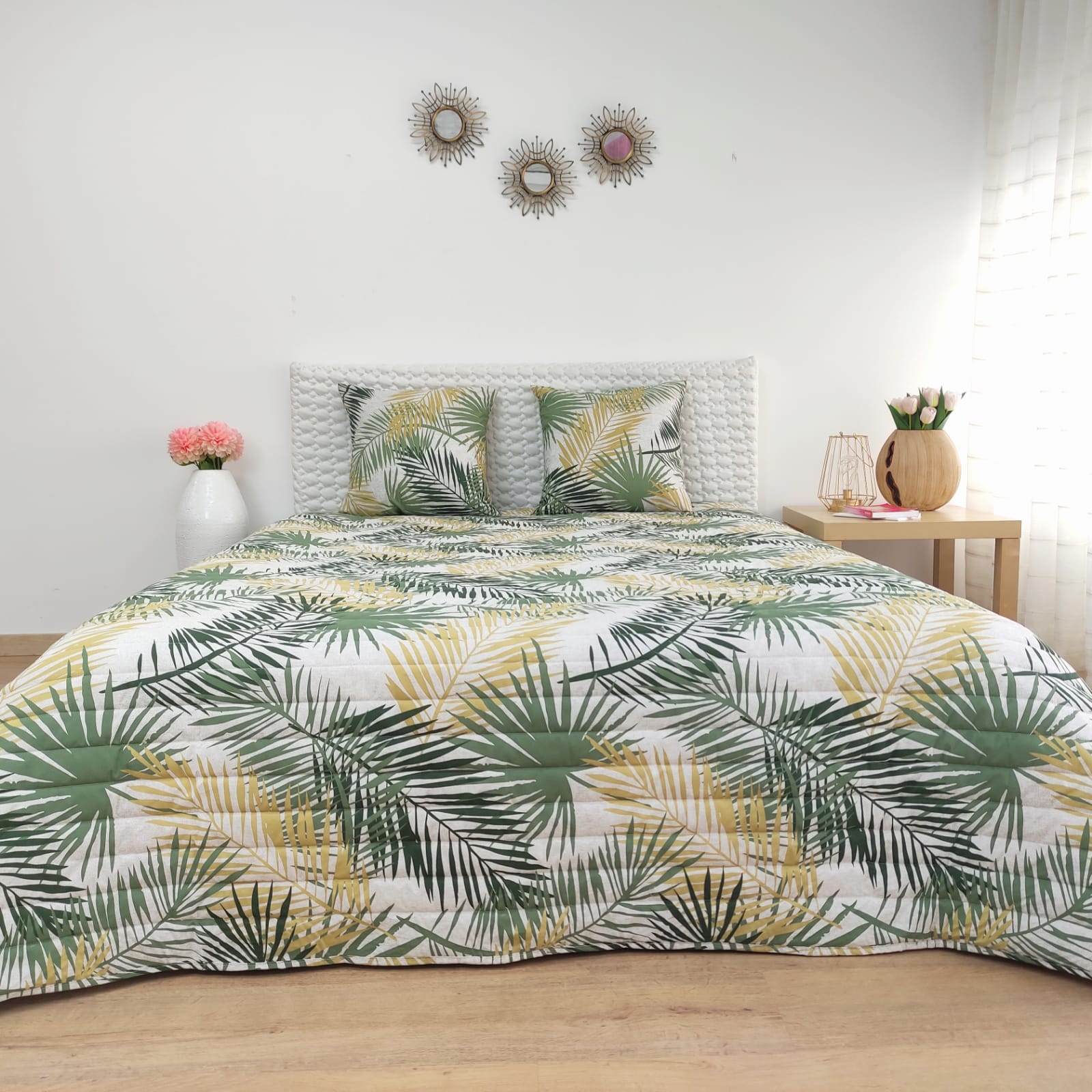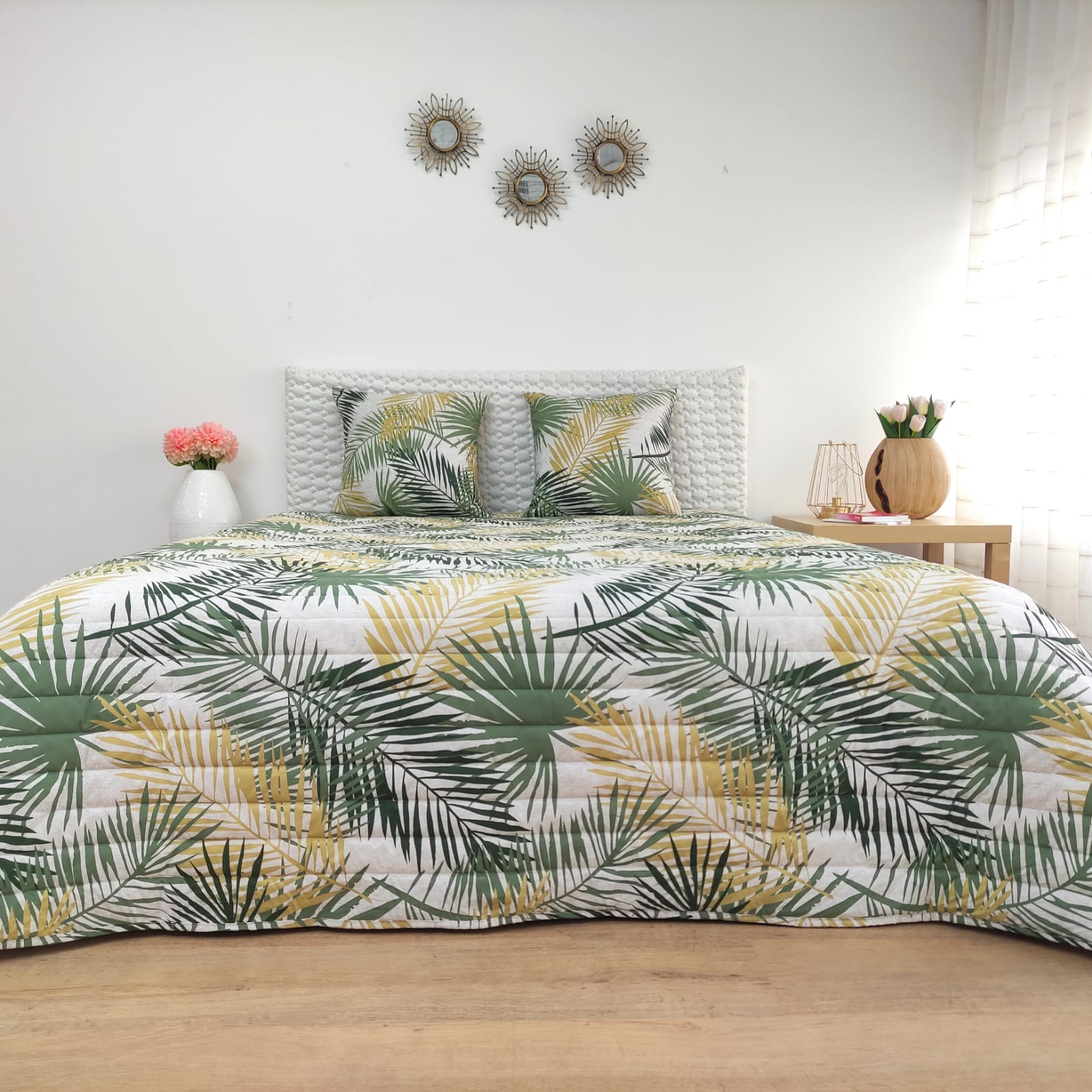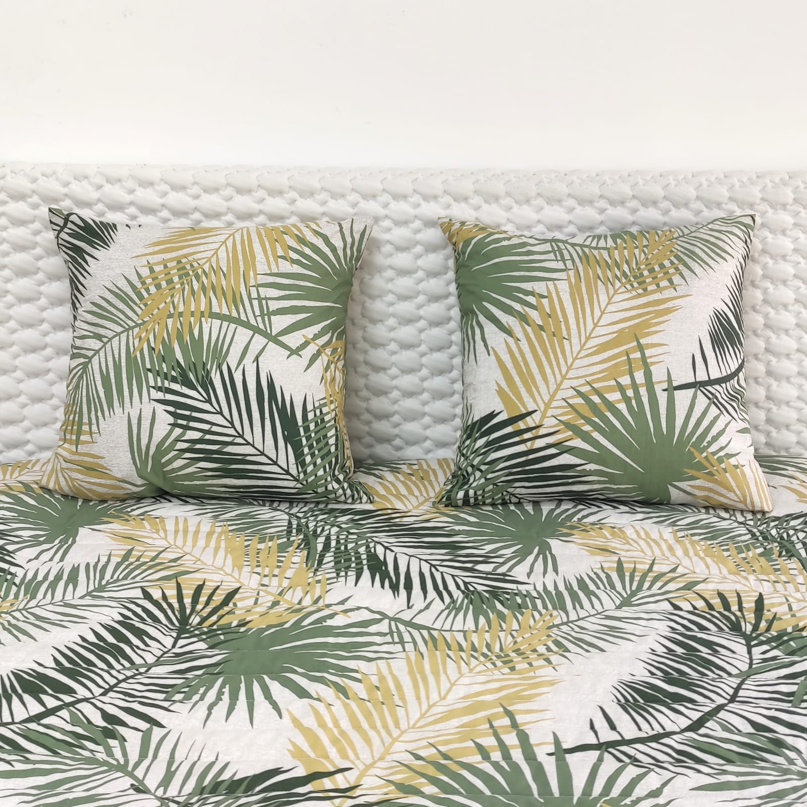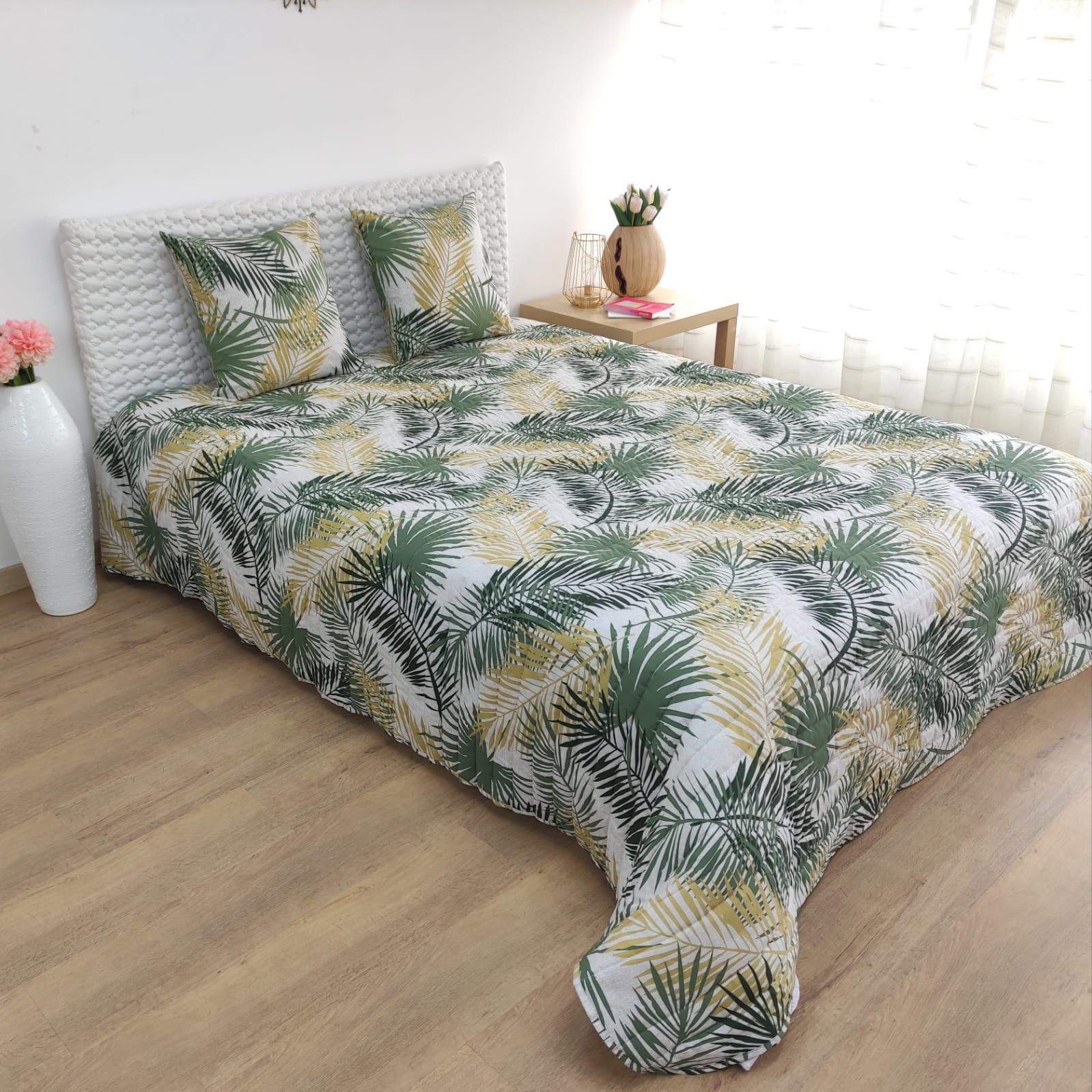 Edredão em tecido de algodão estampado com padrão exótico.