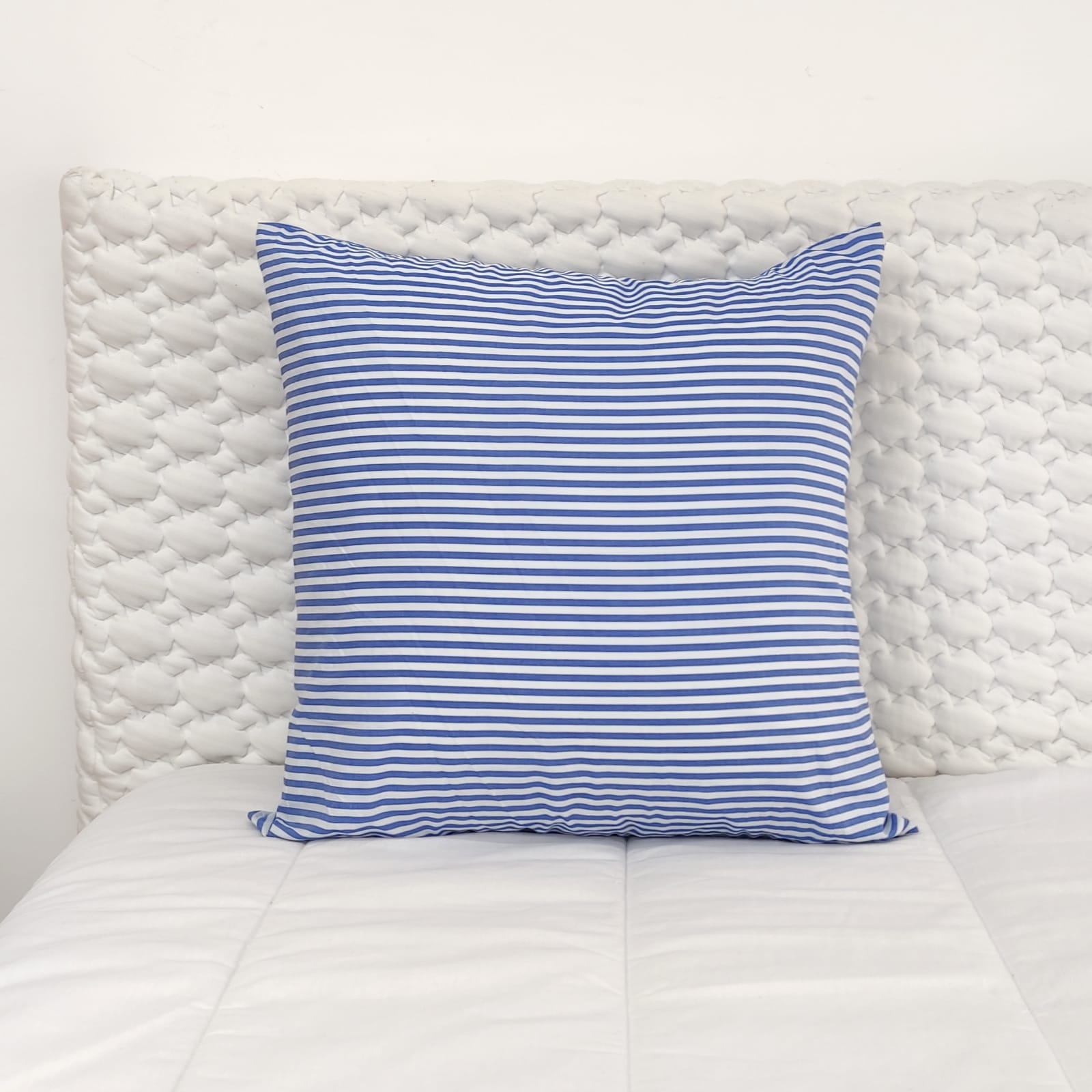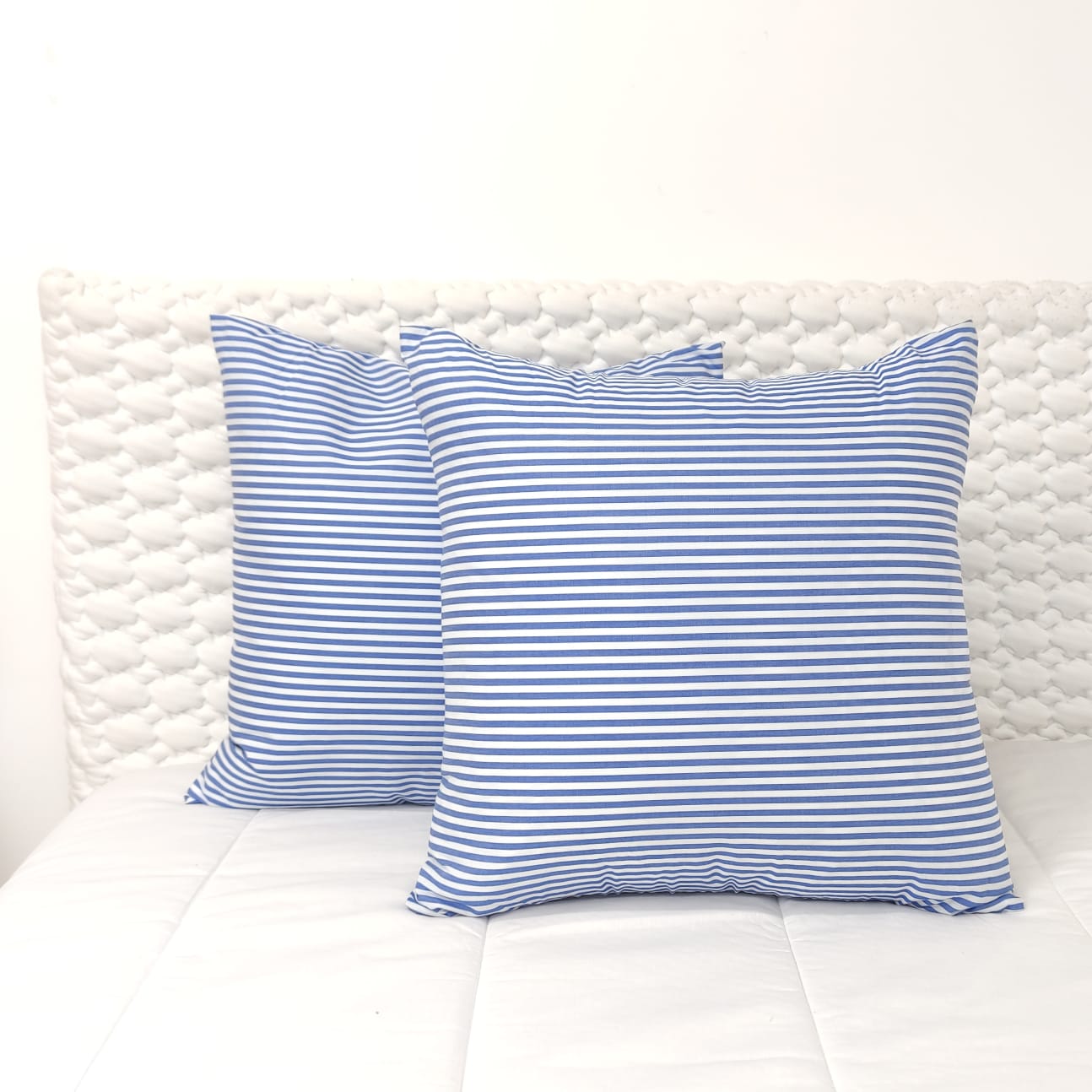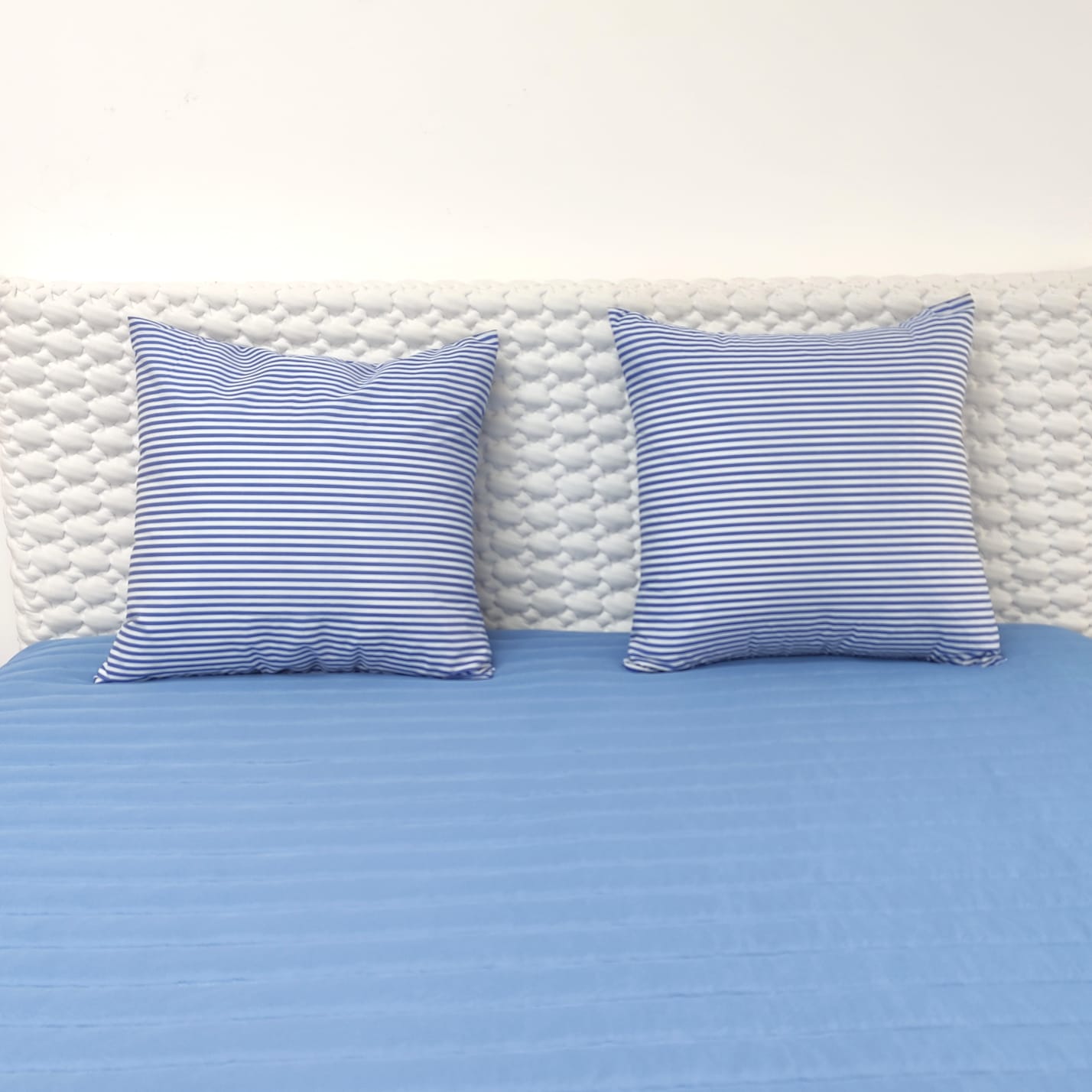 Edredão em tecido de algodão em tons azuis com riscas brancas.