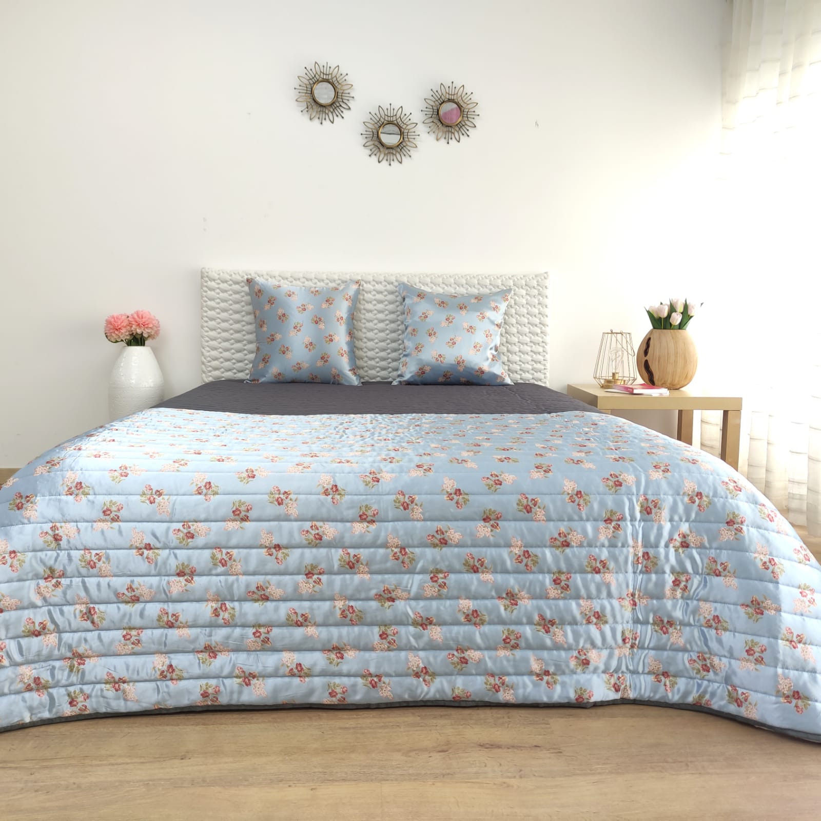 Edredão em tecido de algodão em tons azuis com detalhes de flores.