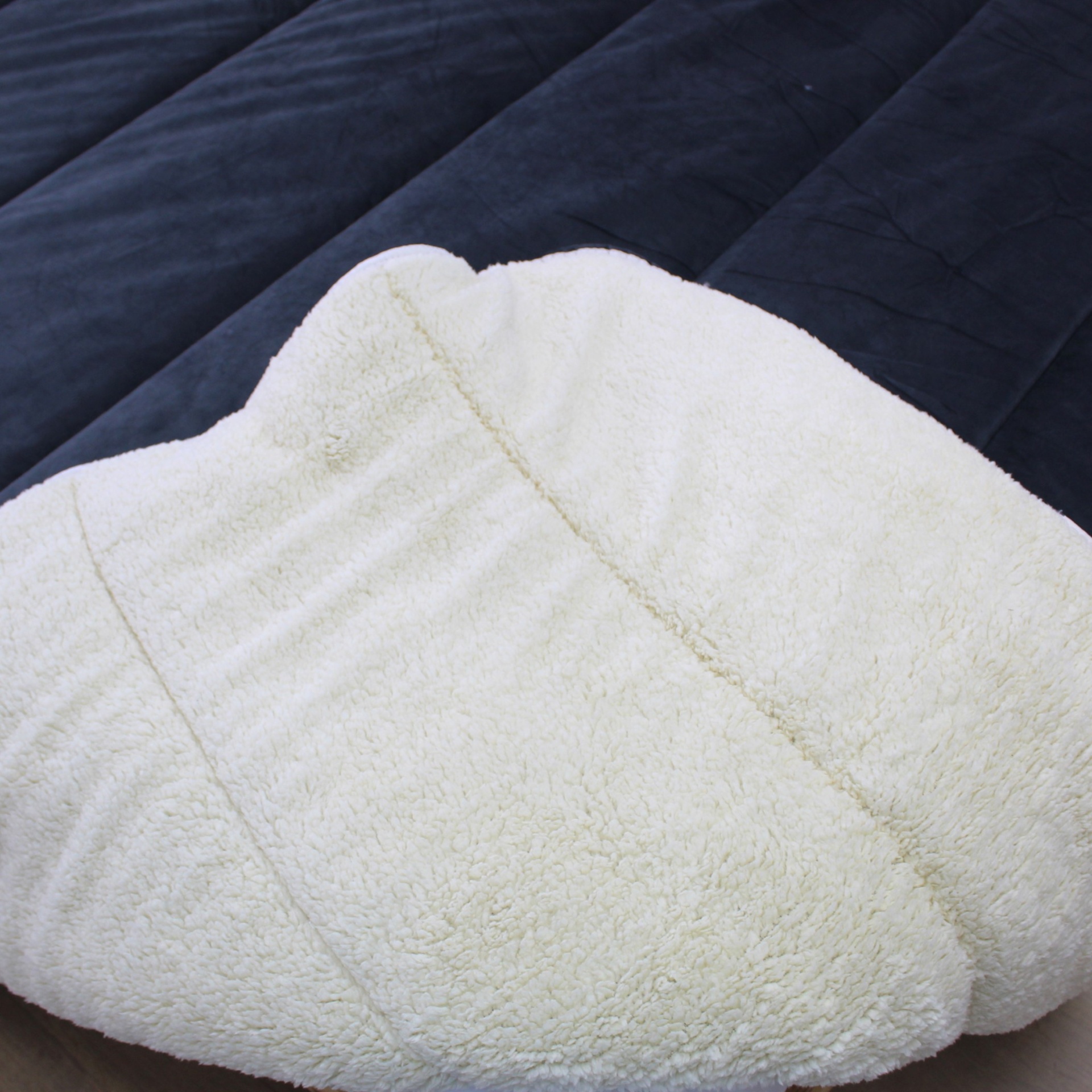 Edredão que possui no exterior veludo para deixar a sua cama mais confortável e no interior têm duas opções: pelo de borrego ou tecido branco.