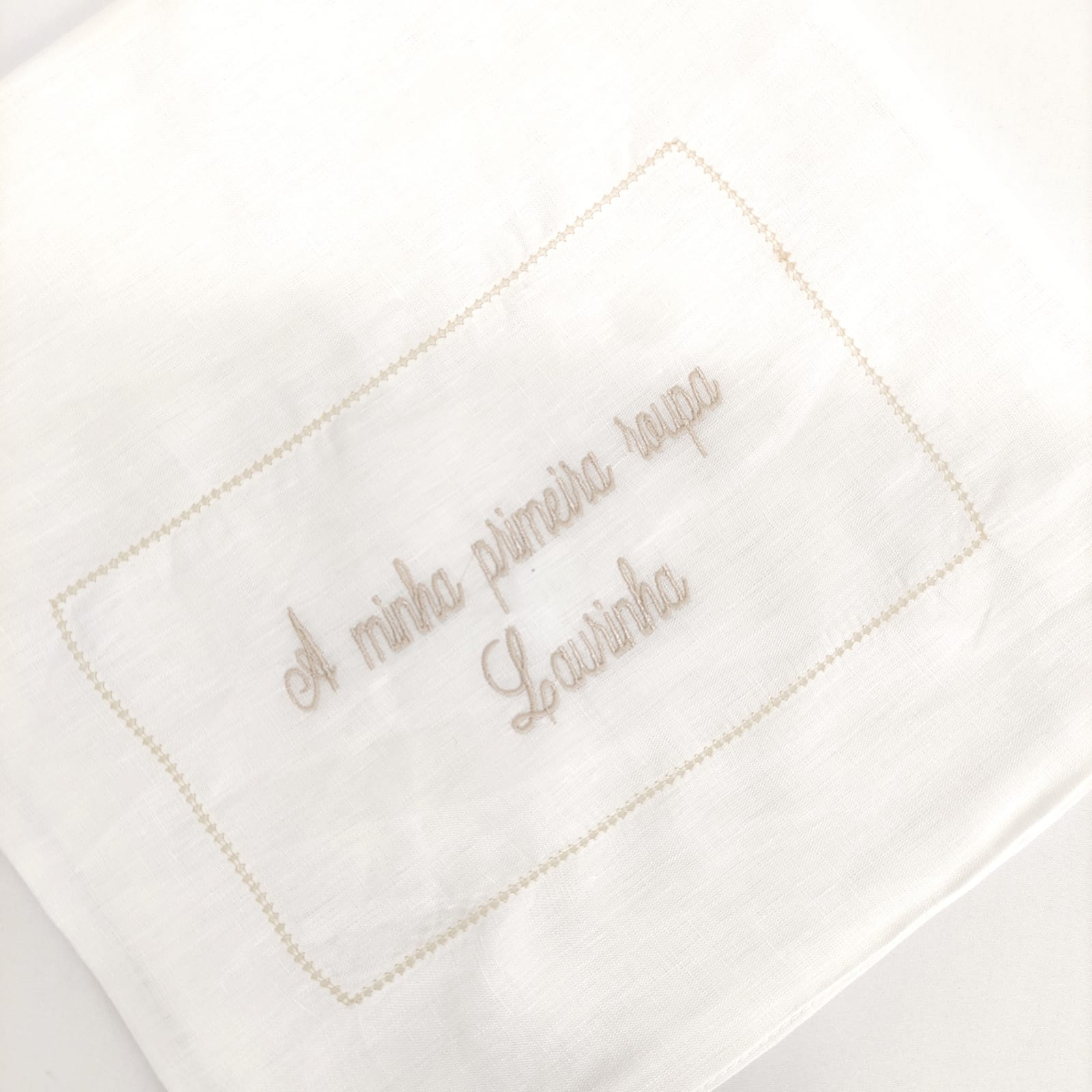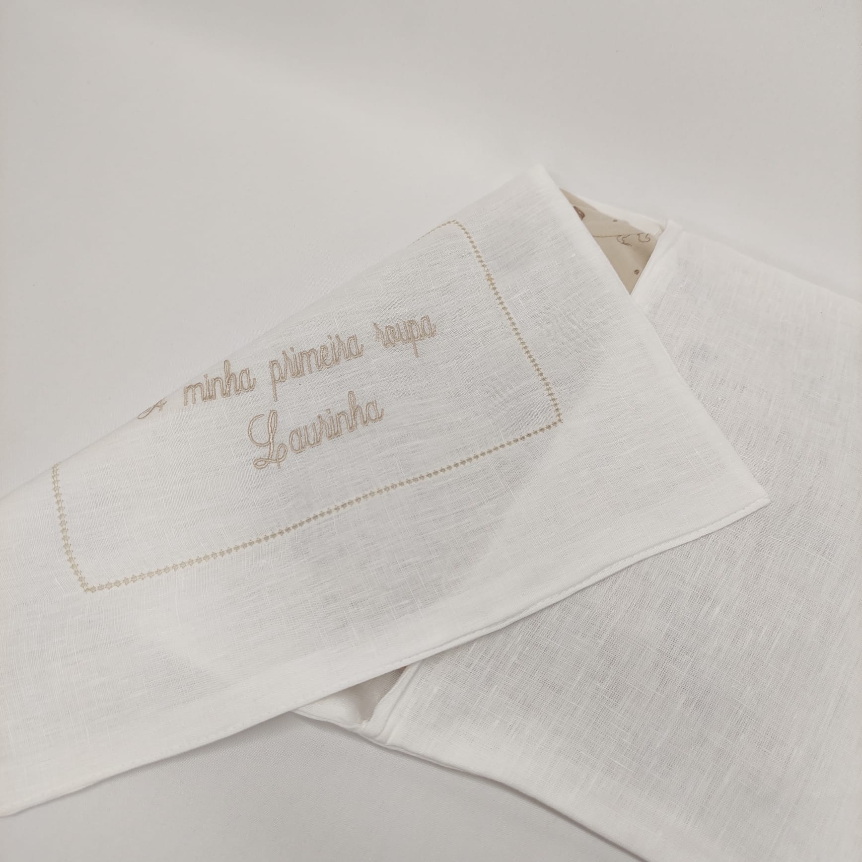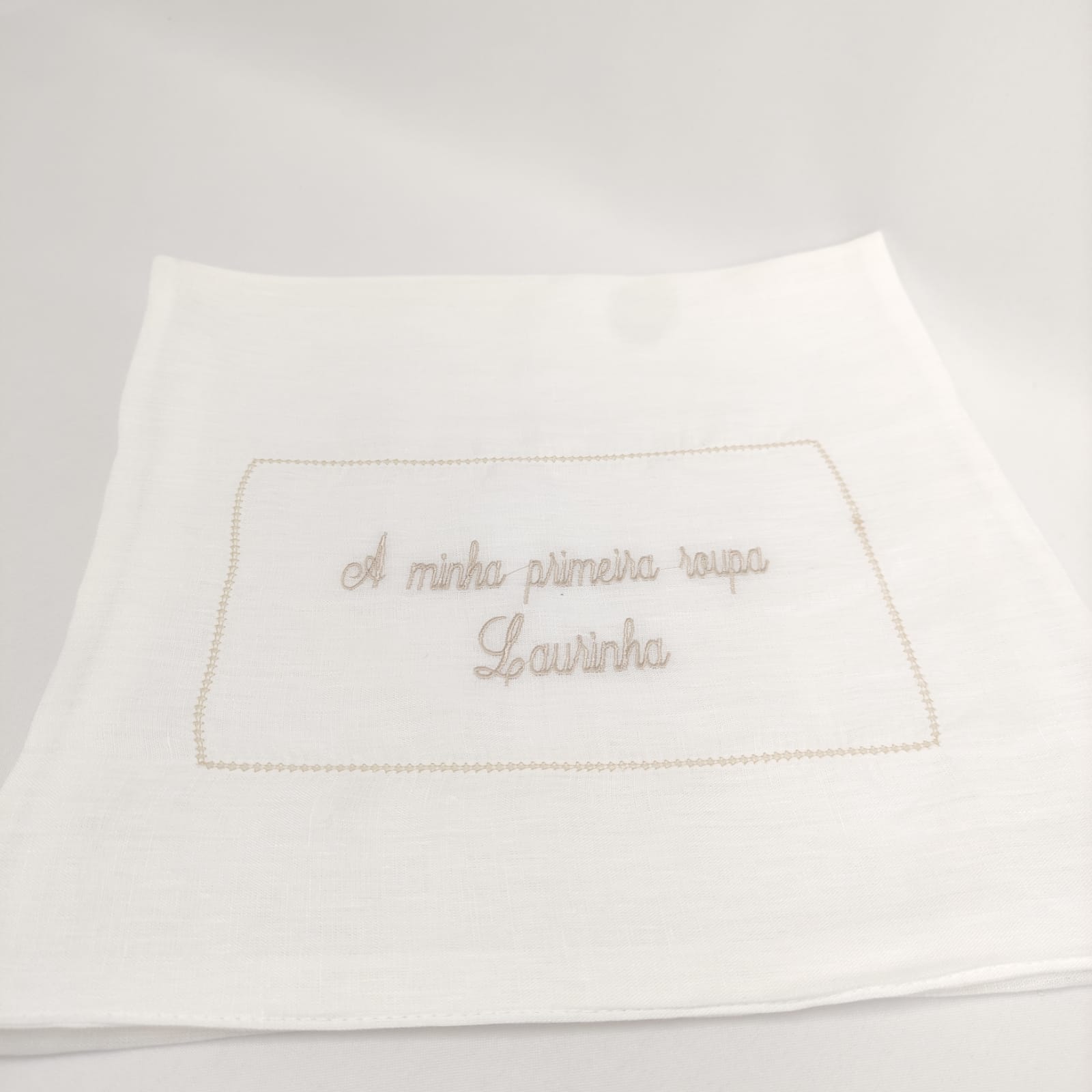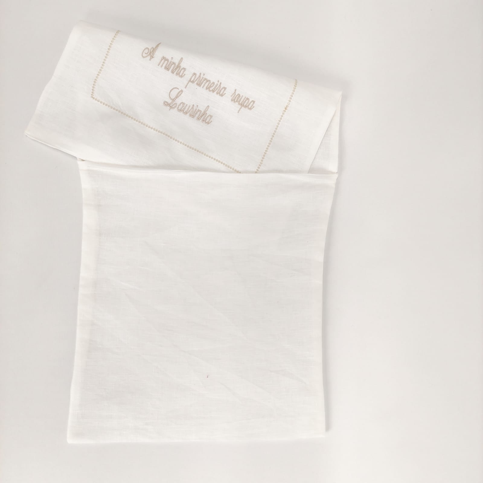 Saco em forma de envelope bordado para guardar a primeira roupa do bebé. Modelo em linho com detalhe em ponto aberto e bordado.