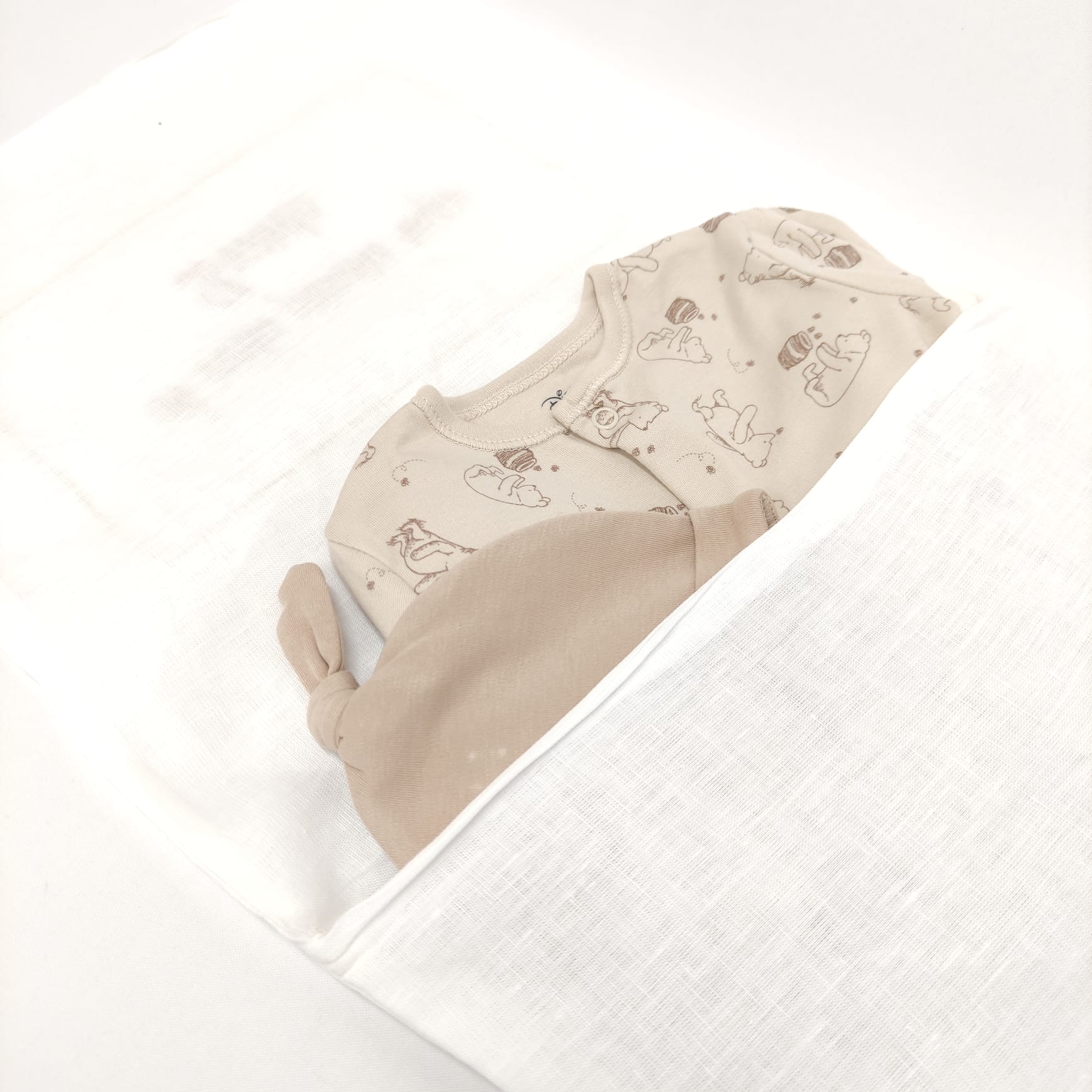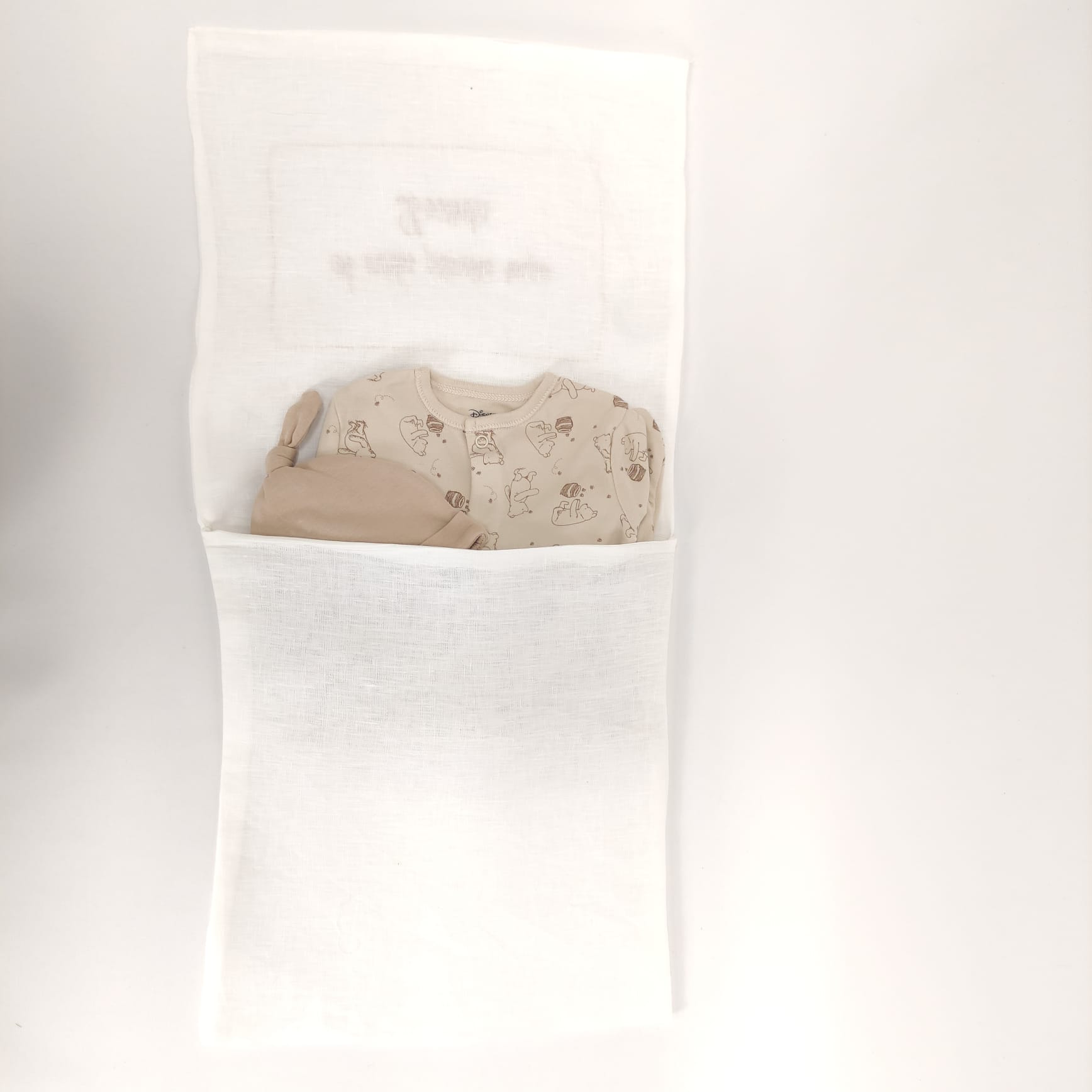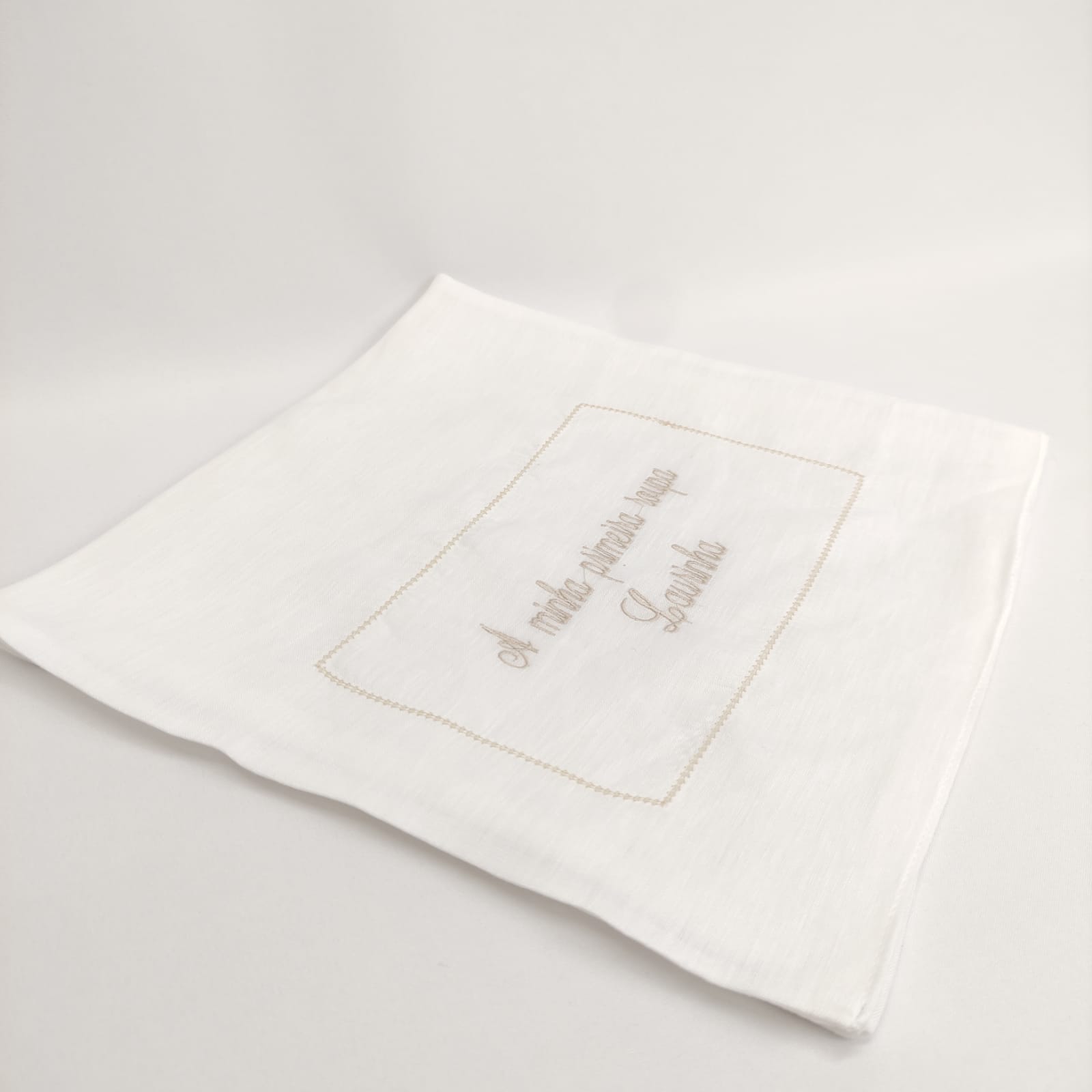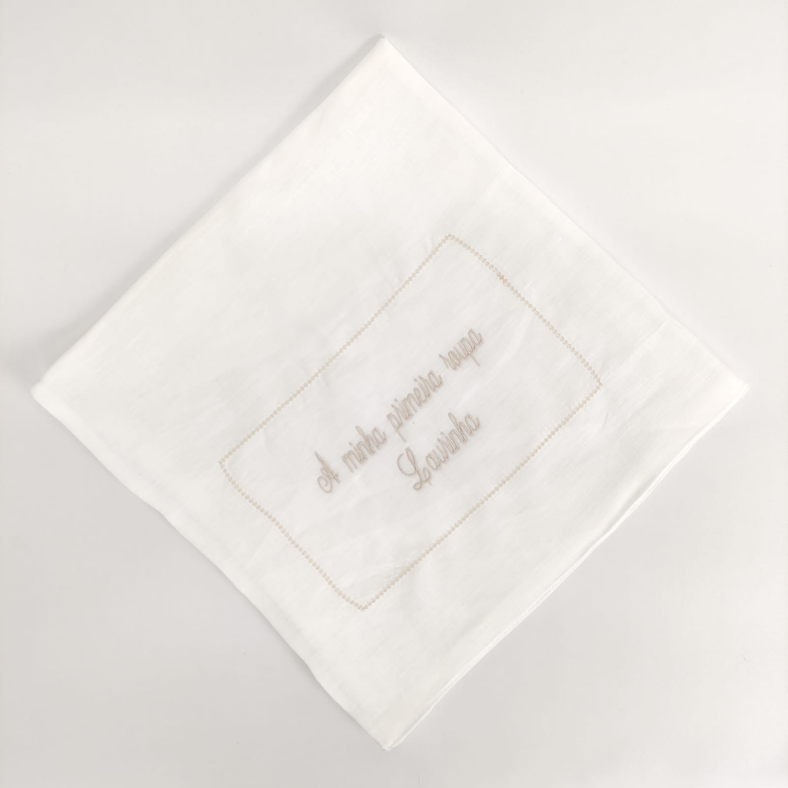 Saco em forma de envelope bordado para guardar a primeira roupa do bebé. Modelo em linho com detalhe em ponto aberto e bordado.