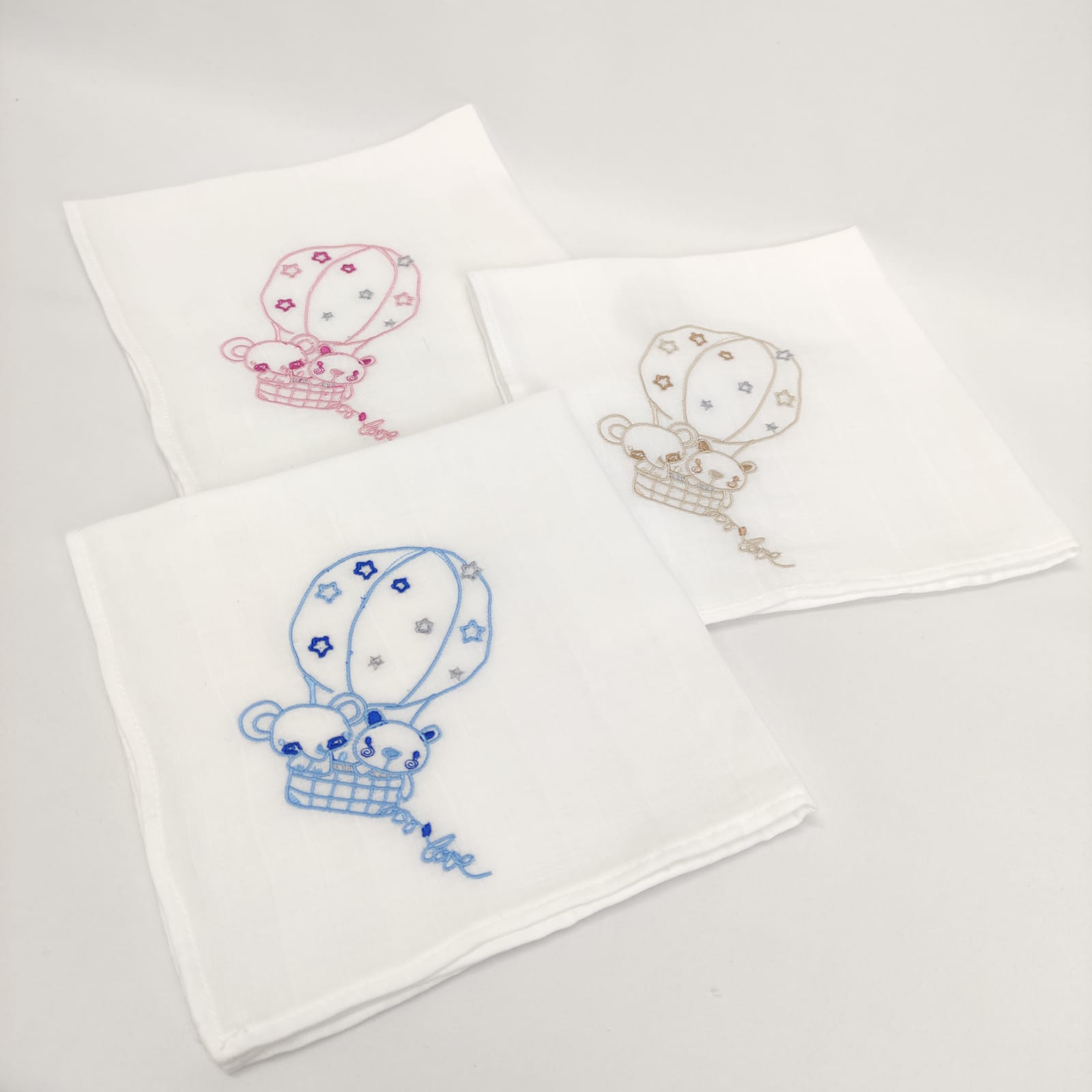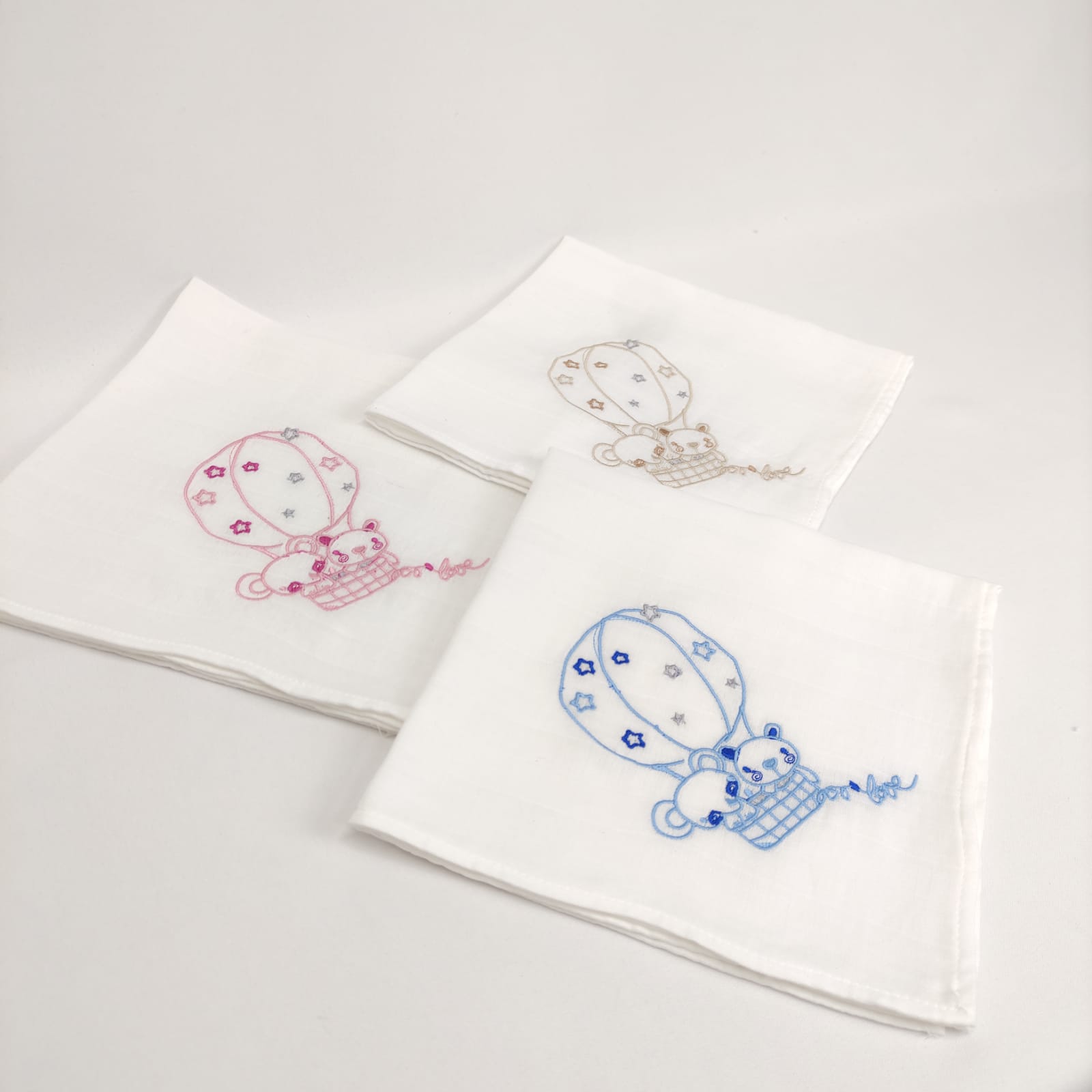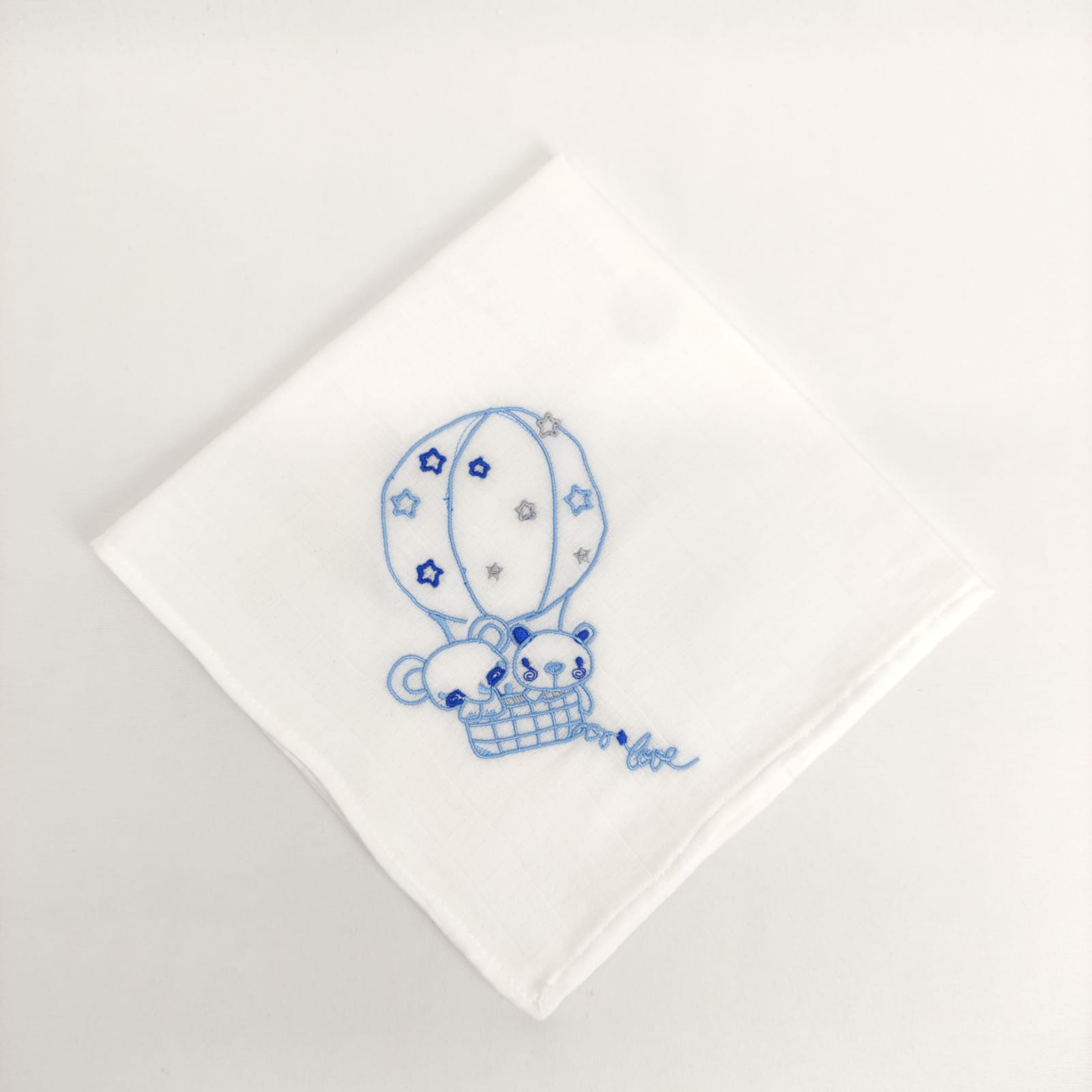 Fralda em algodão com bordado infantil "balões". Disponível em azul, bege e rosa.