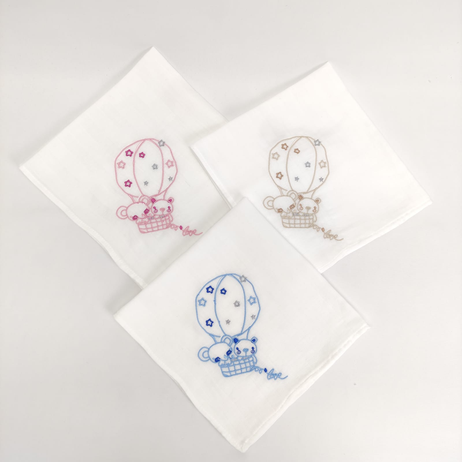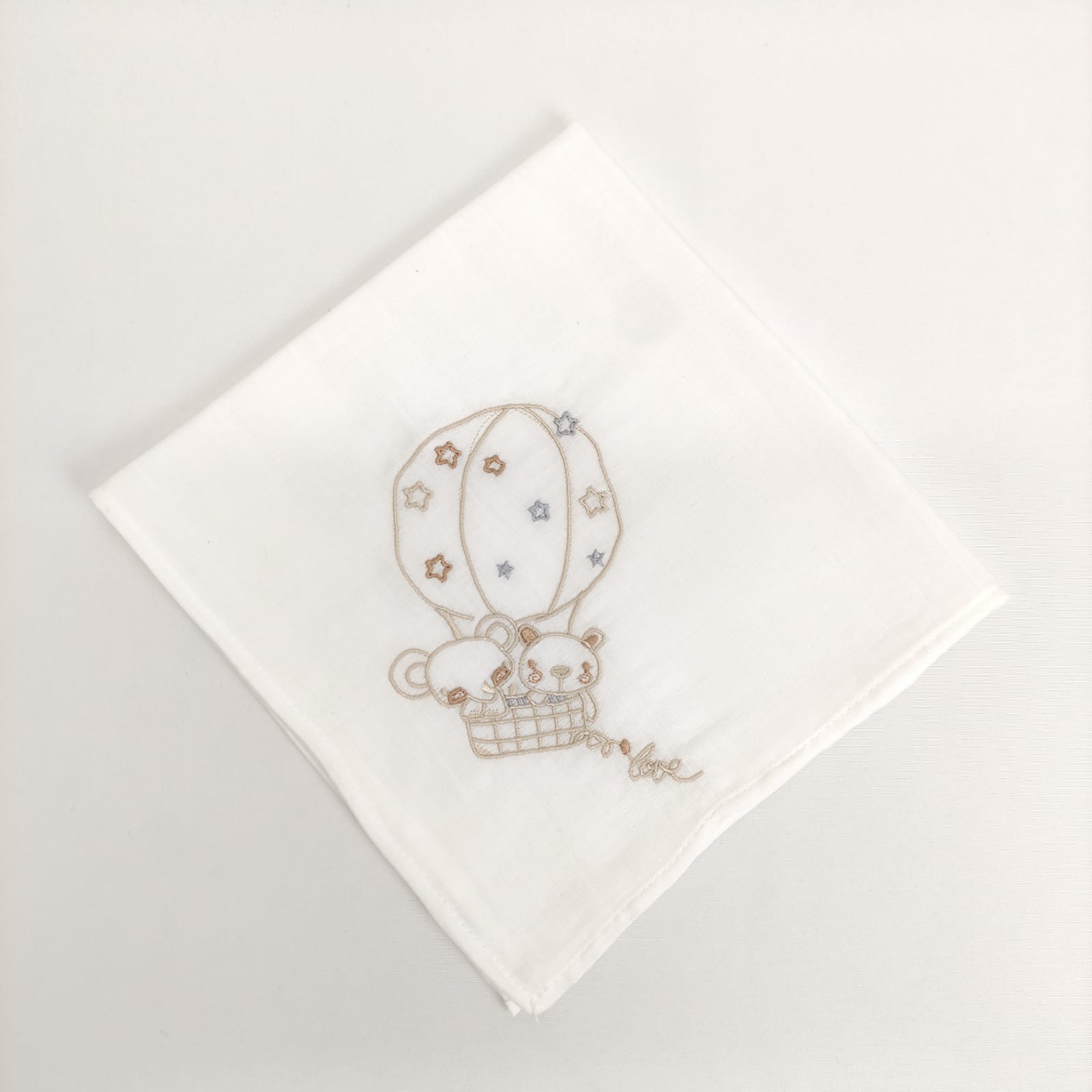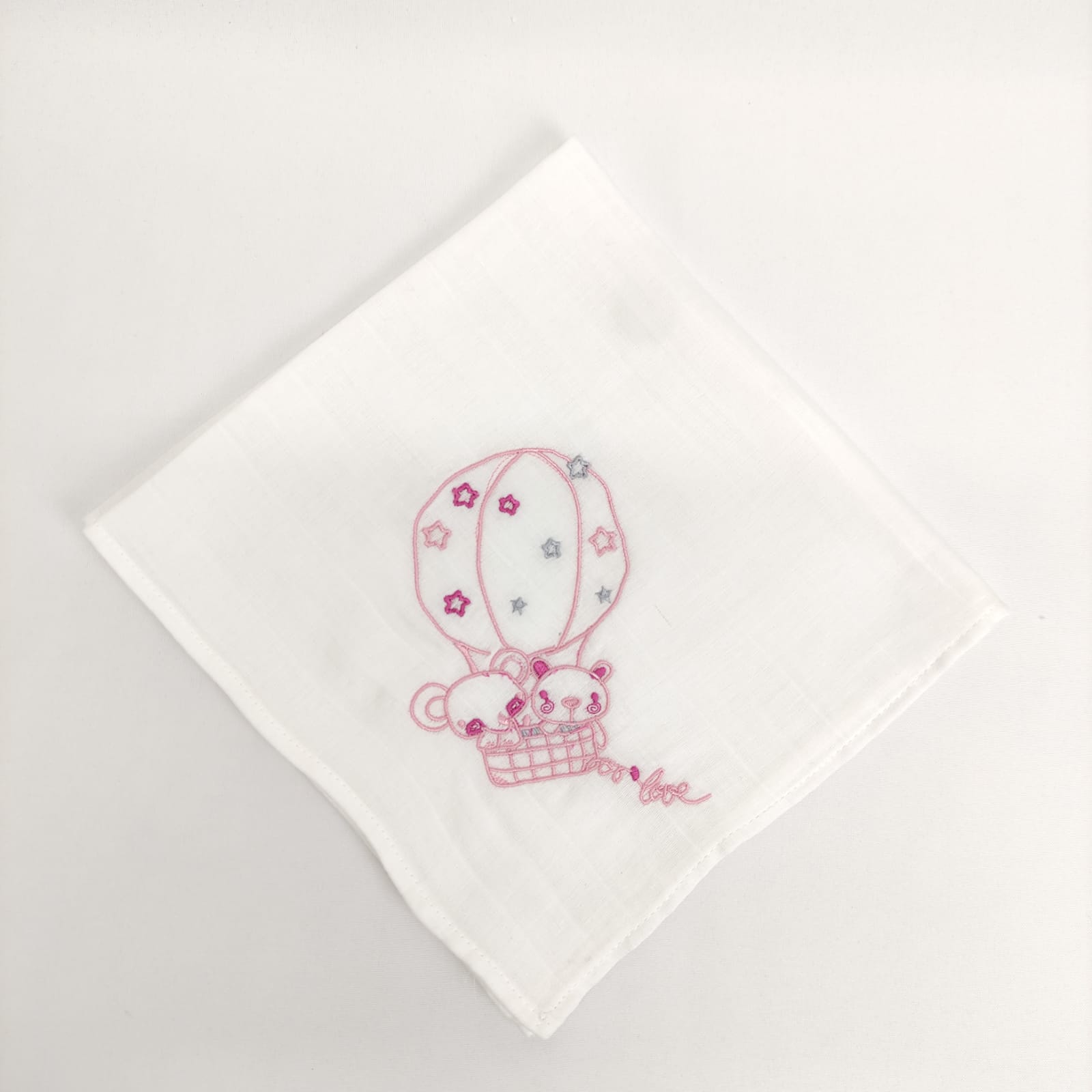 Fralda em algodão com bordado infantil "balões". Disponível em azul, bege e rosa.