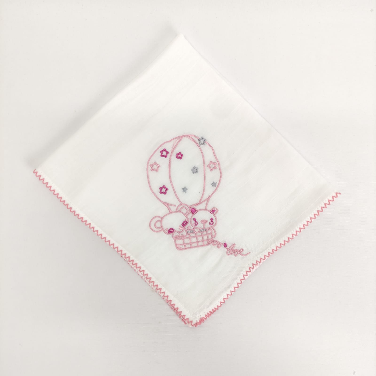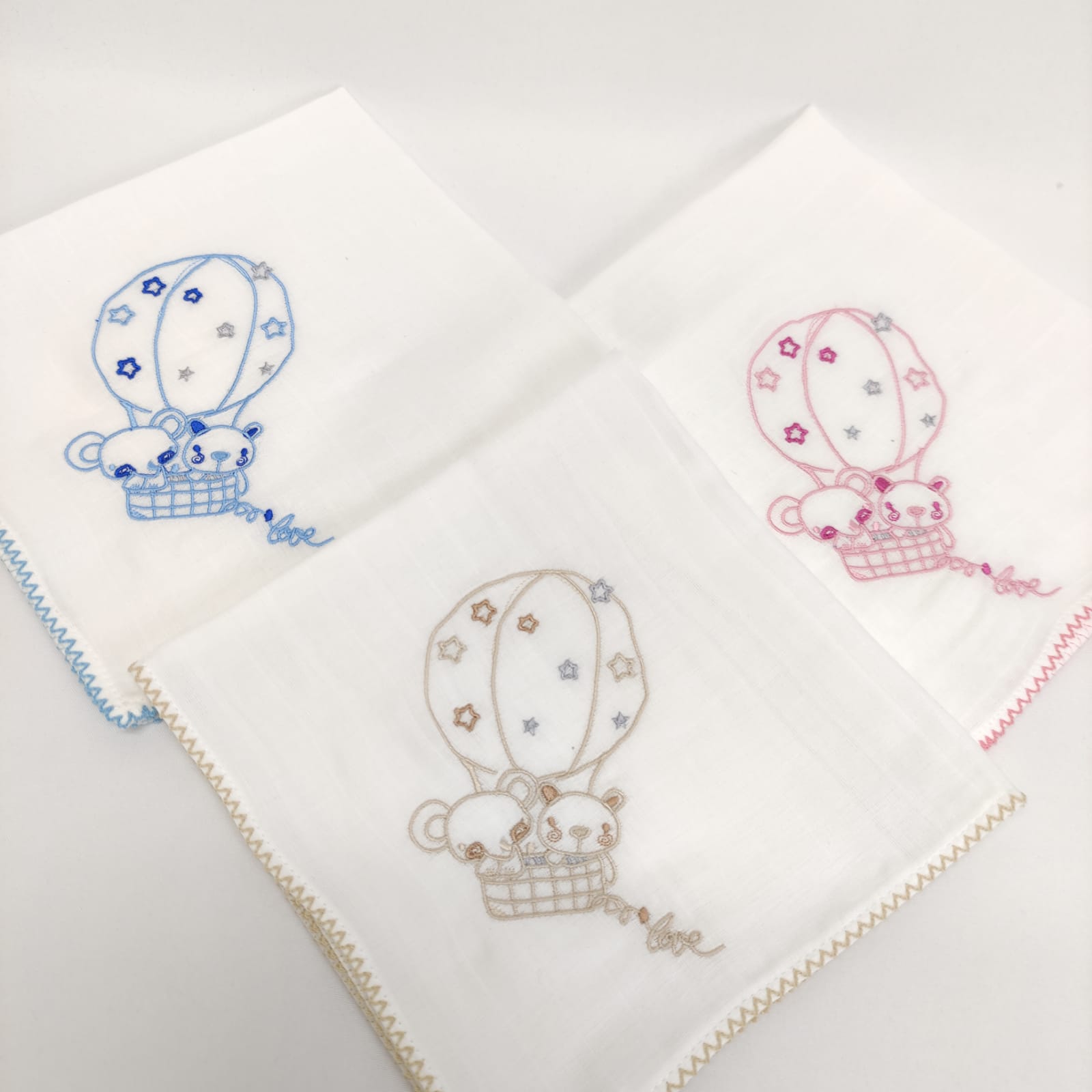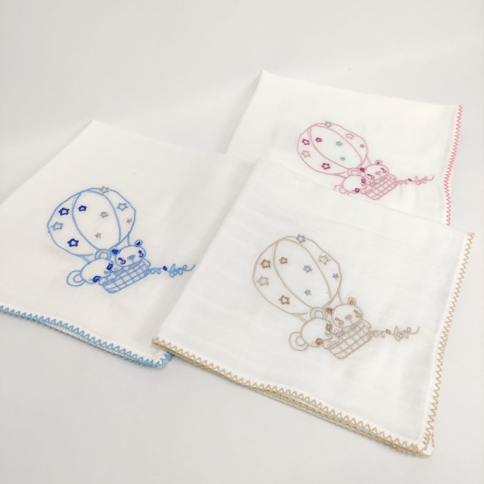 Fralda em algodão com acabamento em beijinho e bordado infantil de "balões" Acabamento e bordado disponíveis em azul, bege e rosa.