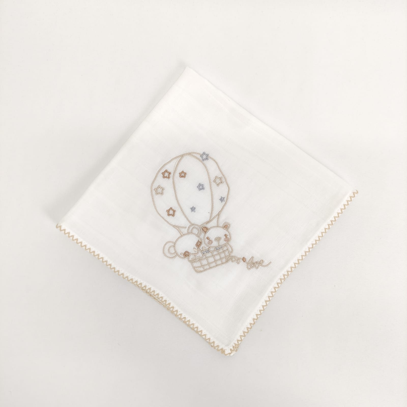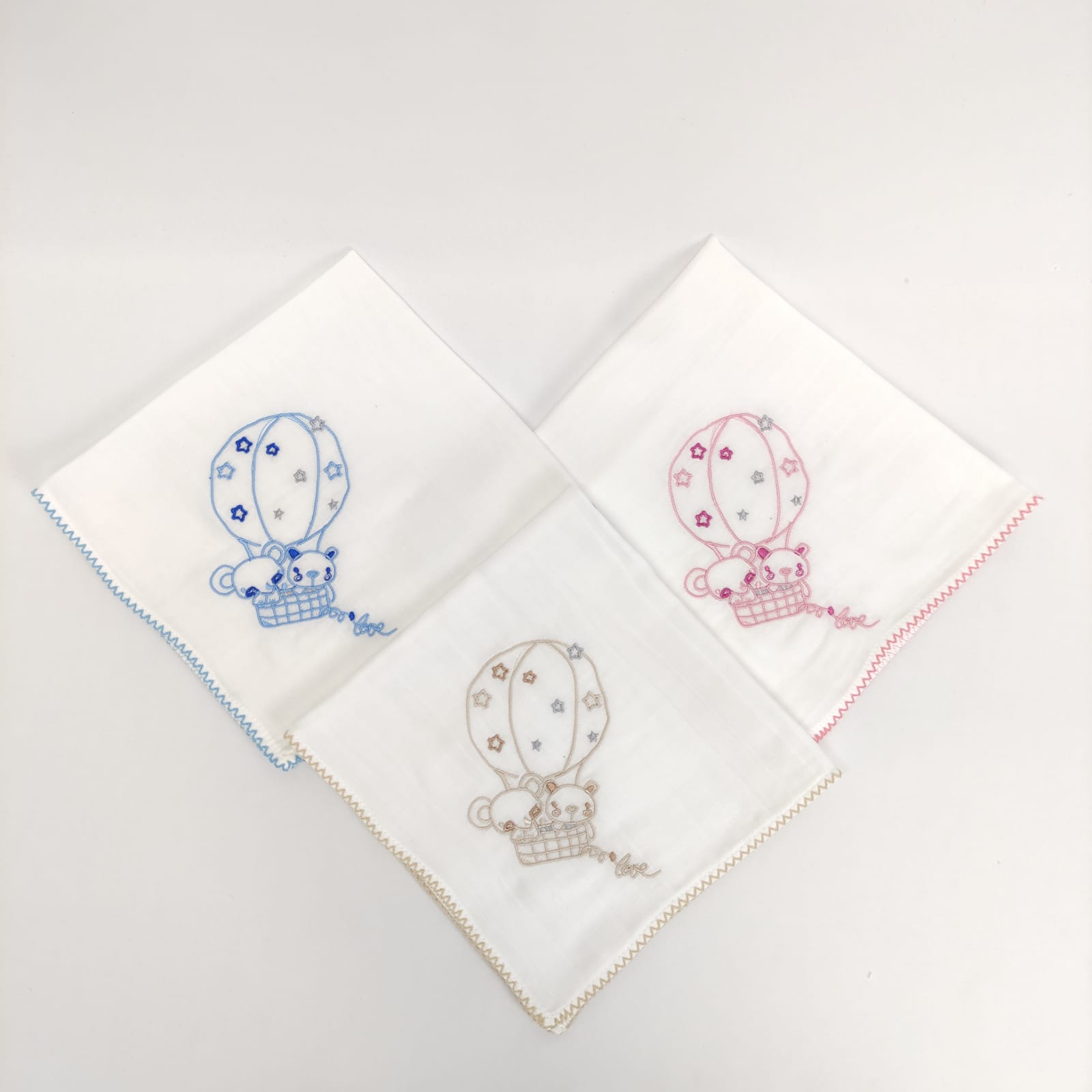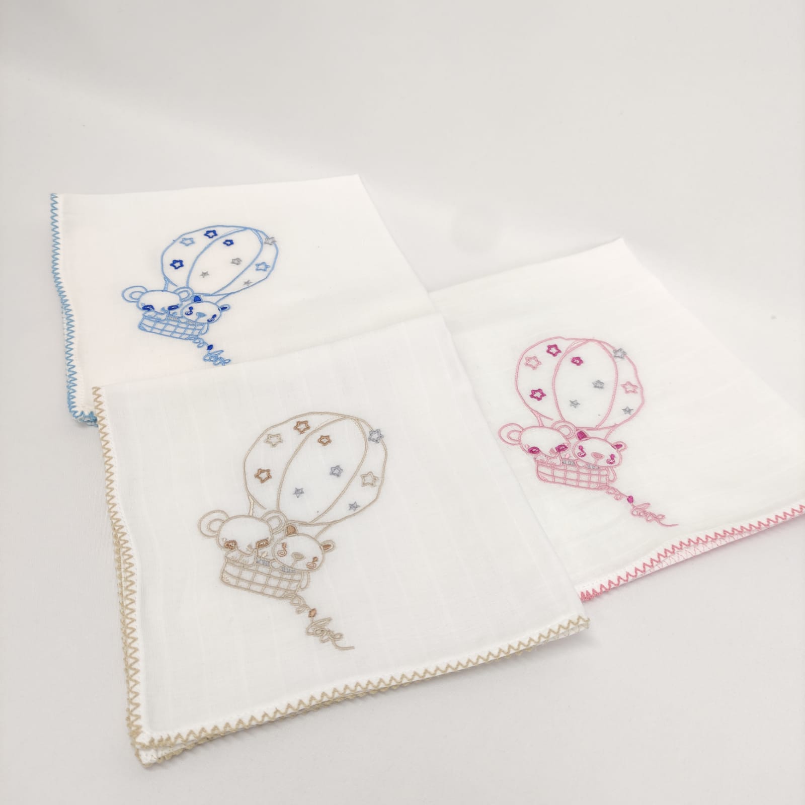Fralda em algodão com acabamento em beijinho e bordado infantil de "balões" Acabamento e bordado disponíveis em azul, bege e rosa.