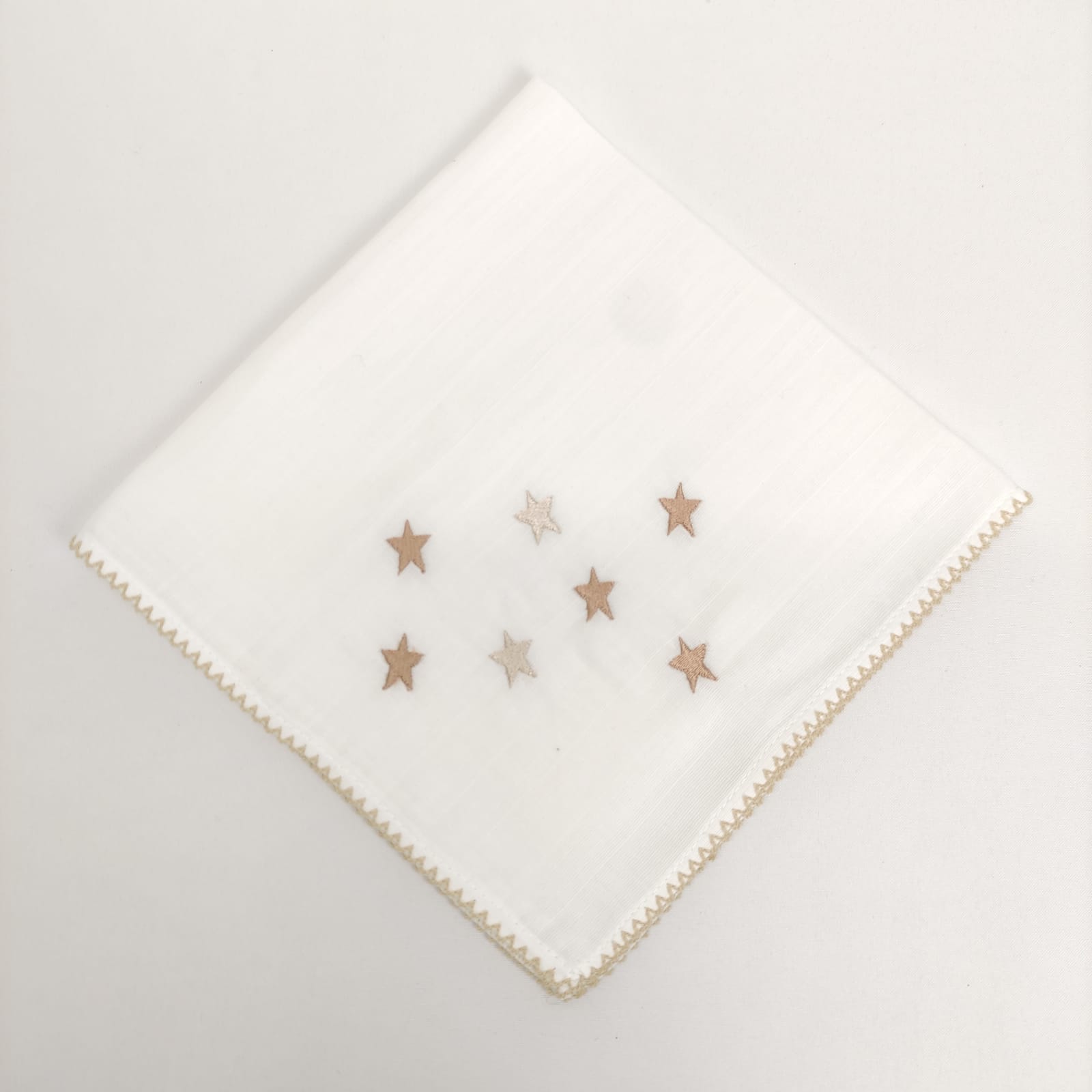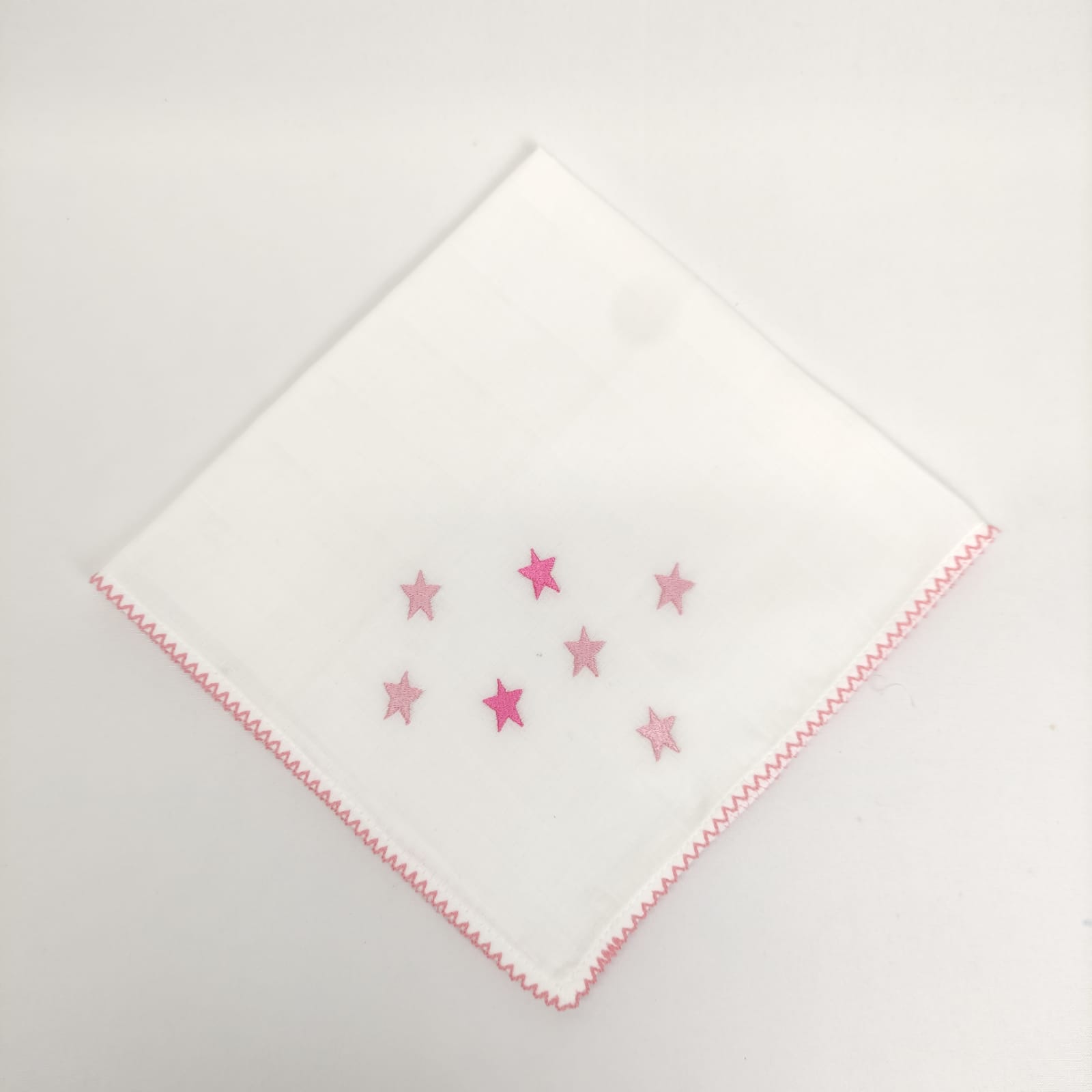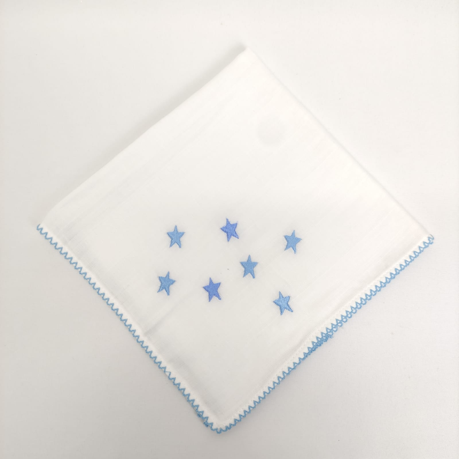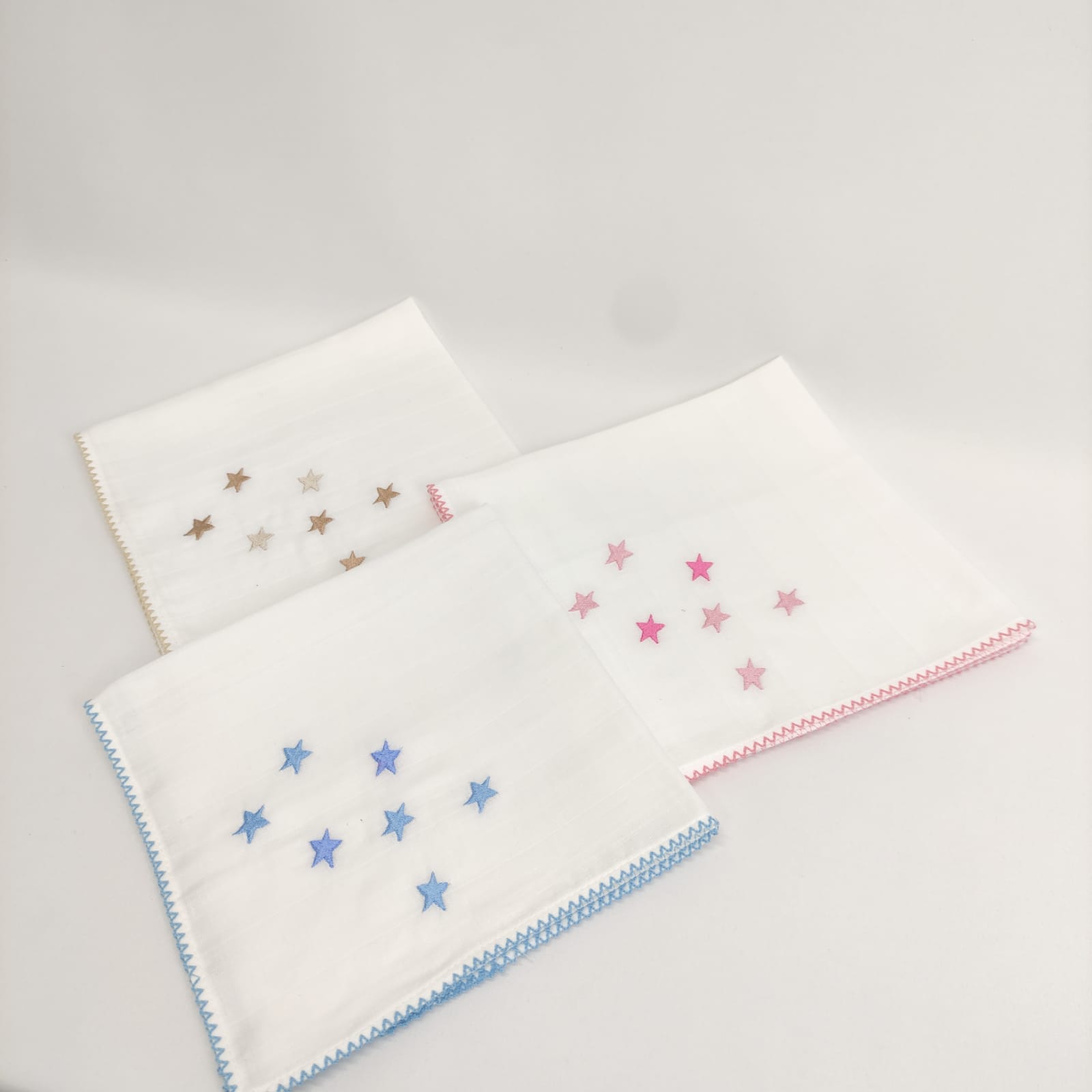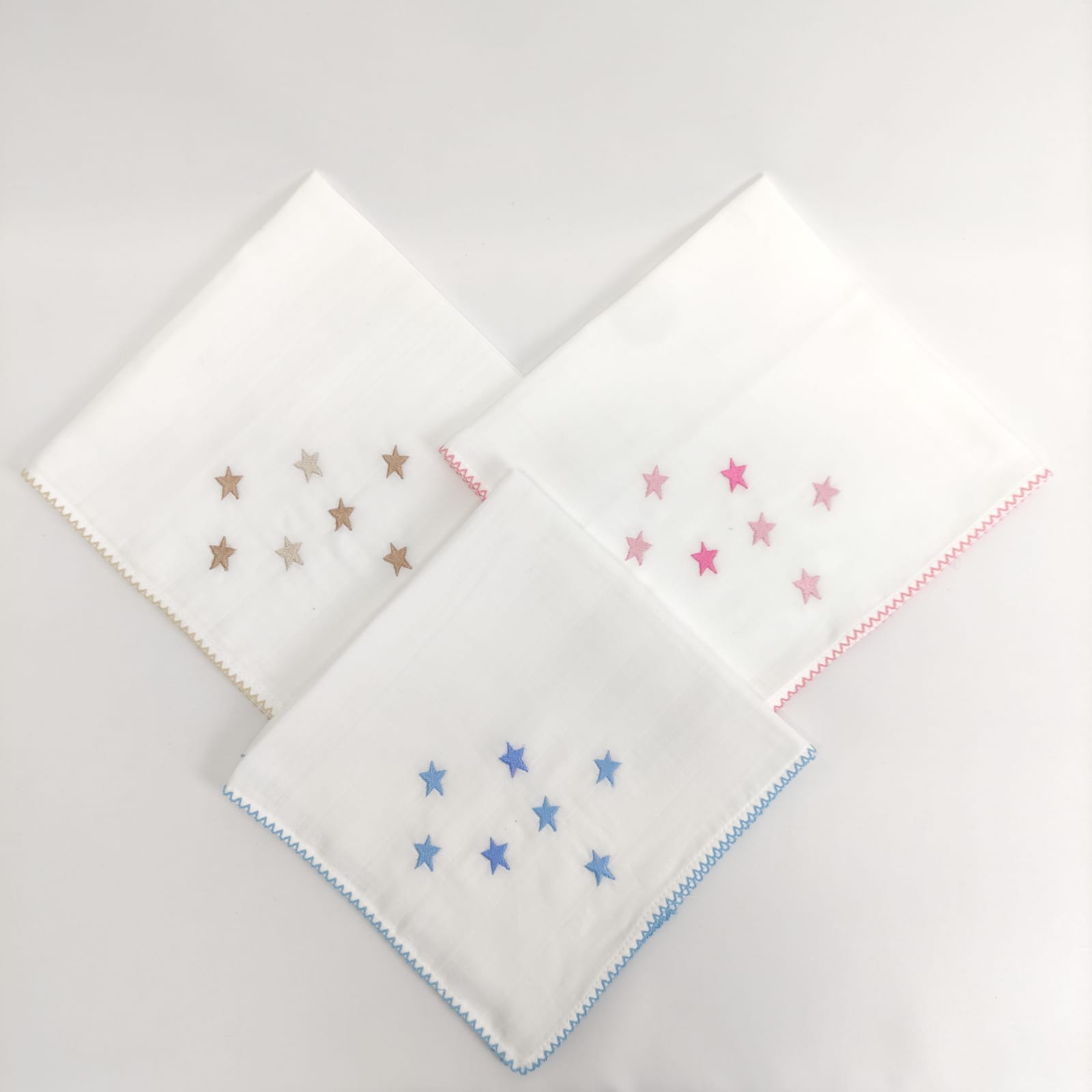 Fralda em algodão com bordado infantil "estrelas" e acabamento em "beijinho". Disponível em azul, bege e rosa.