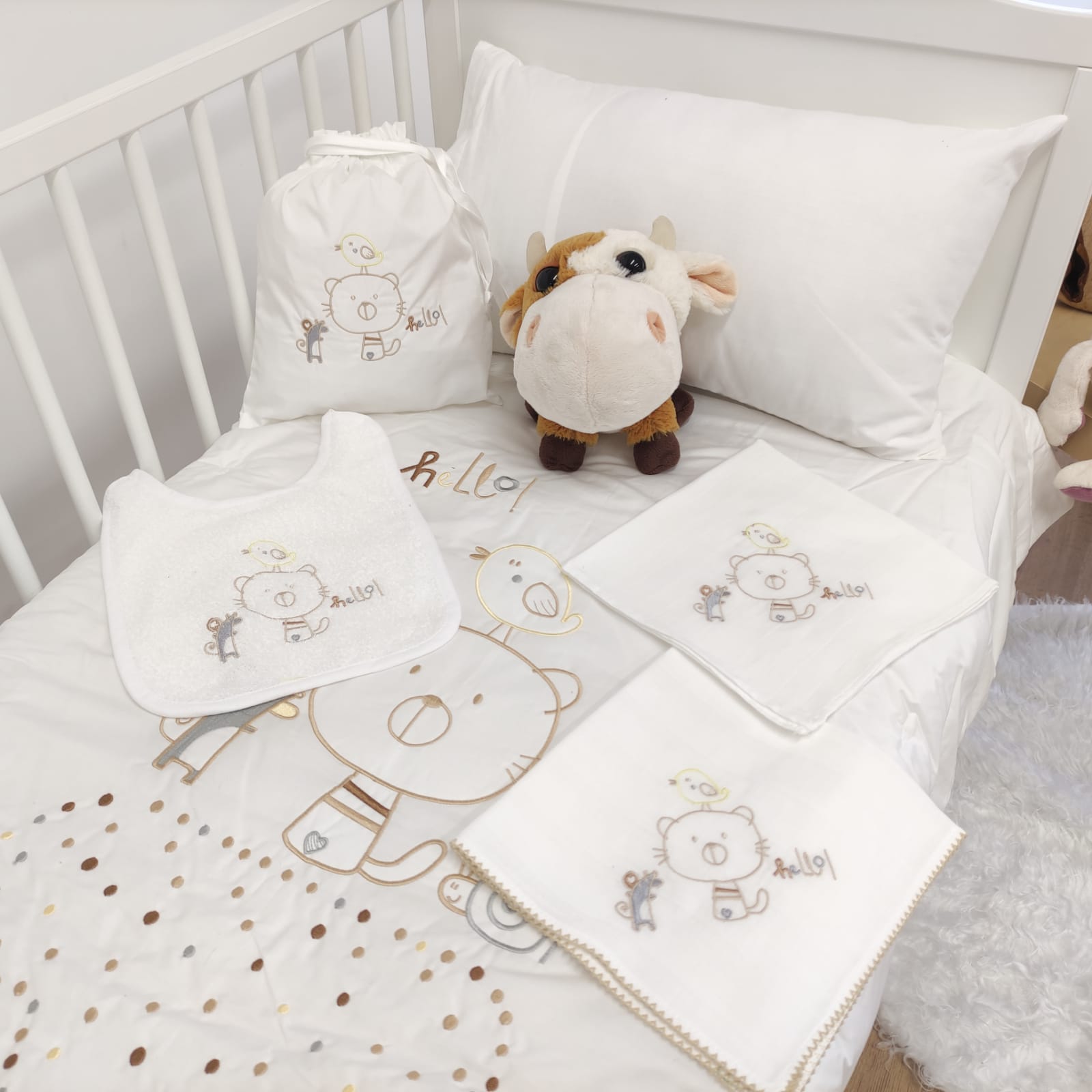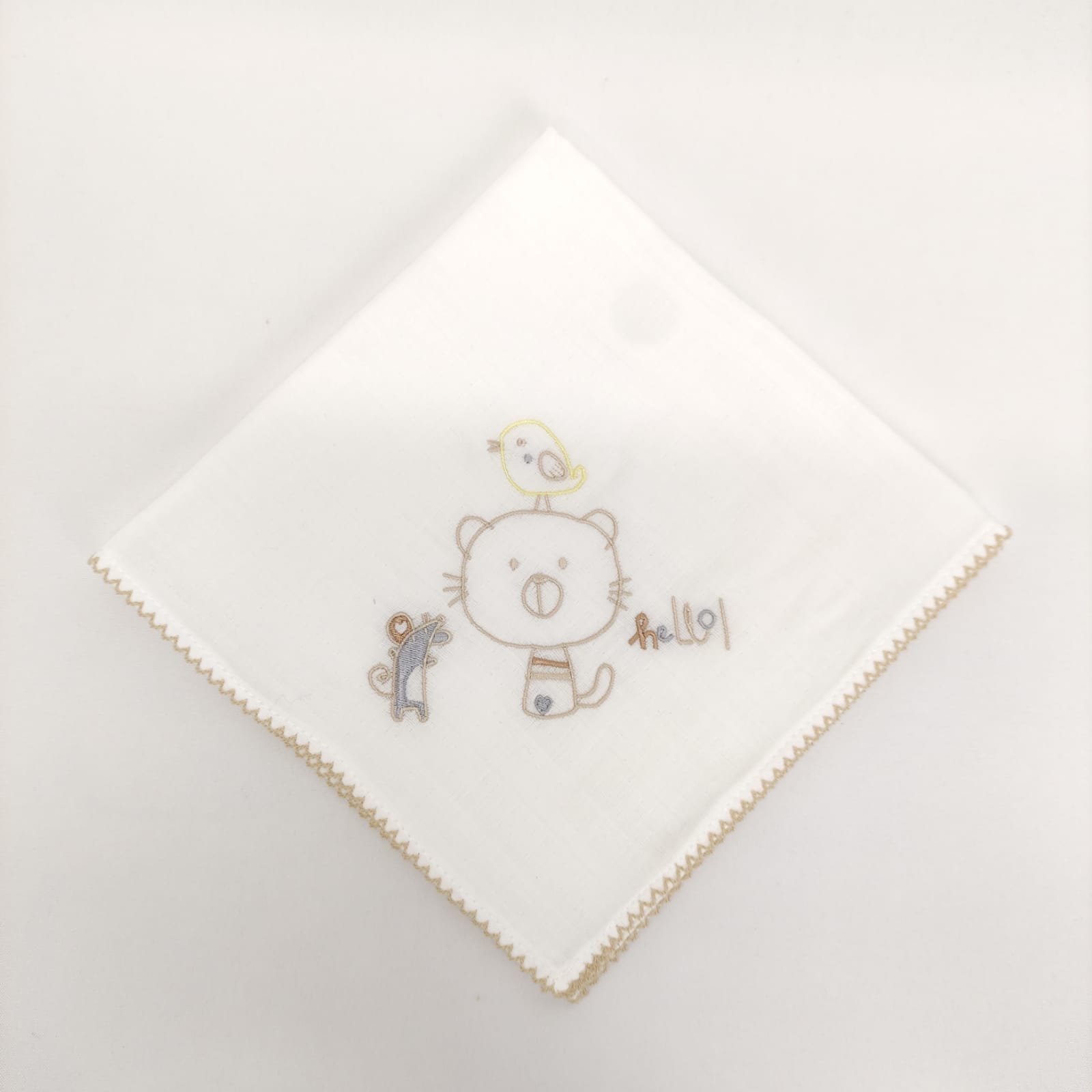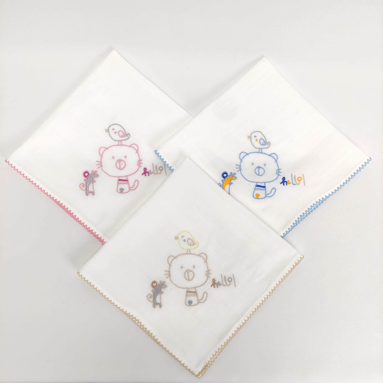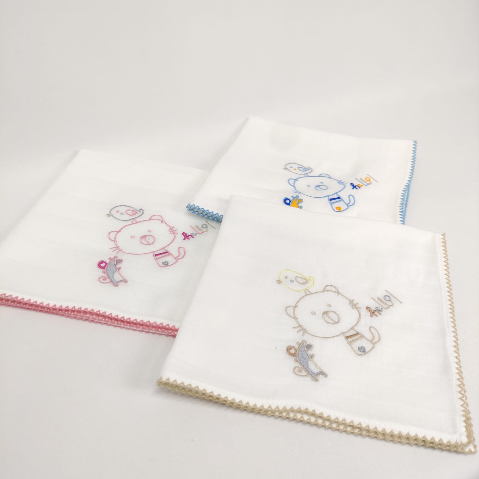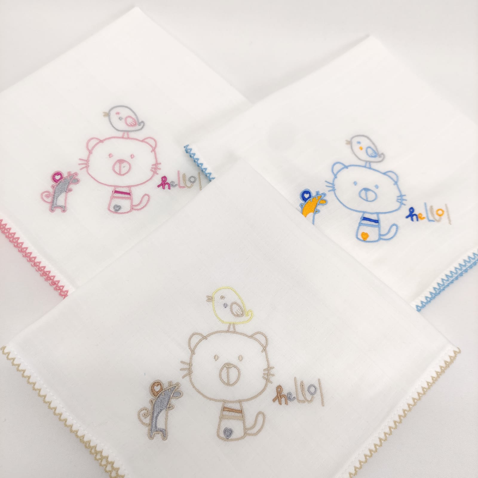 Fralda em algodão com acabamento em beijinho e bordado infantil de "gato" Acabamento e bordado disponíveis em azul, bege e rosa.