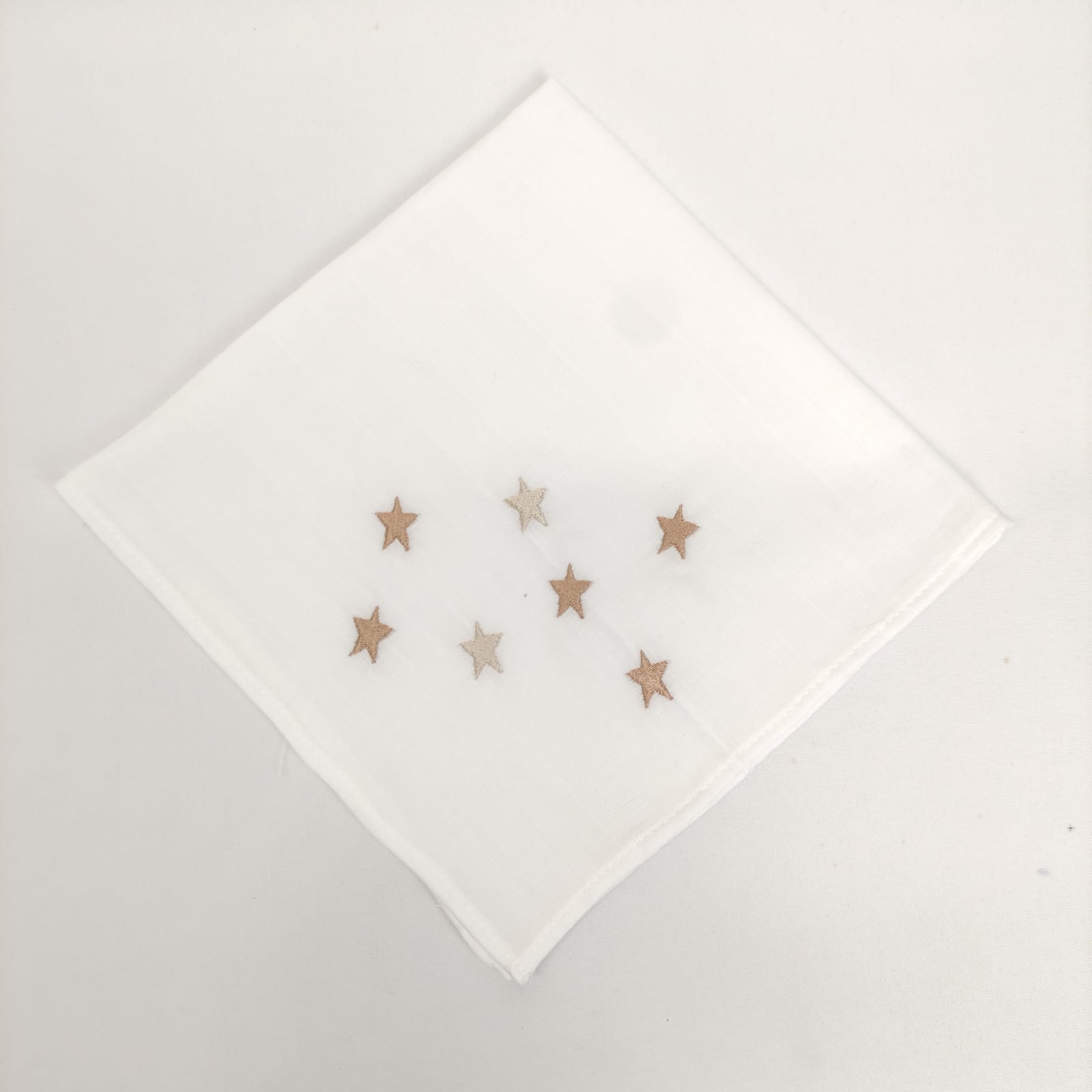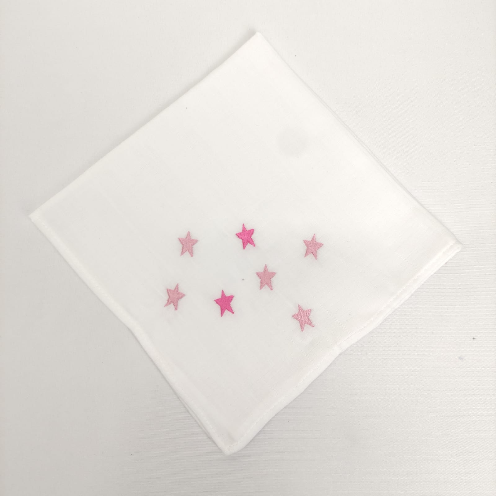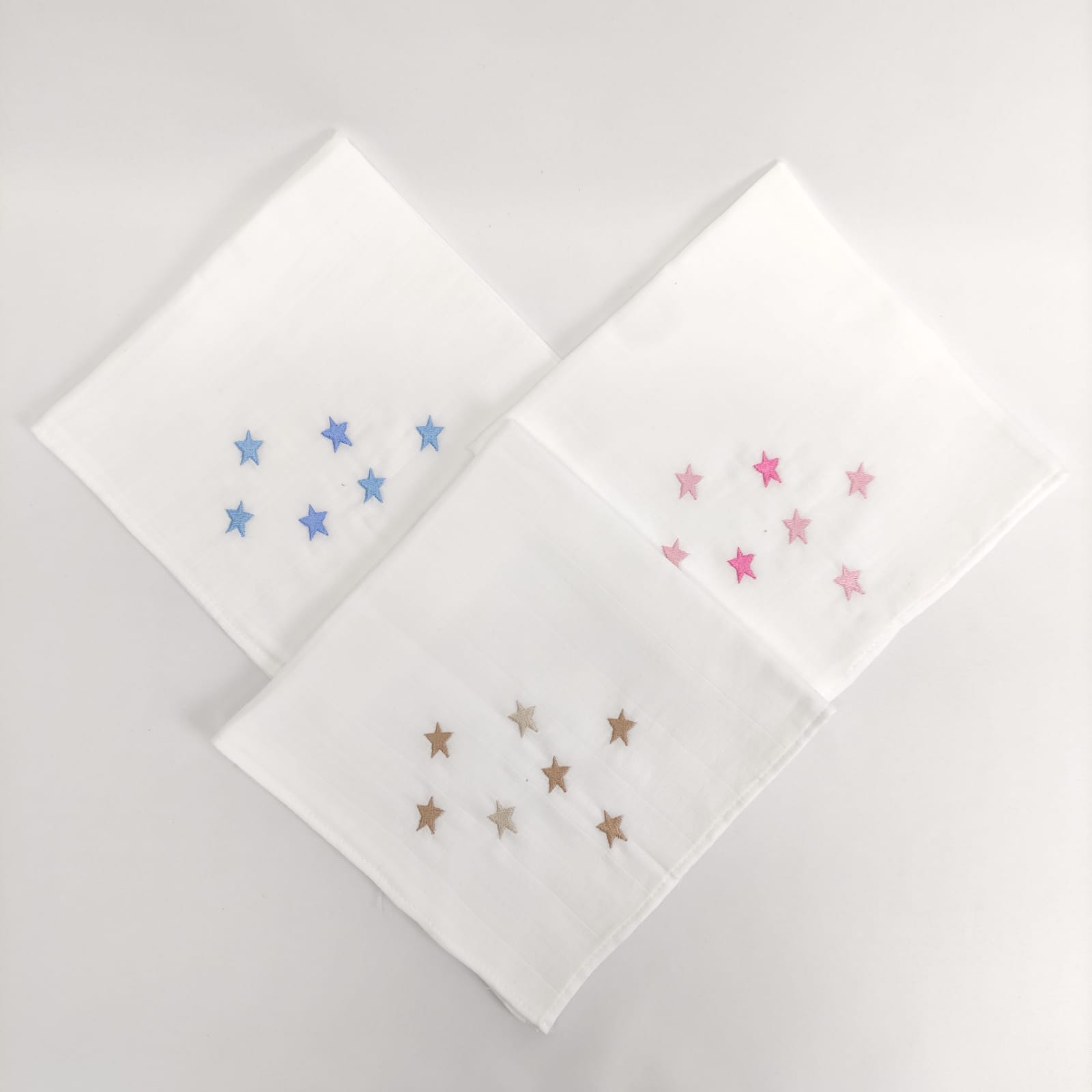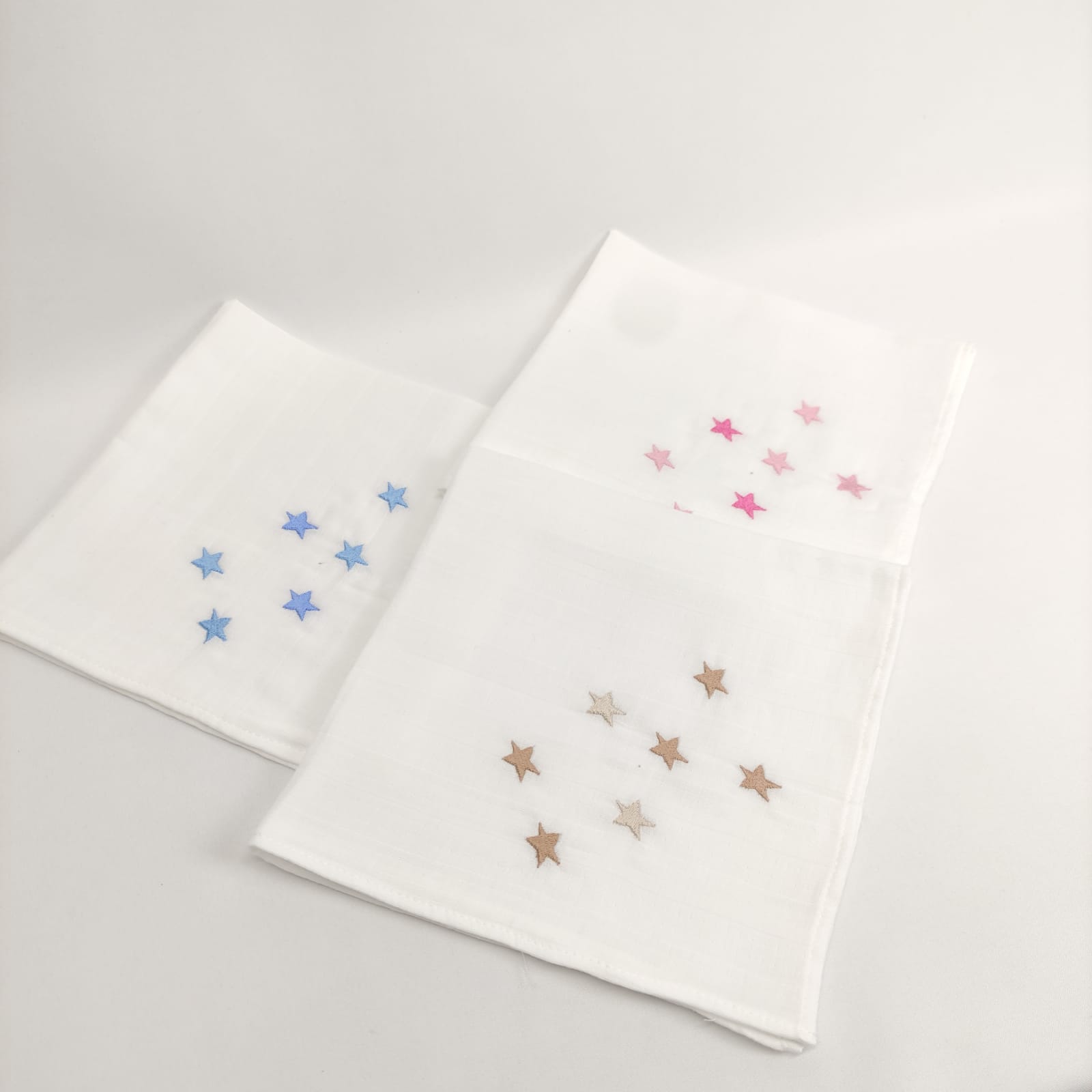 Fralda em algodão com bordado infantil "estrelas". Disponível em azul, bege e rosa.